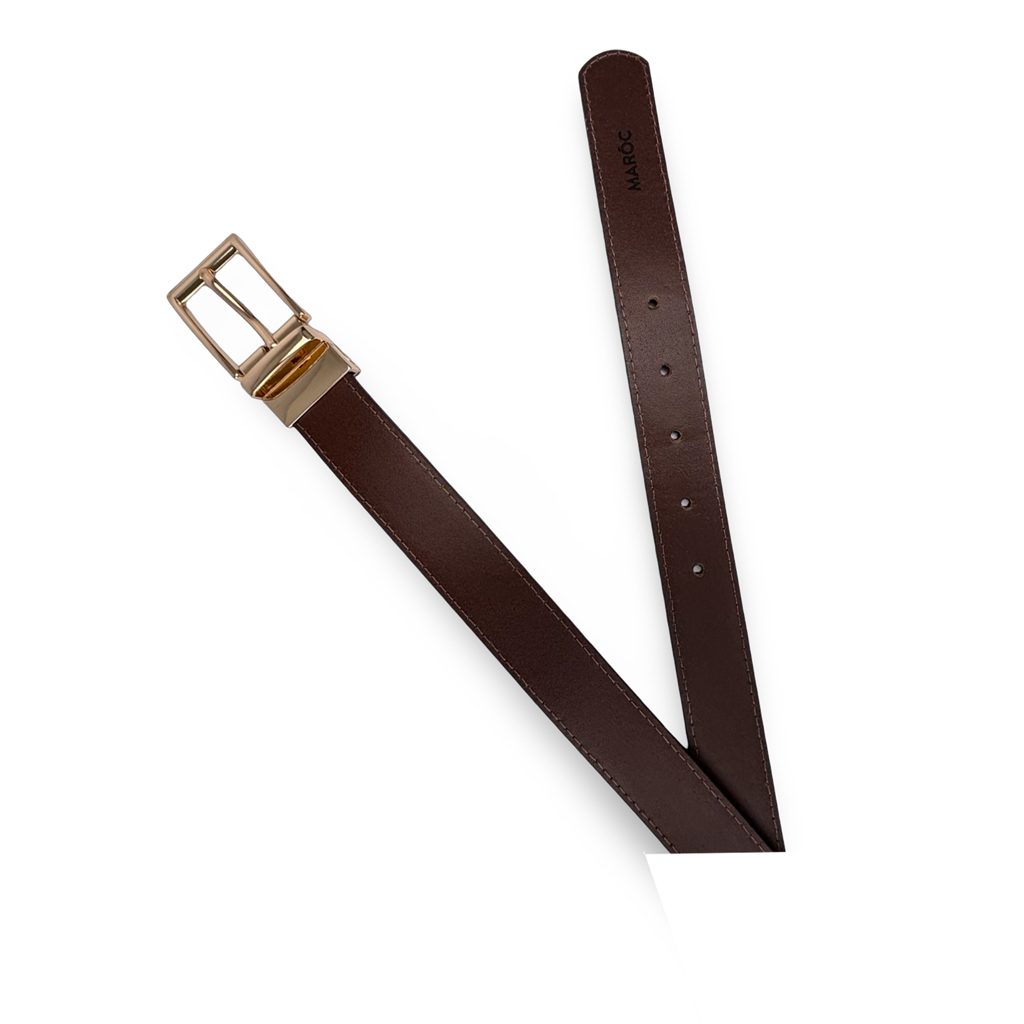 - Tipo: Cinturón para mujer con hebilla reversible, lo puedes usar en su tono miel o en su tono negro ambos son grabados lisos, detalle de costura en el borde del cinturón logo marca Maróc en la punta de la correa