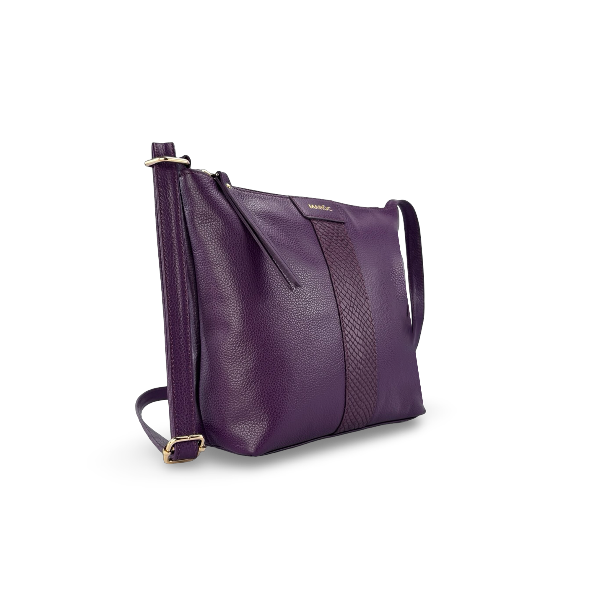 Bolso manos libres para mujer de diseño espacioso y elegante, elaborado en cuero vacuno grabado y liso que combina textura y estilo. Su interior amplio permite guardar una tablet de hasta 13’’, junto con compartimentos internos y externos que facilitan la organización diaria. El cierre en cremallera brinda seguridad, mientras que la bandolera ajustable ofrece comodidad y libertad de movimiento. Una pieza versátil y funcional que equilibra sofisticación y practicidad.