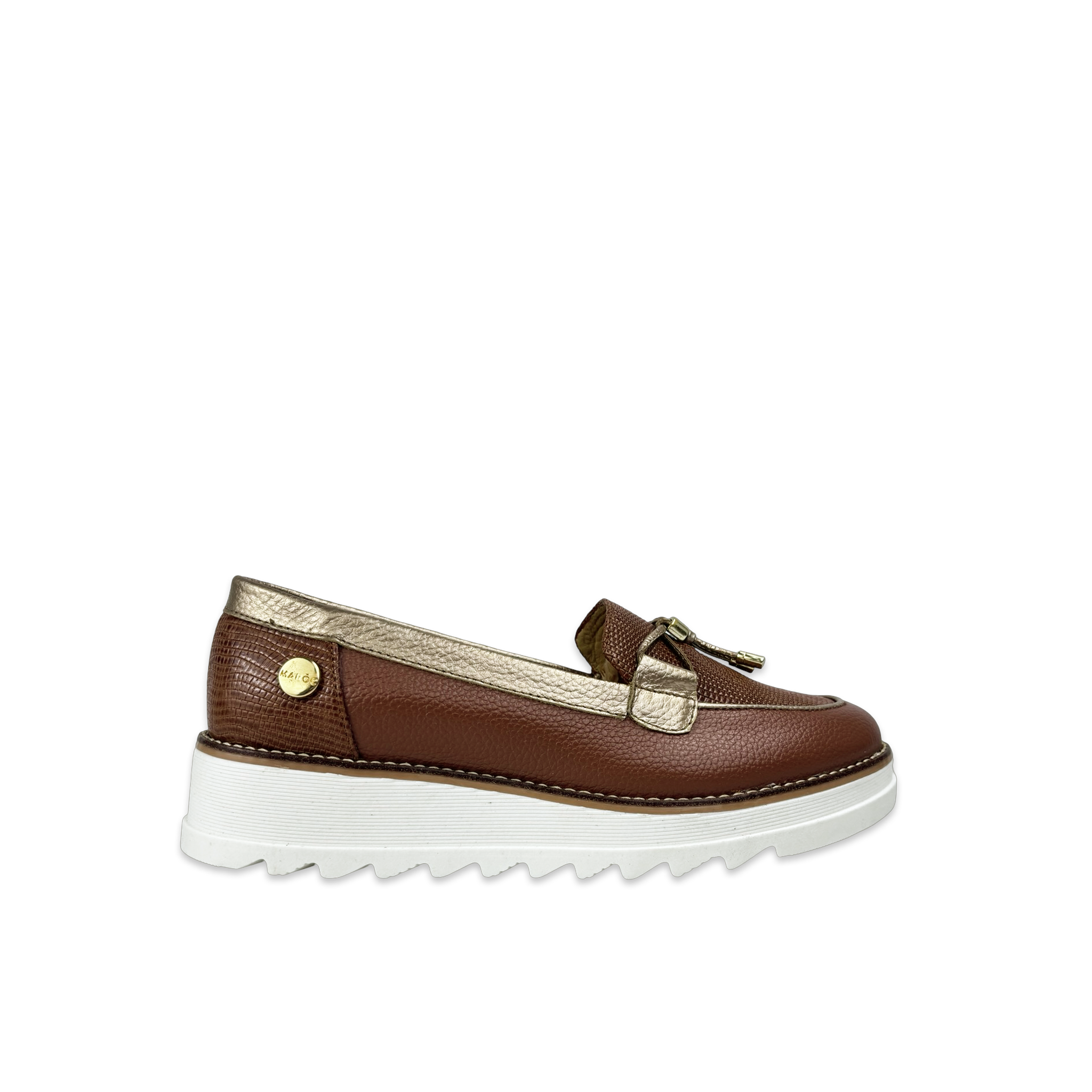 Mocasín para mujer elaborado en cuero vacuno liso y metalizado, con borlas decorativas en la parte frontal y elegante aplique metálico dorado logo Maroc en los laterales. Su diseño slip-on con punta redonda y tacón bajo de 3.5 cm aproximadamente ofrece comodidad y estilo versátil para combinar en looks casuales. Hecho en Colombia con materiales de alta calidad: forro en cuero y suela en caucho para mayor resistencia y durabilidad.