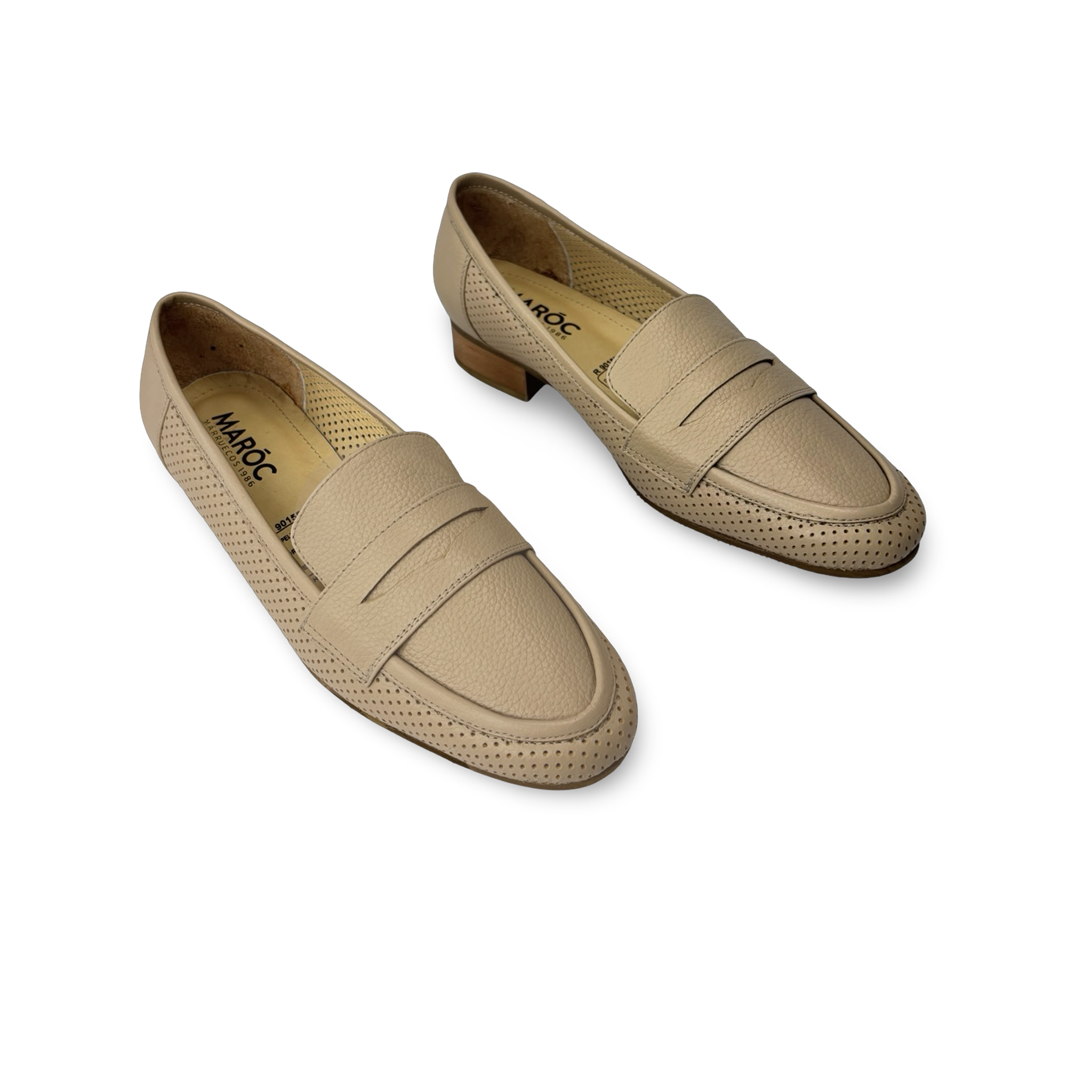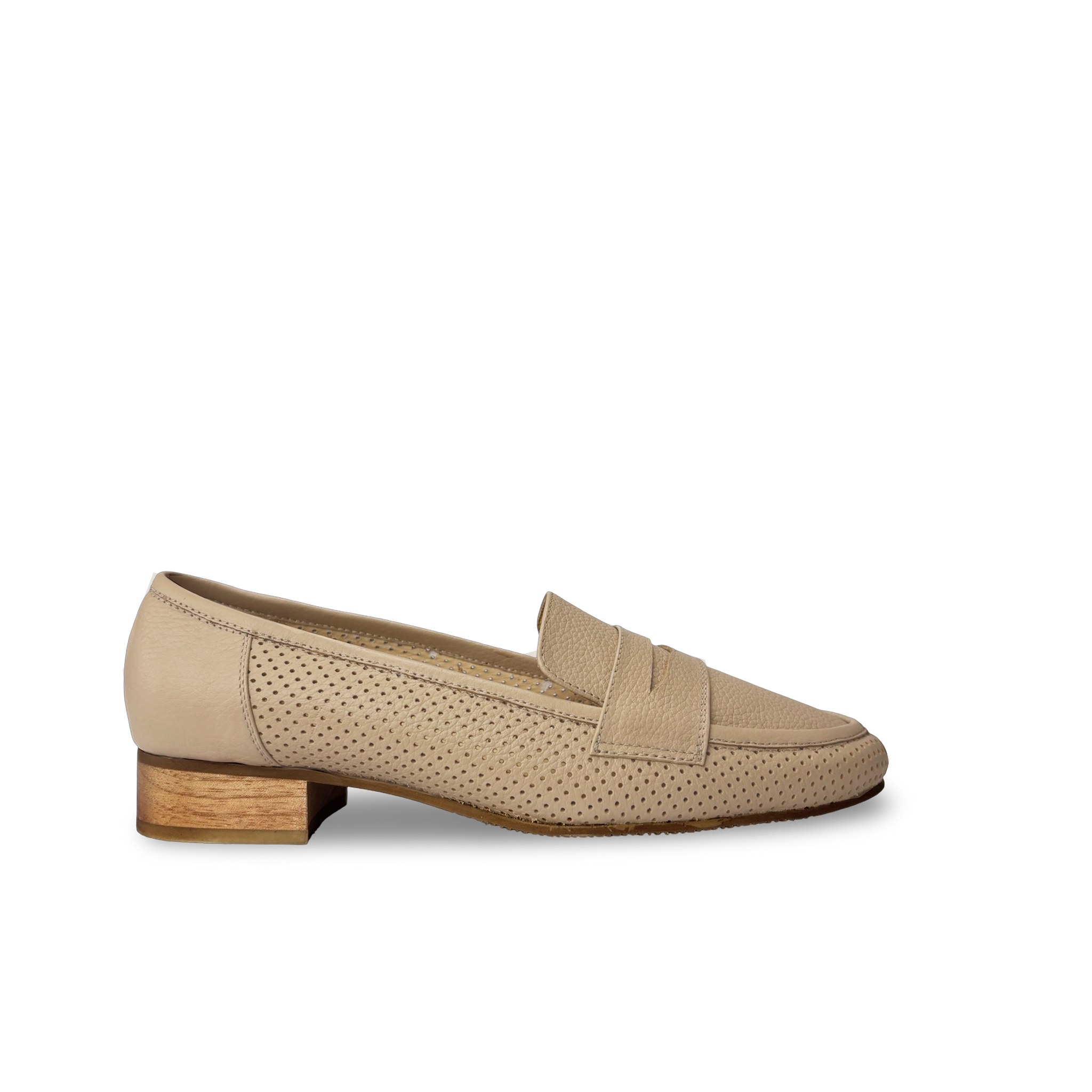 Mocasín para mujer de estilo clásico con tacón bajo forrado en cuero con grabado amaderado, perfecto para un look elegante y cómodo. Su punta almendrada y diseño slip-on de calce fácil brindan un ajuste práctico y refinado. Elaborado en 100% cuero vacuno liso y grabado, ofrece confort y durabilidad en cada uso.