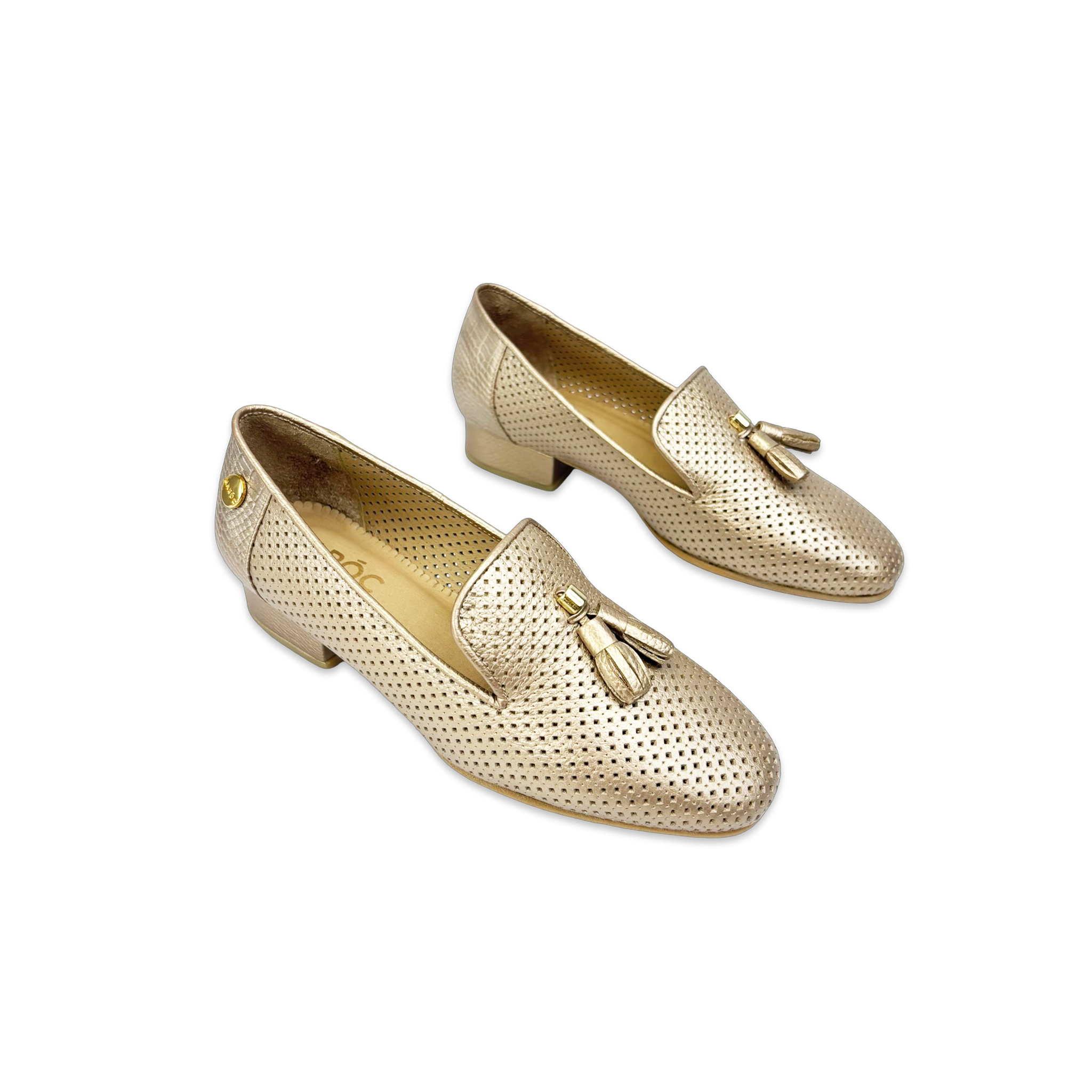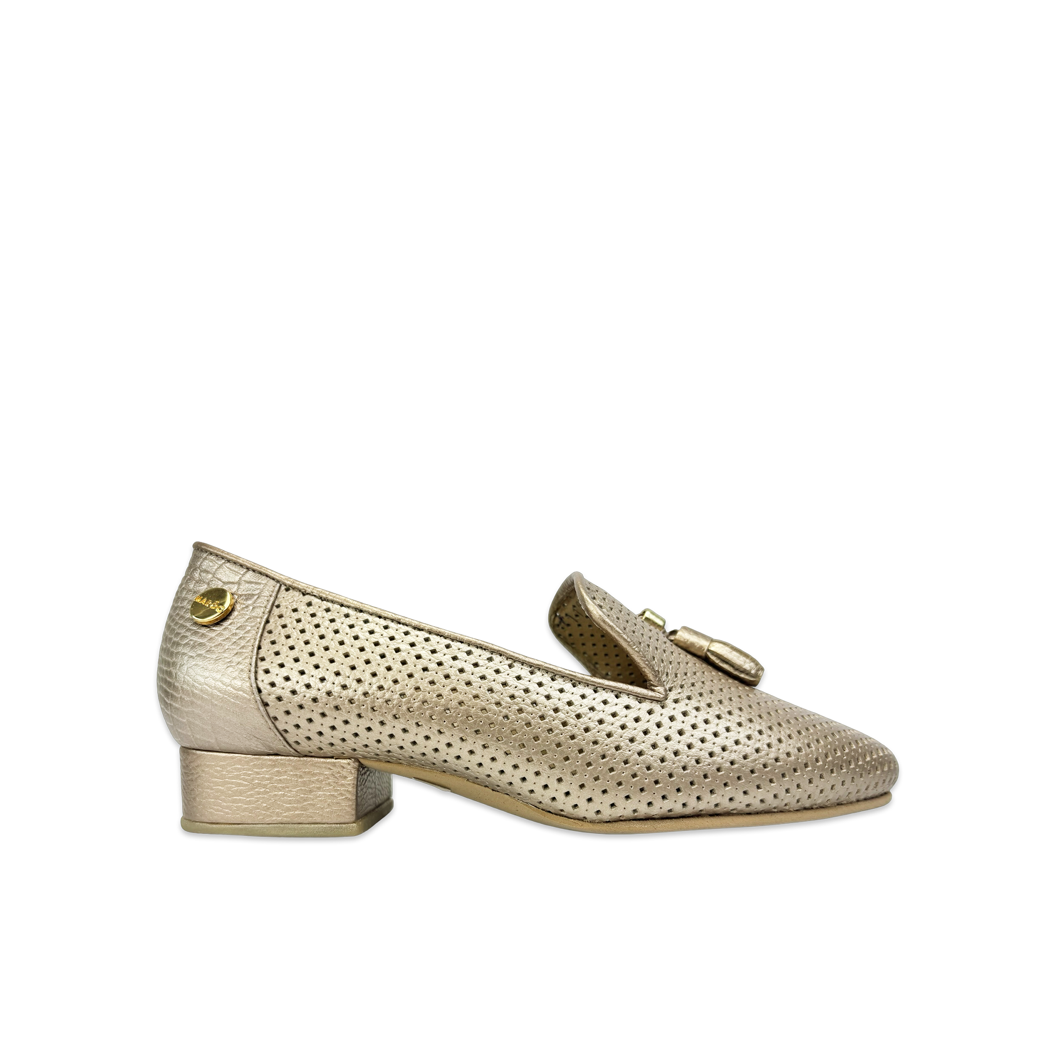 - Tipo: Mocasín con tacón plano para mujer con aplique dorado metálico logo marca Maroc en el lateral del calzado y borla decorativa en el empeine.