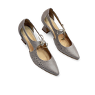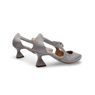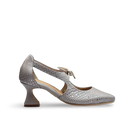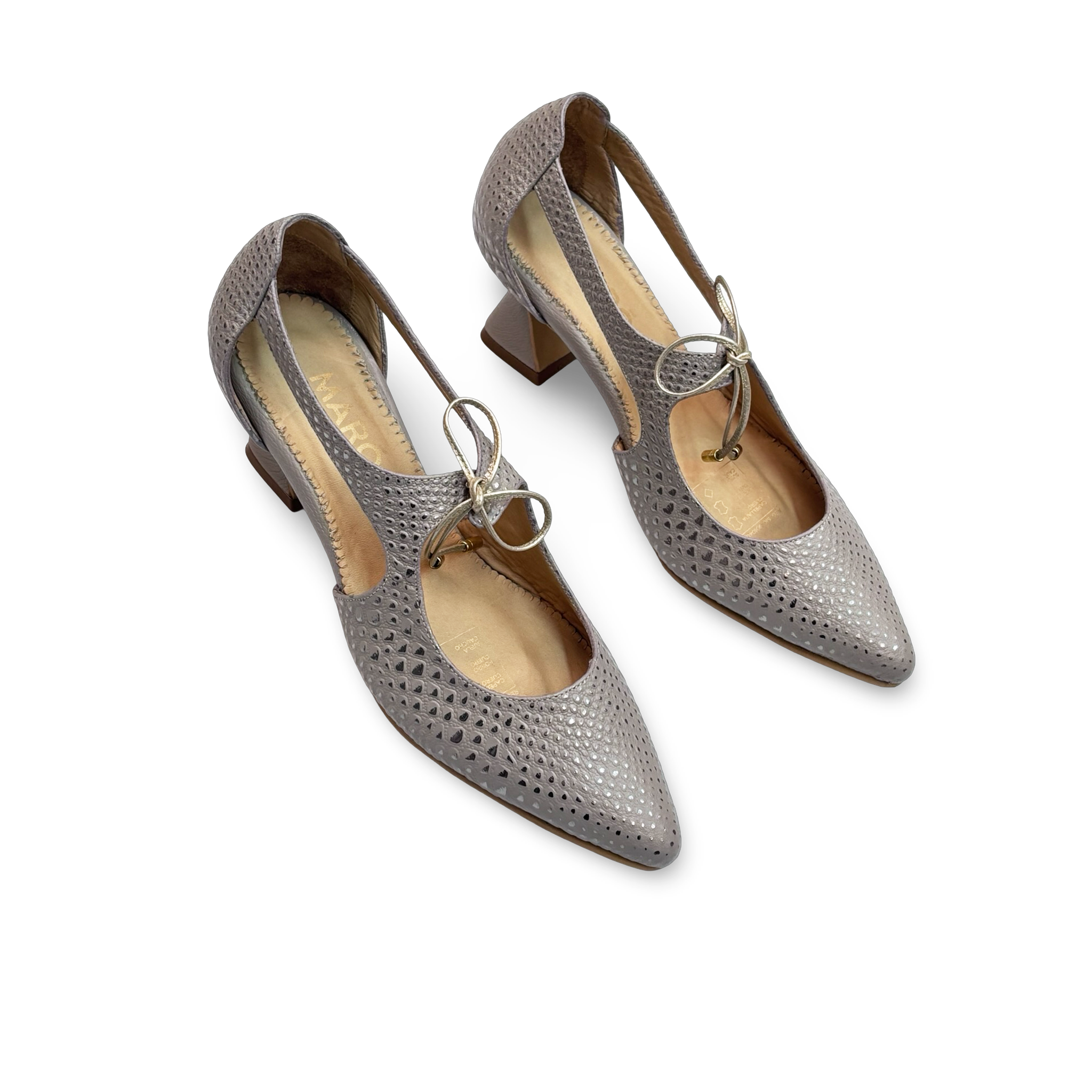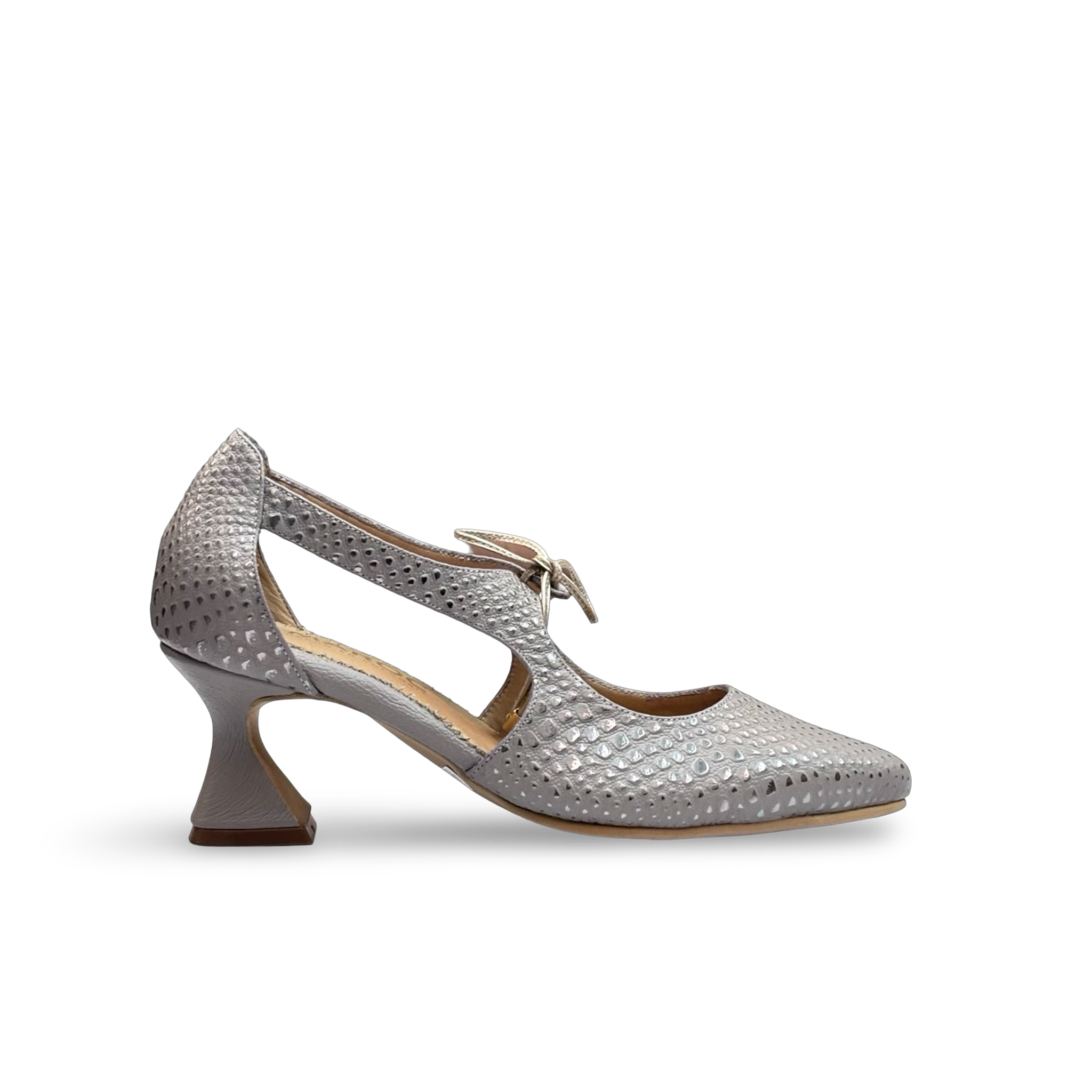 Tacón para mujer de diseño delicado y femenino, con un elegante lazo ajustable en el empeine que aporta un toque distintivo y sofisticado. Elaborado en cuero 100% vacuno grabado y liso, combina materiales que realzan su textura y estilo. Su tacón de 3.5 cm ofrece una altura cómoda para el día a día, mientras que la punta fina estiliza la silueta del pie. Ideal para looks formales o casuales con un aire refinado.