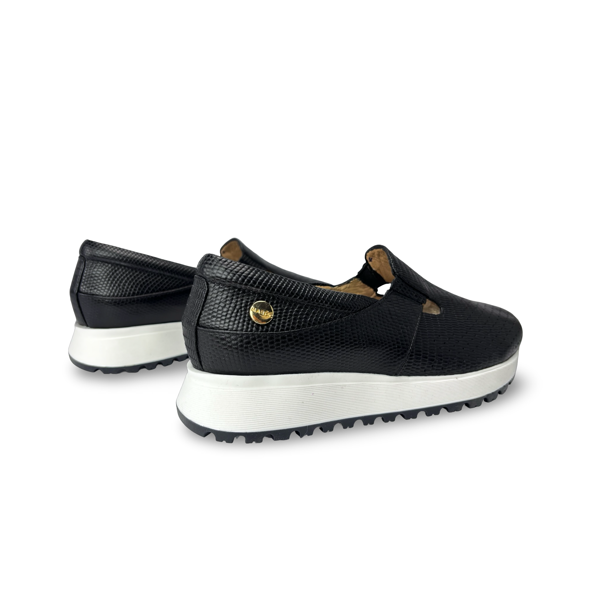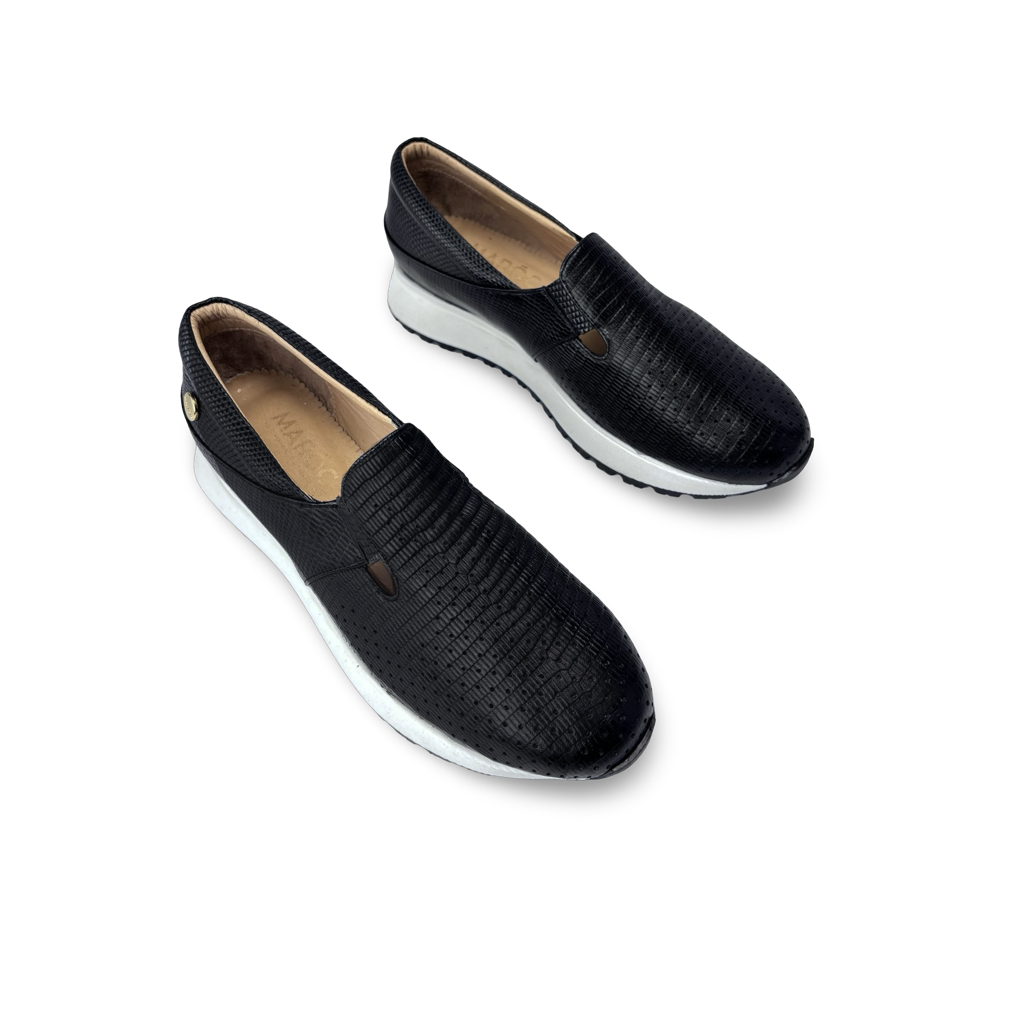Estos tenis tipo confort para mujer de Maroc combinan comodidad y estilo en cada paso. Su diseño slip-on con caucho lateral permite un calce fácil y rápido, mientras la punta semifina ofrece un look elegante sin sacrificar comodidad. La suela de 3.5 cm brinda amortiguación y soporte ideales para el uso diario, y la capellada de 100% cuero vacuno grabado asegura durabilidad y estilo atemporal. Perfectos para quienes buscan un calzado versátil que acompañe tanto outfits casuales como looks más arreglados.