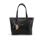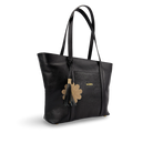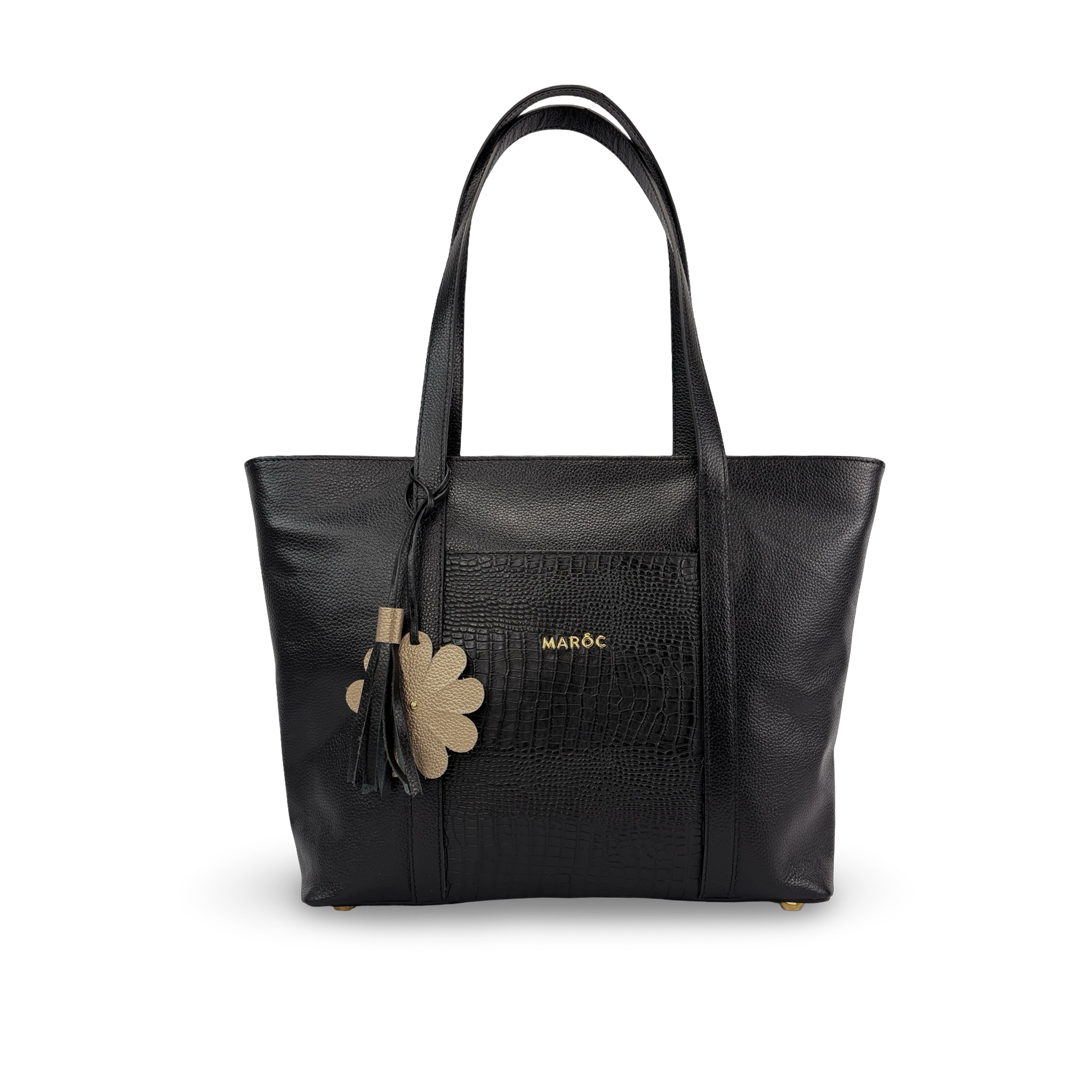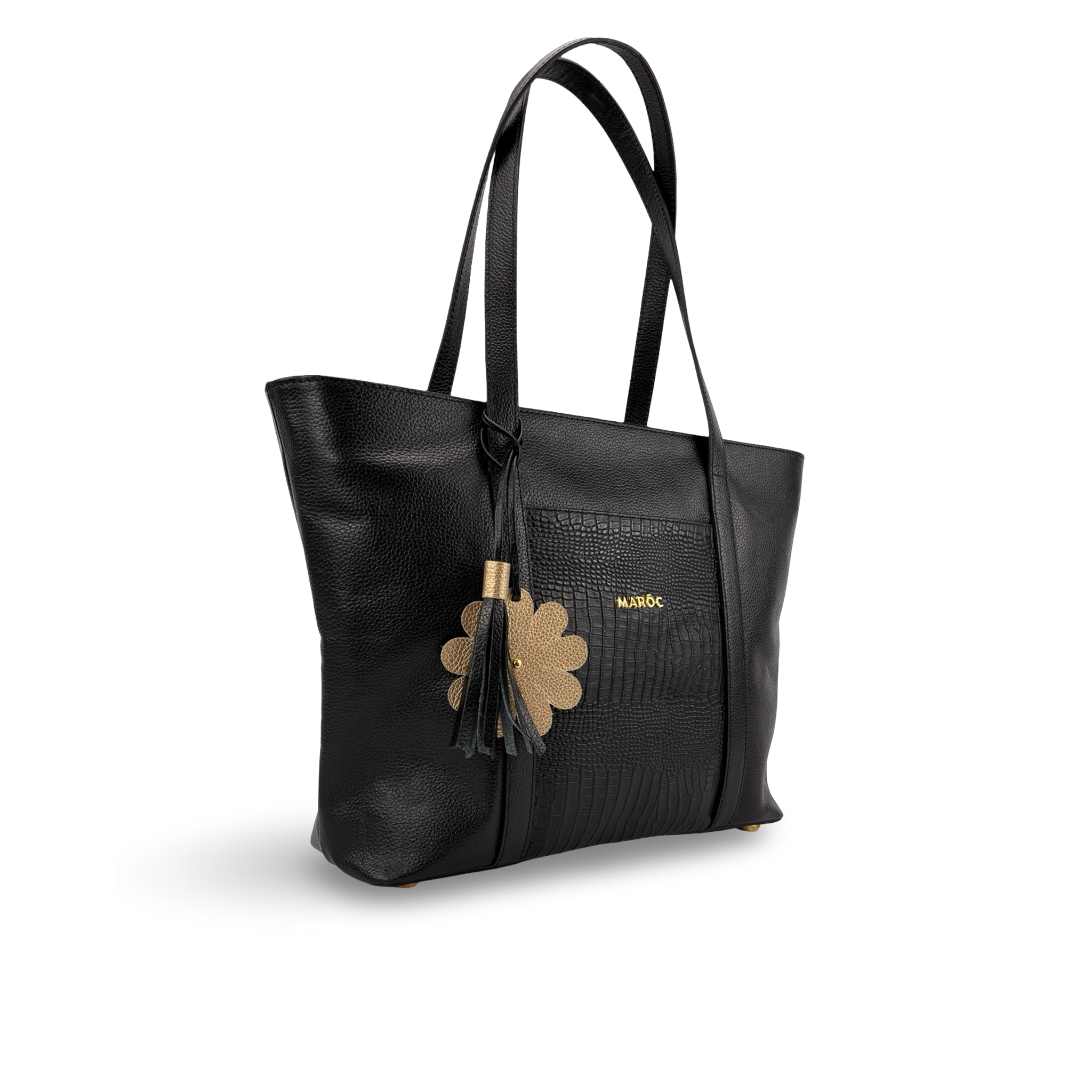 Bolso Shopper para mujer en cuero vacuno grabado, con borla decorativa de flor y aplique metálico dorado del logo Maroc. Cuenta con compartimentos internos y externos para organización, cuatro zapatas en la base y cierre con cremallera. ideal para un estilo elegante y práctico. Hecho en Colombia.