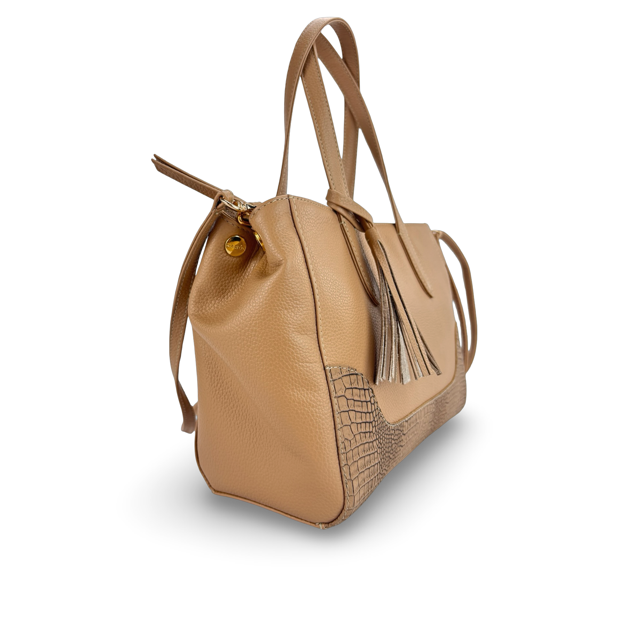 Bolso para mujer en 100% cuero vacuno liso y grabado, con diseño versátil para llevar al hombro o cruzado. Incluye borla decorativa, apliques metálicos con el logo Maroc en los costados y zapatas en la base para mayor protección. Su interior ofrece múltiples compartimentos para mantener todo organizado, ideal para un look práctico y elegante.