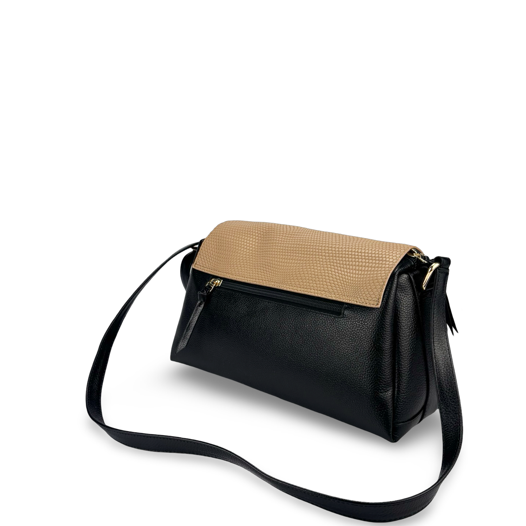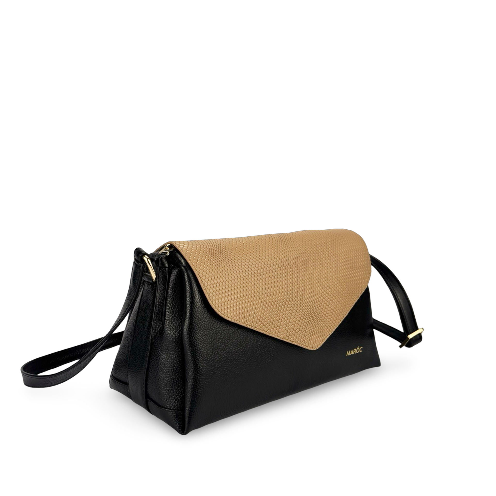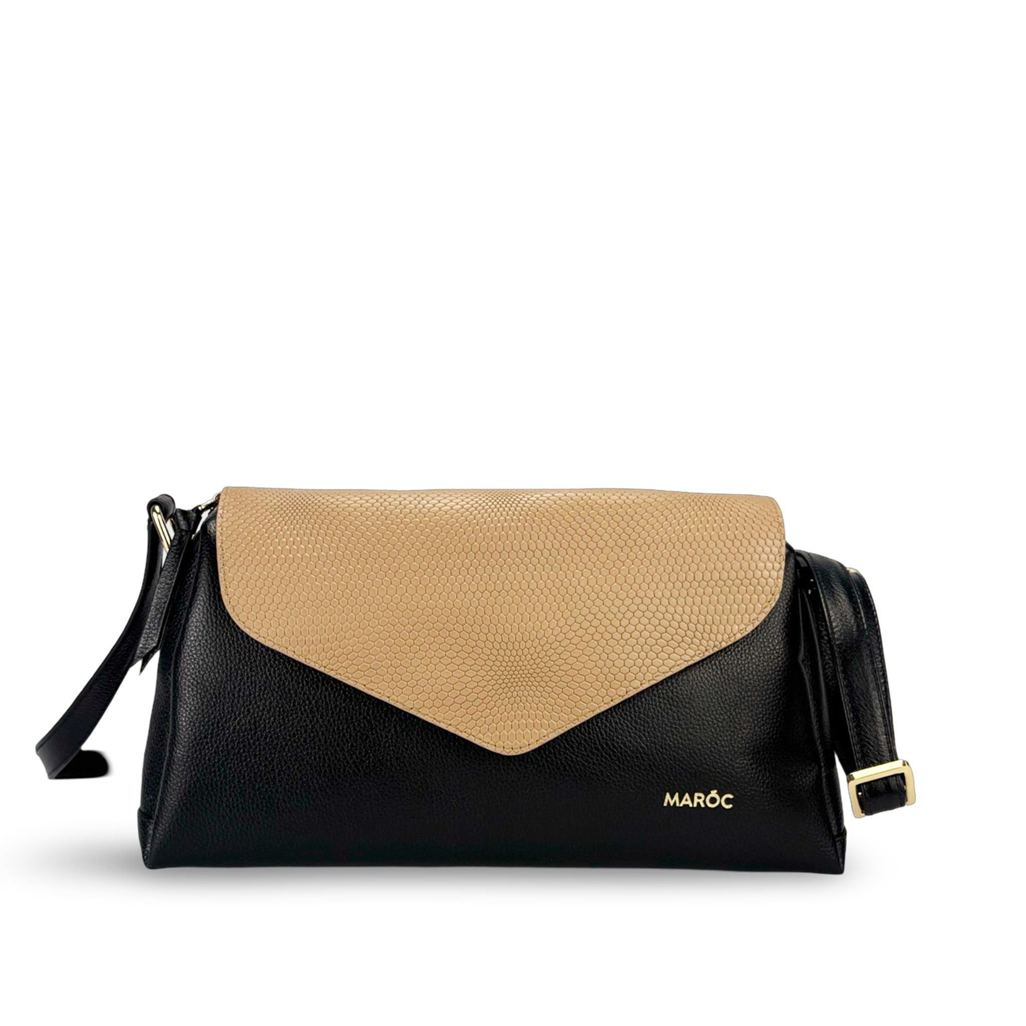 - Tipo: Bolso manos libres con solapa estructurada y logo dorado marca Maroc en la parte frontal del bolso, además es un bolso Bicolor