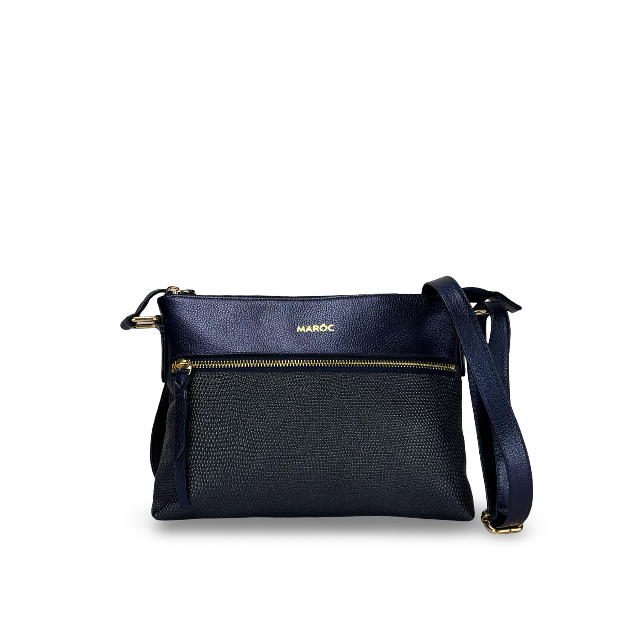 Bolso manos libres para mujer elaborado en 100% cuero vacuno grabado y liso, con aplique metálico dorado del logo Maroc en la parte frontal que aporta distinción y estilo. Su diseño funcional cuenta con tres compartimentos con cierre de cremallera, incluyendo un bolsillo interno, un compartimento externo y uno frontal, perfectos para mantener tus objetos organizados. Incluye mosquetón interno para llaves y bandolera ajustable que permite llevarlo cómodamente al hombro o cruzado. Dimensiones Aproximadas: Alto 20cm x Ancho 26cm x Fondo 2cm