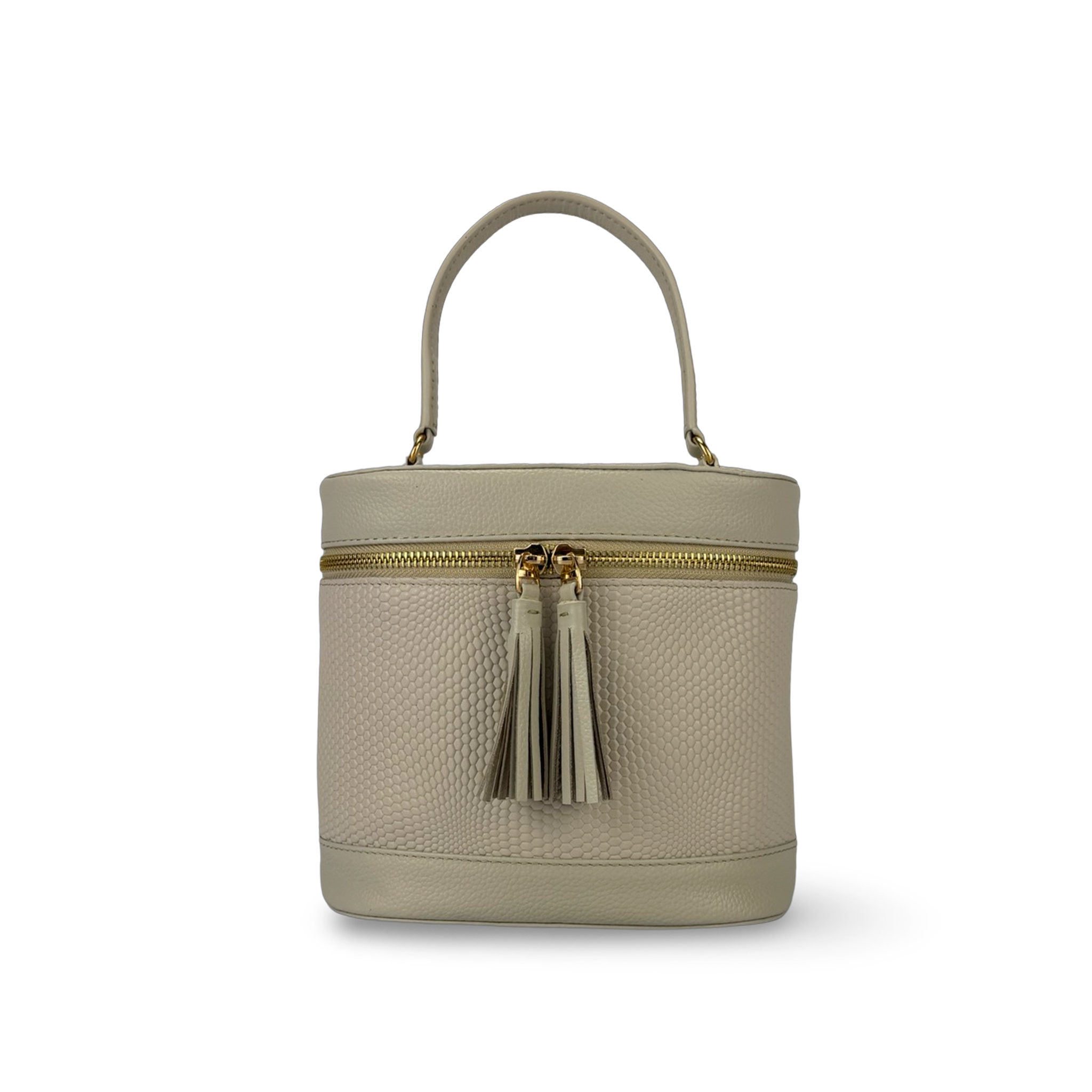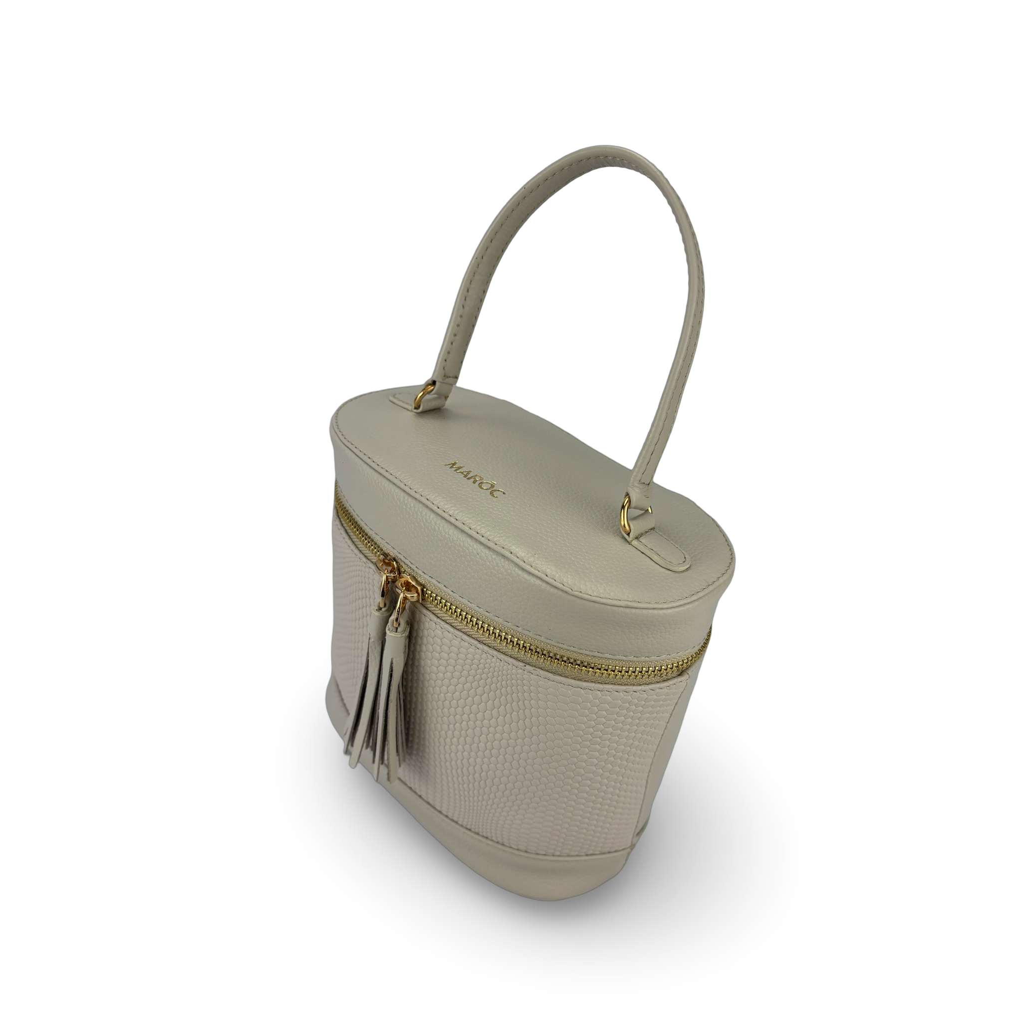 Bolso para mujer tipo “Vanity Case” con diseño estructurado y elegante, elaborado en cuero vacuno bicolor, con combinación de cuero frontal grabado con textura y cuero liso natural.