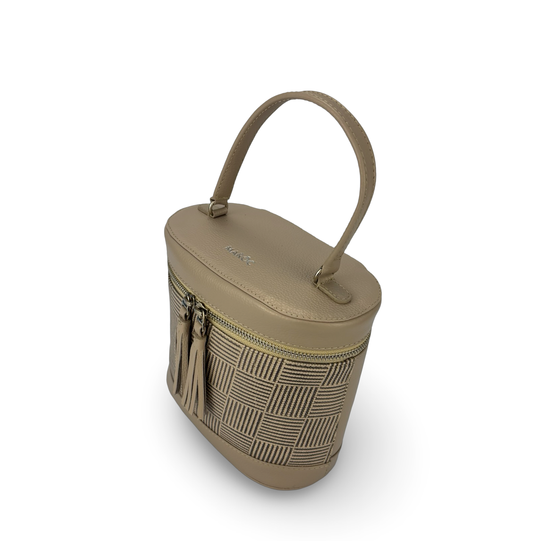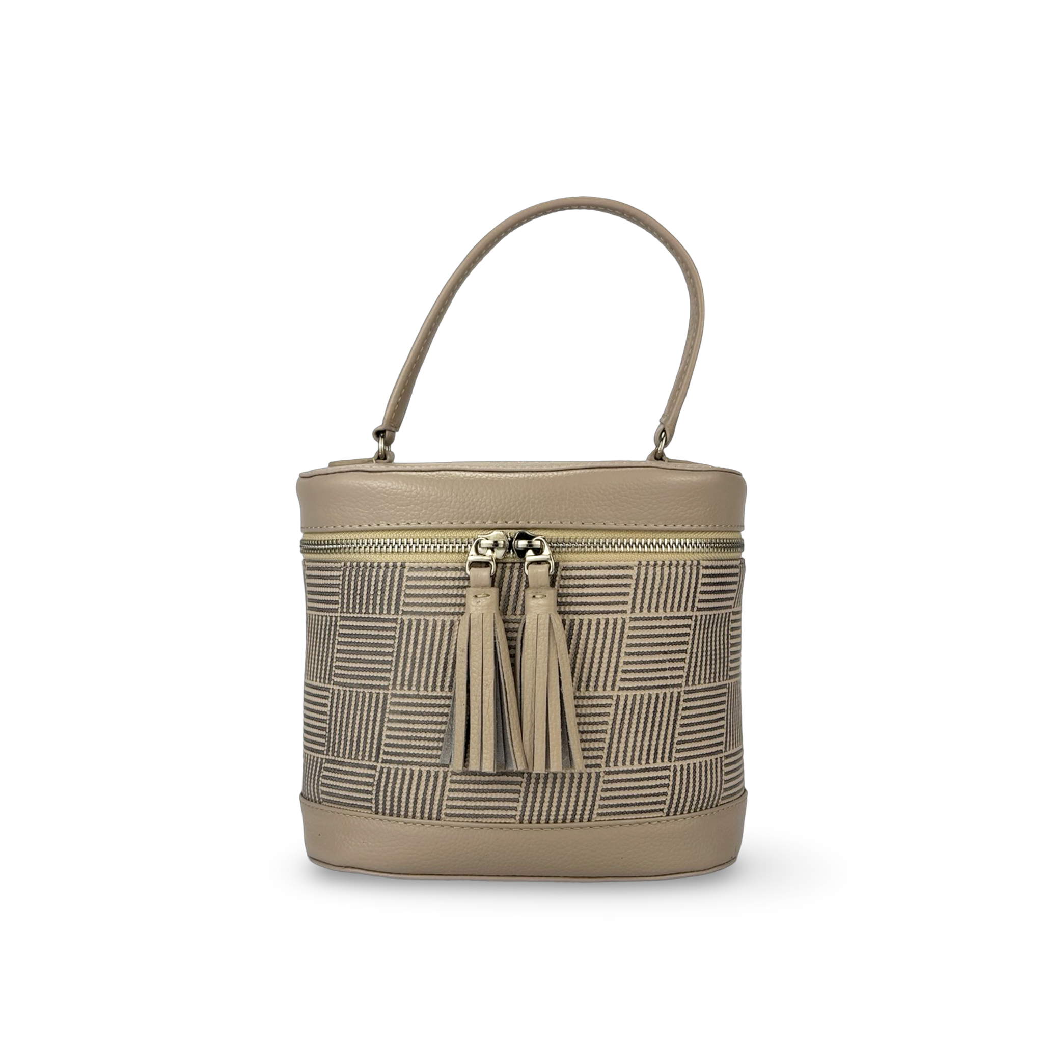 Bolso para mujer tipo “Vanity Case” con diseño estructurado y elegante, elaborado en cuero vacuno bicolor, con combinación de cuero frontal grabado con textura y cuero liso natural.