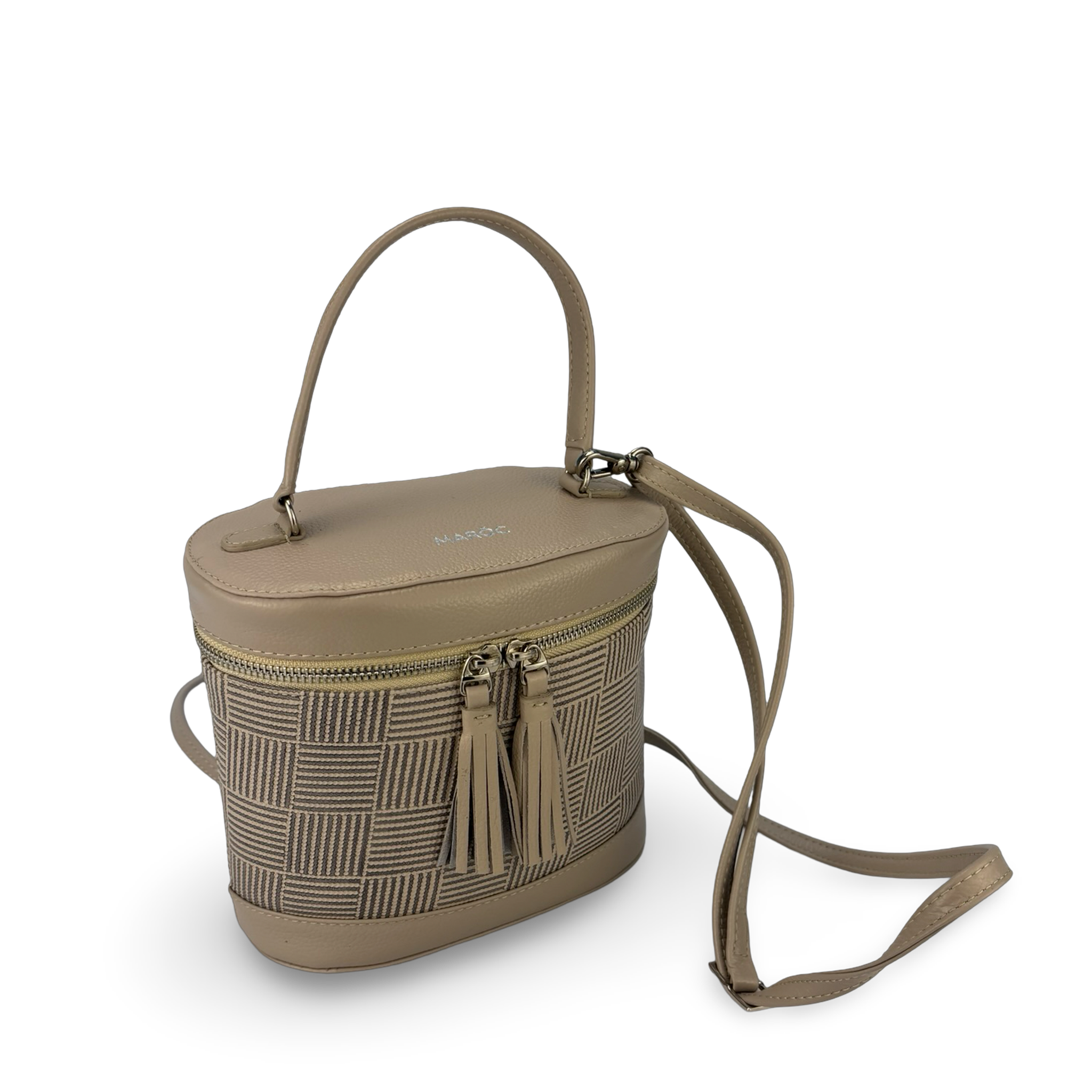 Incluye bolsillo interno multifunción y detalles de diseño como sliders de cremallera con borlas en cuero, que aportan un toque sofisticado y artesanal.