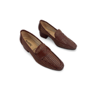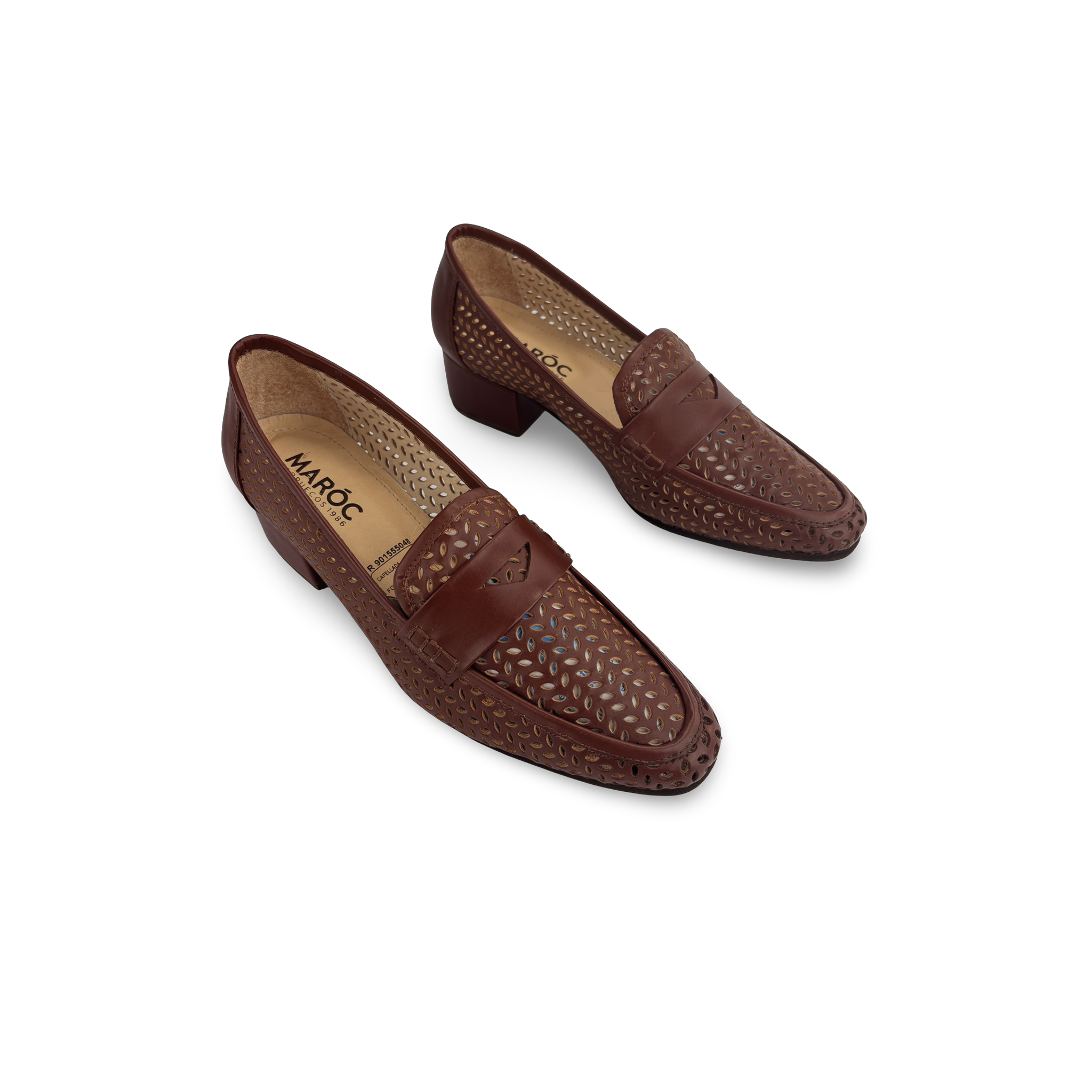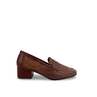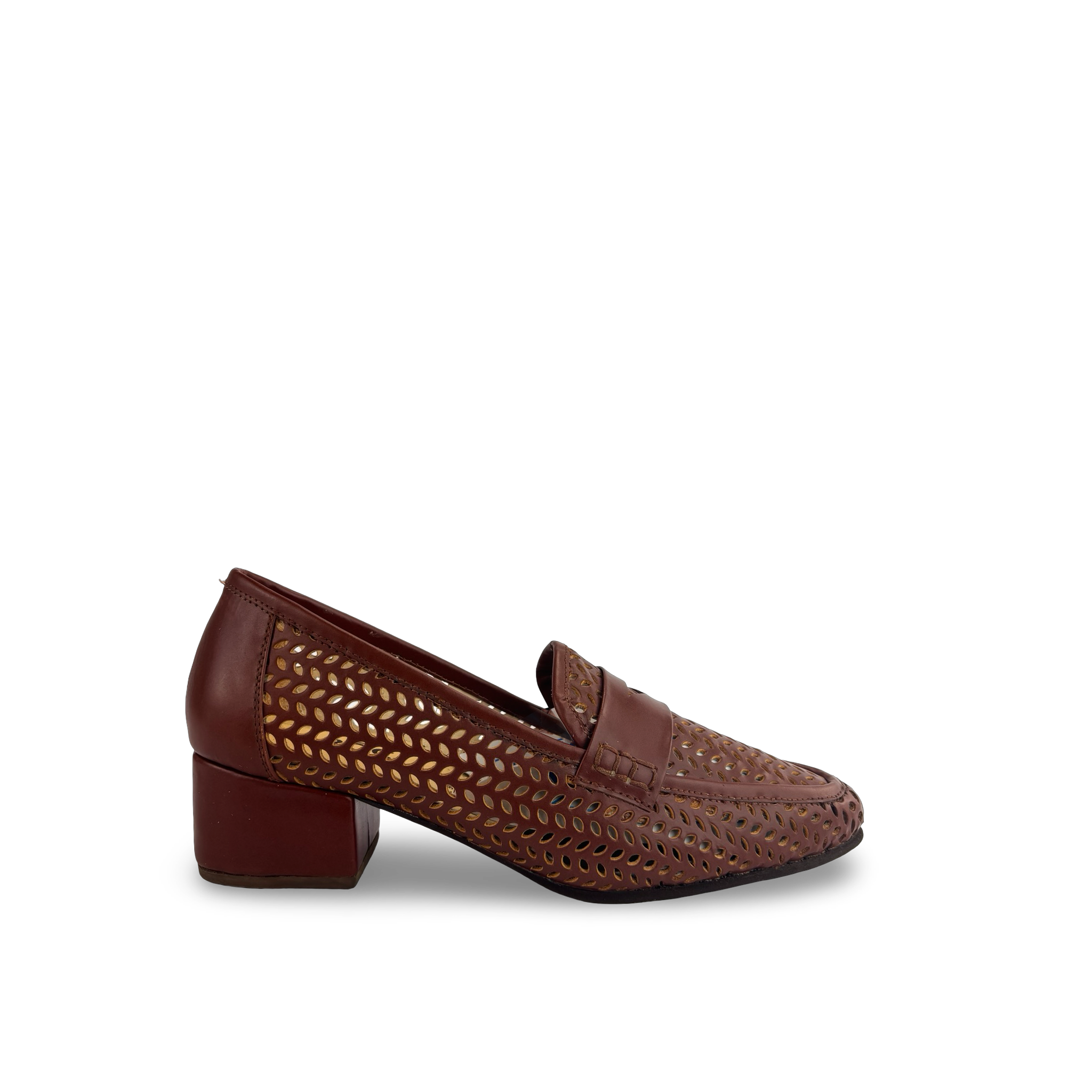 Tacón para mujer en cuero vacuno troquelado con diseño de hojas, elegante y cómodo para uso diario o eventos especiales. Cuenta con tacón de 3 cm en caucho, horma ovalada y estilo slip-on fácil de calzar. Hecho en Colombia con acabados de alta calidad.