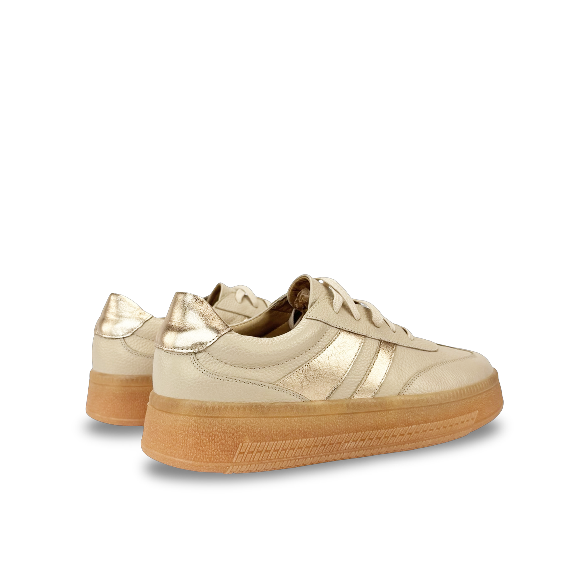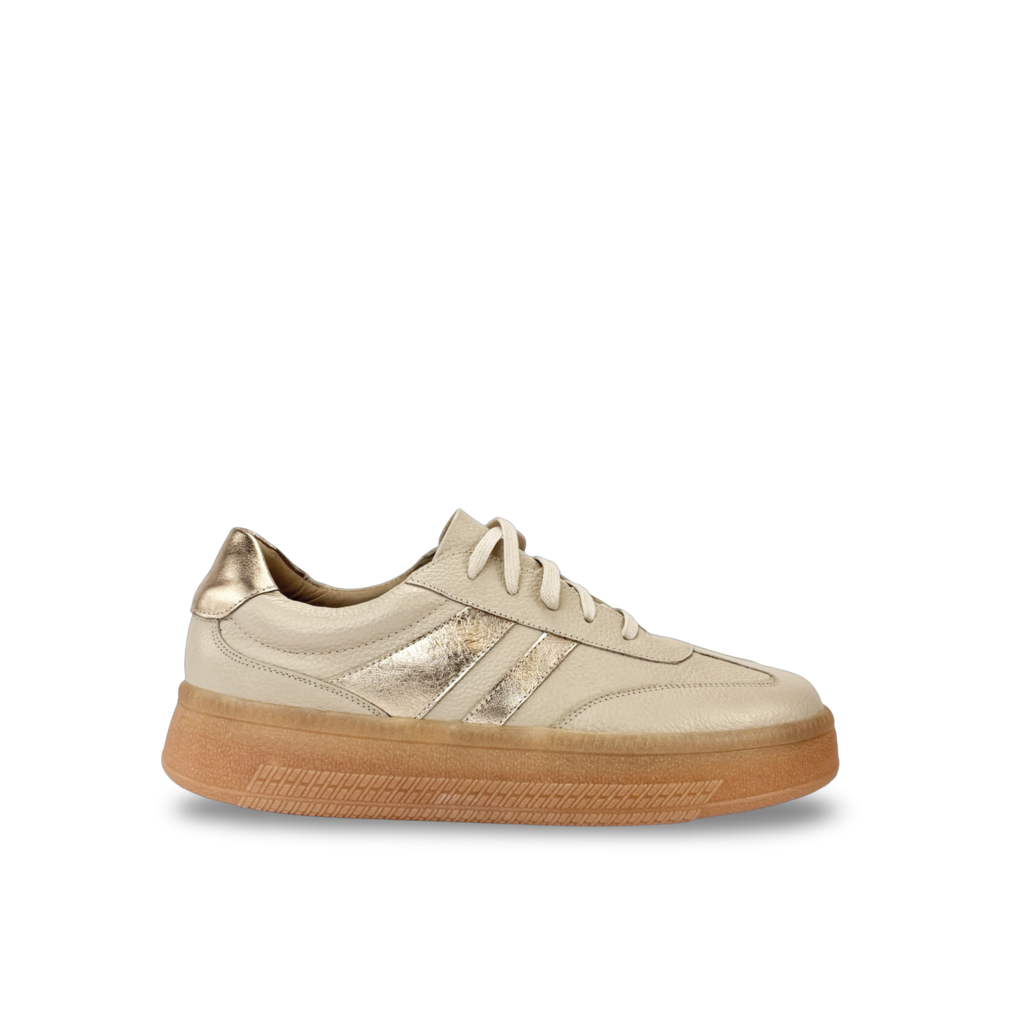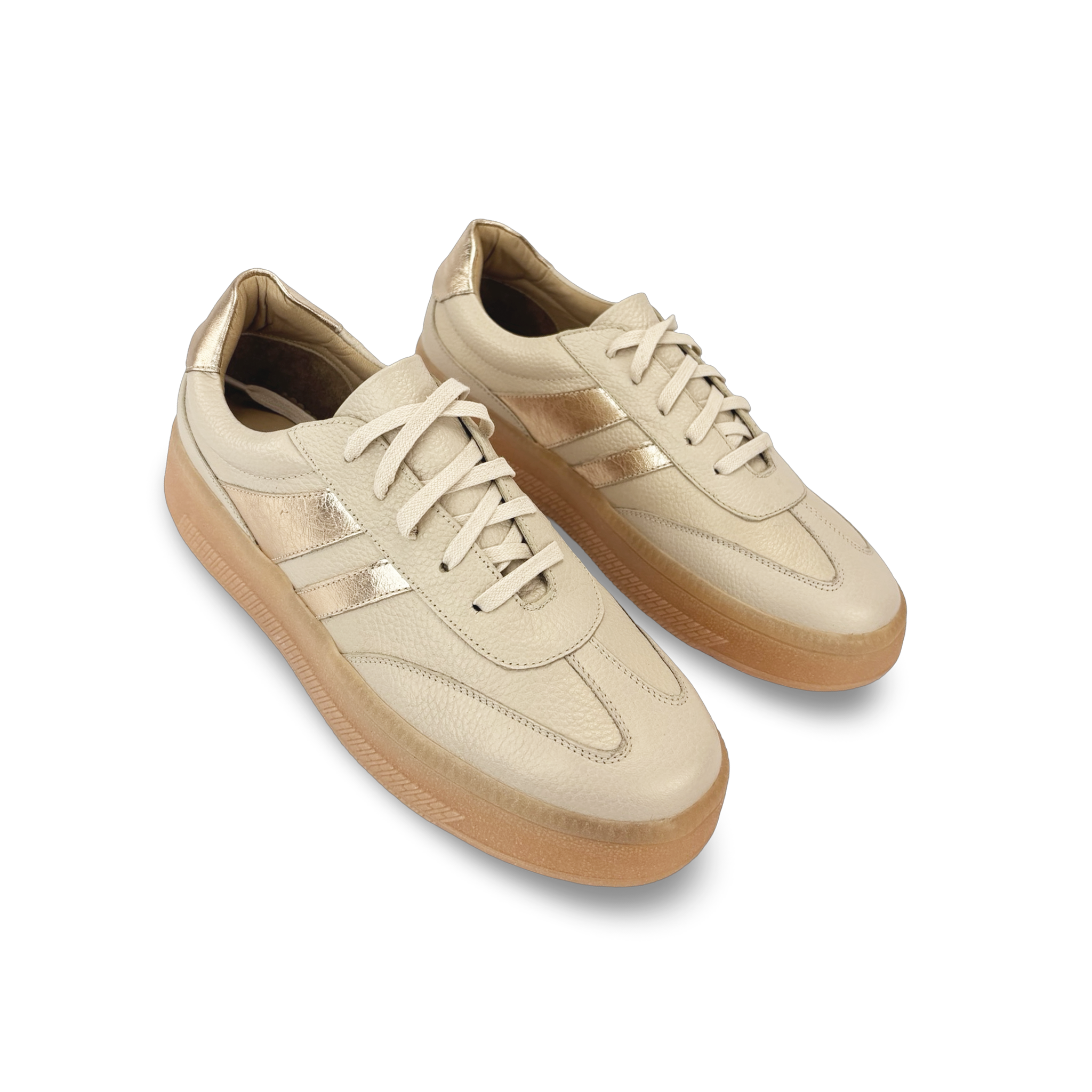 Tenis para mujer estilo samba elaborados en 100% cuero vacuno grabado y detalles en los laterales y atrás del calzado con cuero metalizado, con suela de caucho de 3 cm que brinda comodidad y resistencia. Diseño clásico con punta redonda, cierre en cordón de cuero y detalles elegantes que realzan cualquier look casual o urbano. Hechos en Colombia con forro en cuero para mayor confort y durabilidad.