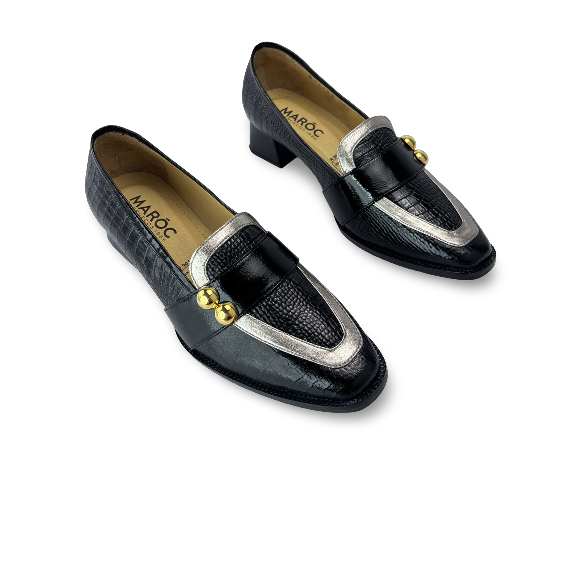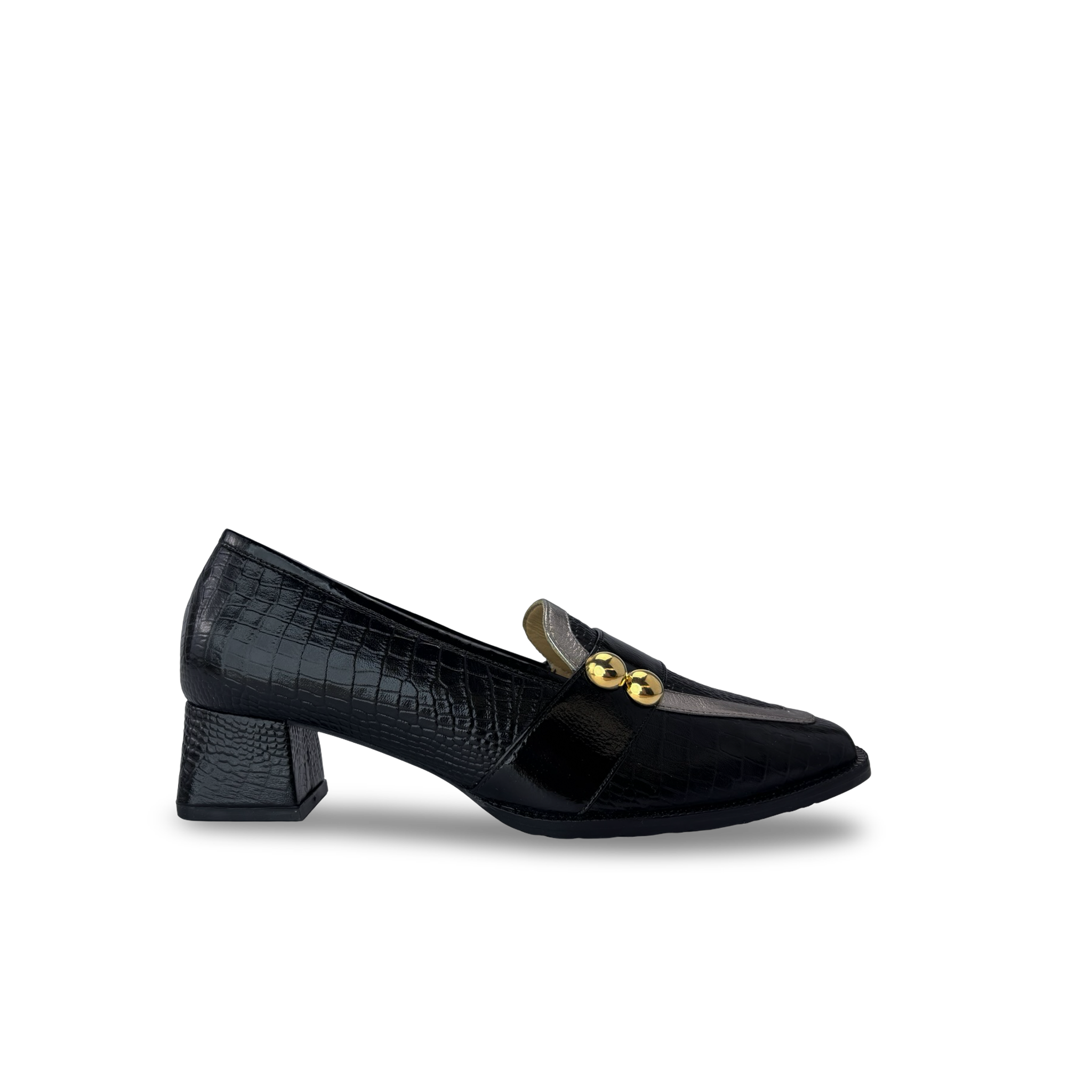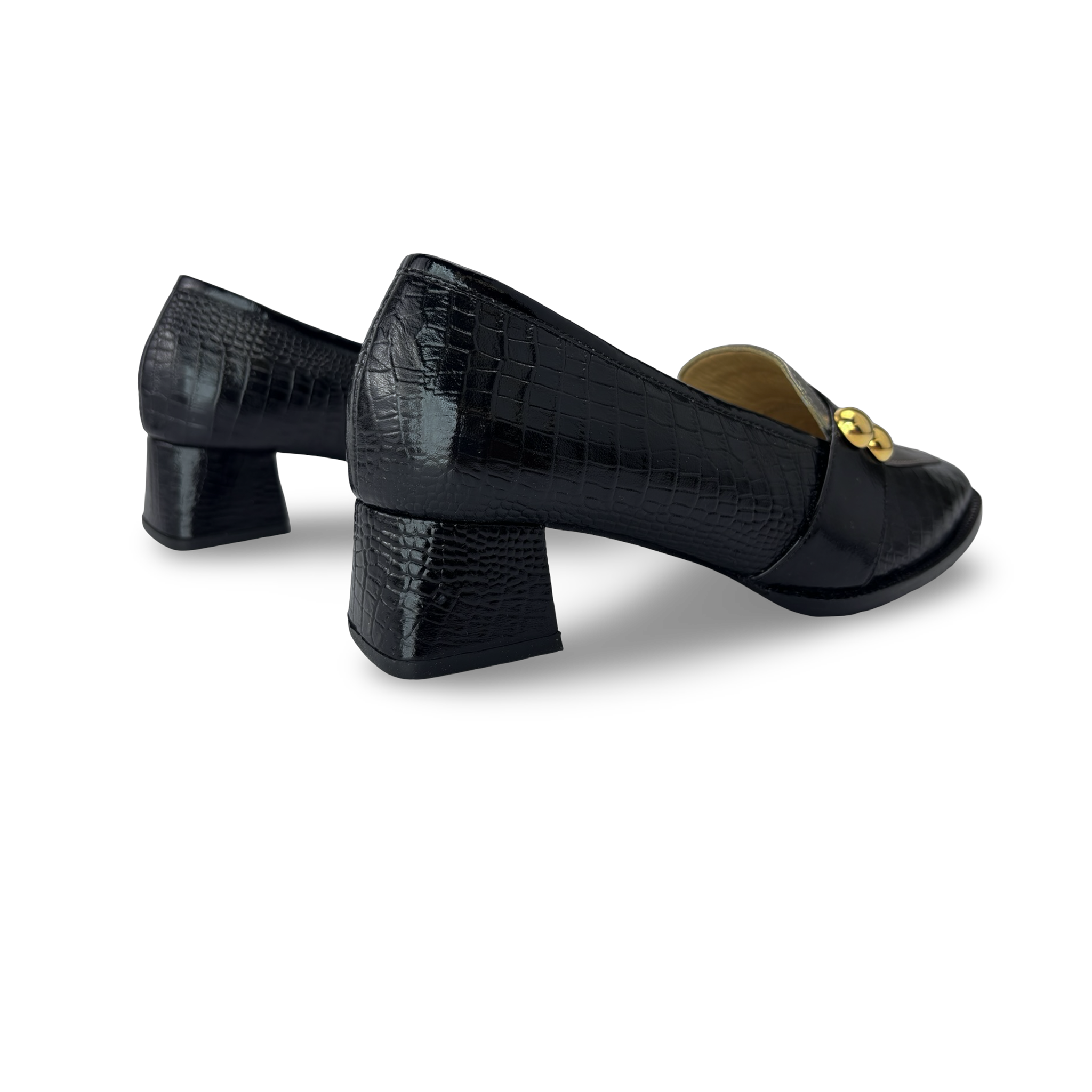 Tacón para mujer elegante y atemporal, diseñado para brindar comodidad sin perder estilo. Su tacón de 3.5 cm y punta cuadrada aportan un aire clásico con un toque contemporáneo, ideal para looks formales o casuales. Fabricado en cuero vacuno grabado y liso, destaca por su suavidad, durabilidad y acabado refinado.