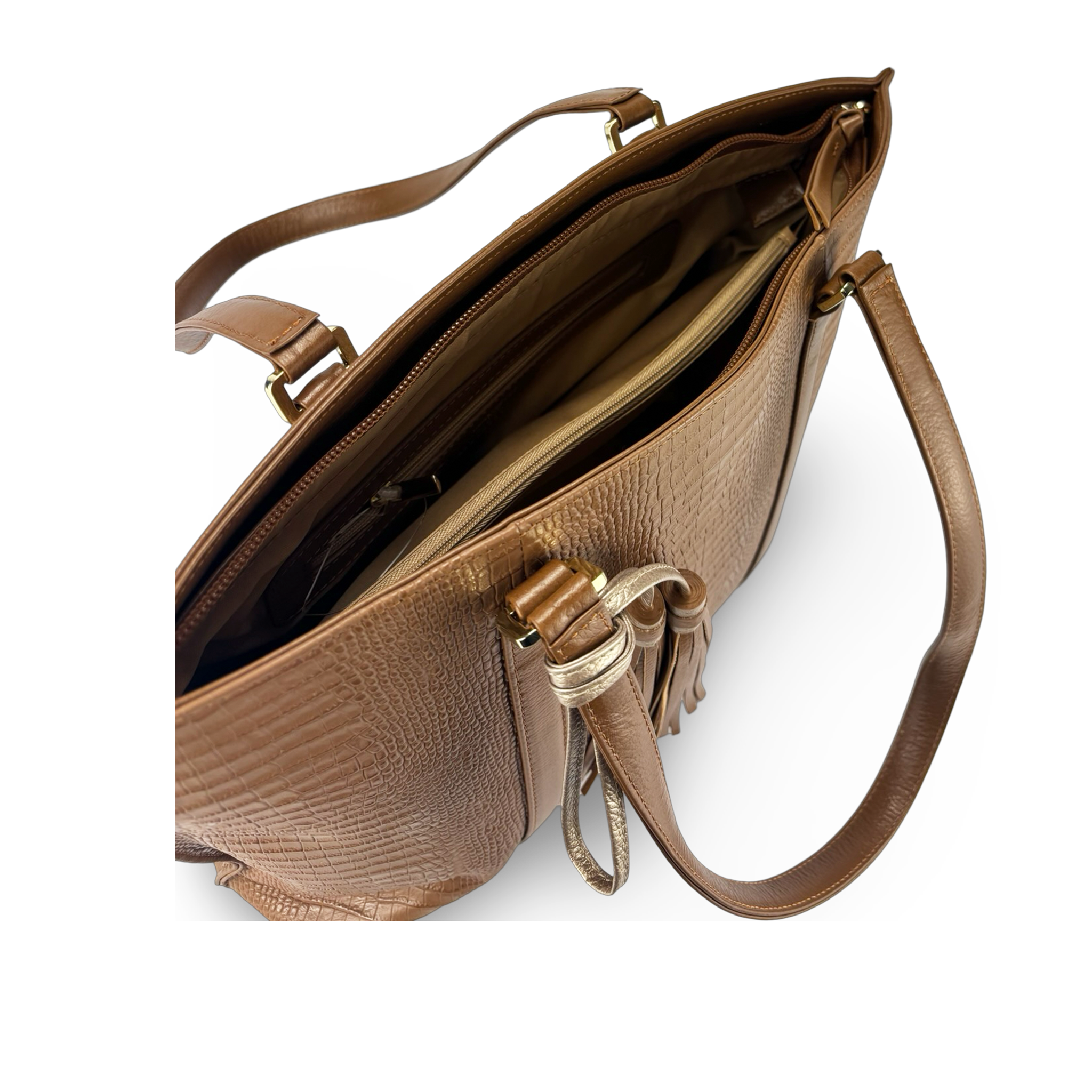 Descubre este exclusivo bolso para mujer, confeccionado en cuero vacuno de alta calidad. Su diseño sofisticado y funcional combina lo mejor del cuero grabado con el toque natural del cuero liso, ofreciendo un acabado elegante y moderno.
