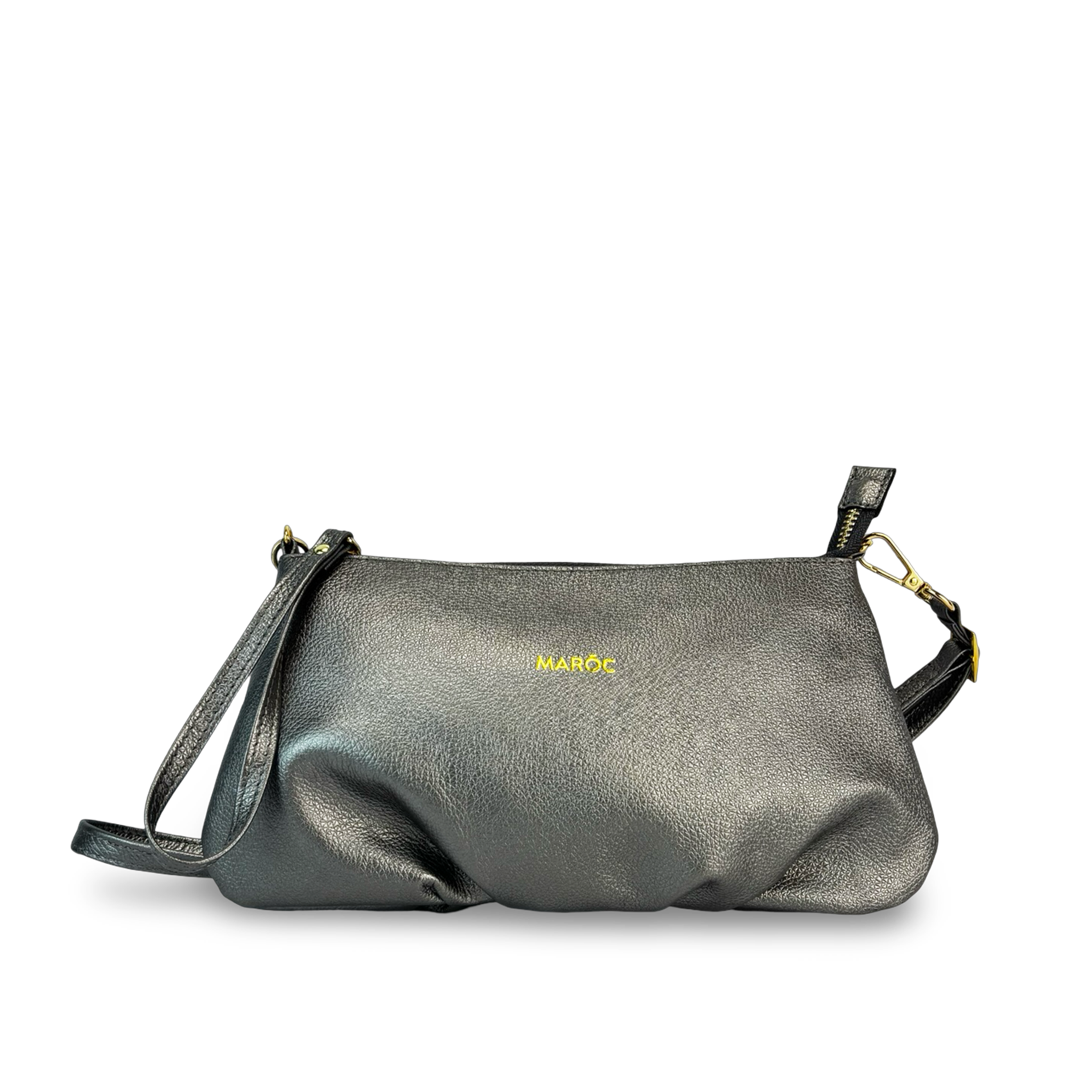 Bolso manos libres para mujer elaborado en cuero vacuno grabado y metalizado, con logo MAROC grabado en la parte frontal que resalta su diseño elegante y contemporáneo.