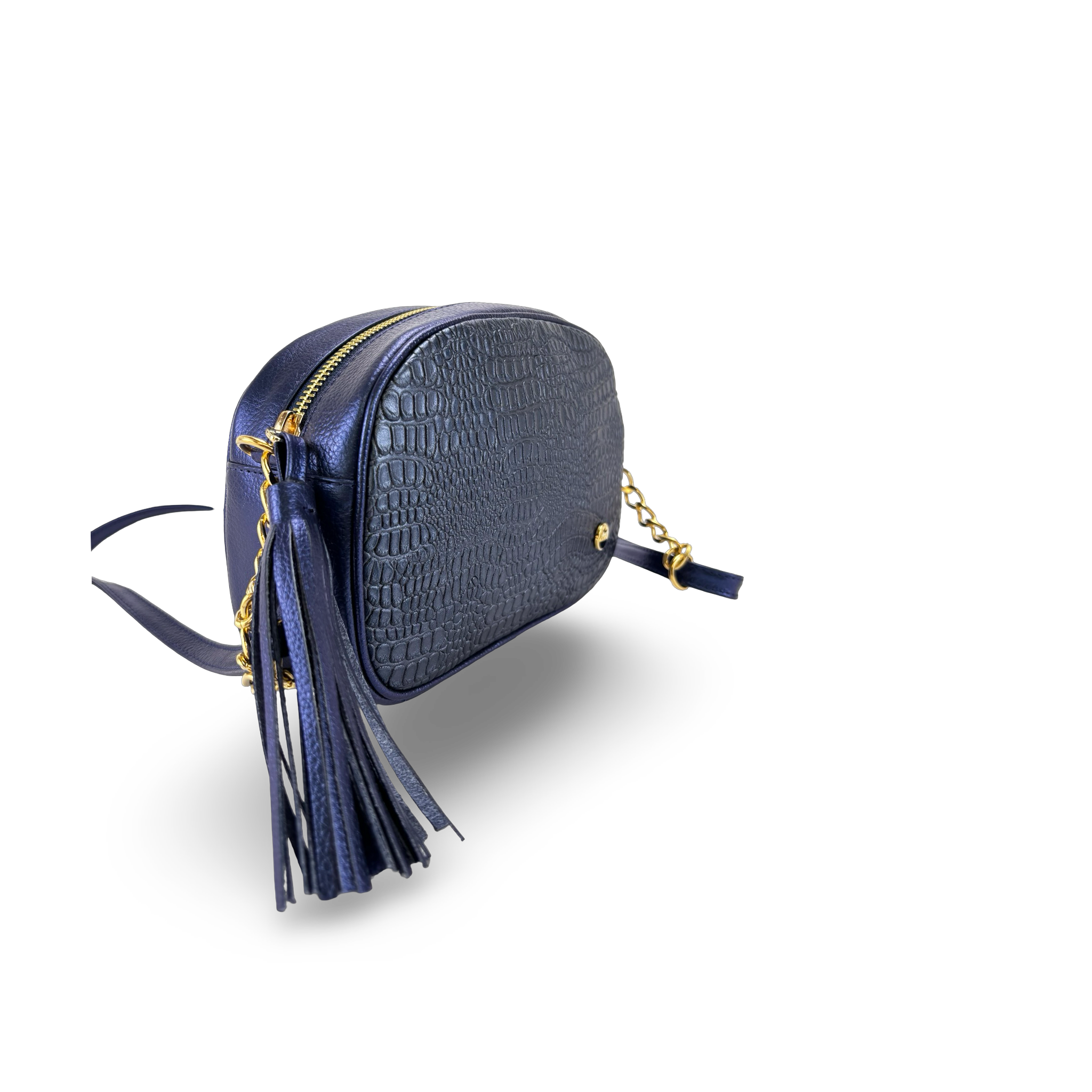 Elegante y práctico, este bolso manos libres está elaborado en 100% cuero vacuno metalizado y grabado, con herrajes en zamak que aportan resistencia y un acabado sofisticado. Dimensiones aproximadas (15 x 21 x 7 cm), incluye bolsillo interno tipo monedero con cremallera y slider en borla de cuero, además de bolsillo trasero con cierre de cremallera, ideales para llevar tus esenciales organizados. Su bandolera combinada en cuero y cadena, graduable con corredera, permite ajustarlo a tu estilo y comodidad. Con aplique metálico frontal de la marca MARÓC, es el accesorio perfecto para un look moderno y versátil. Hecho en Colombia.