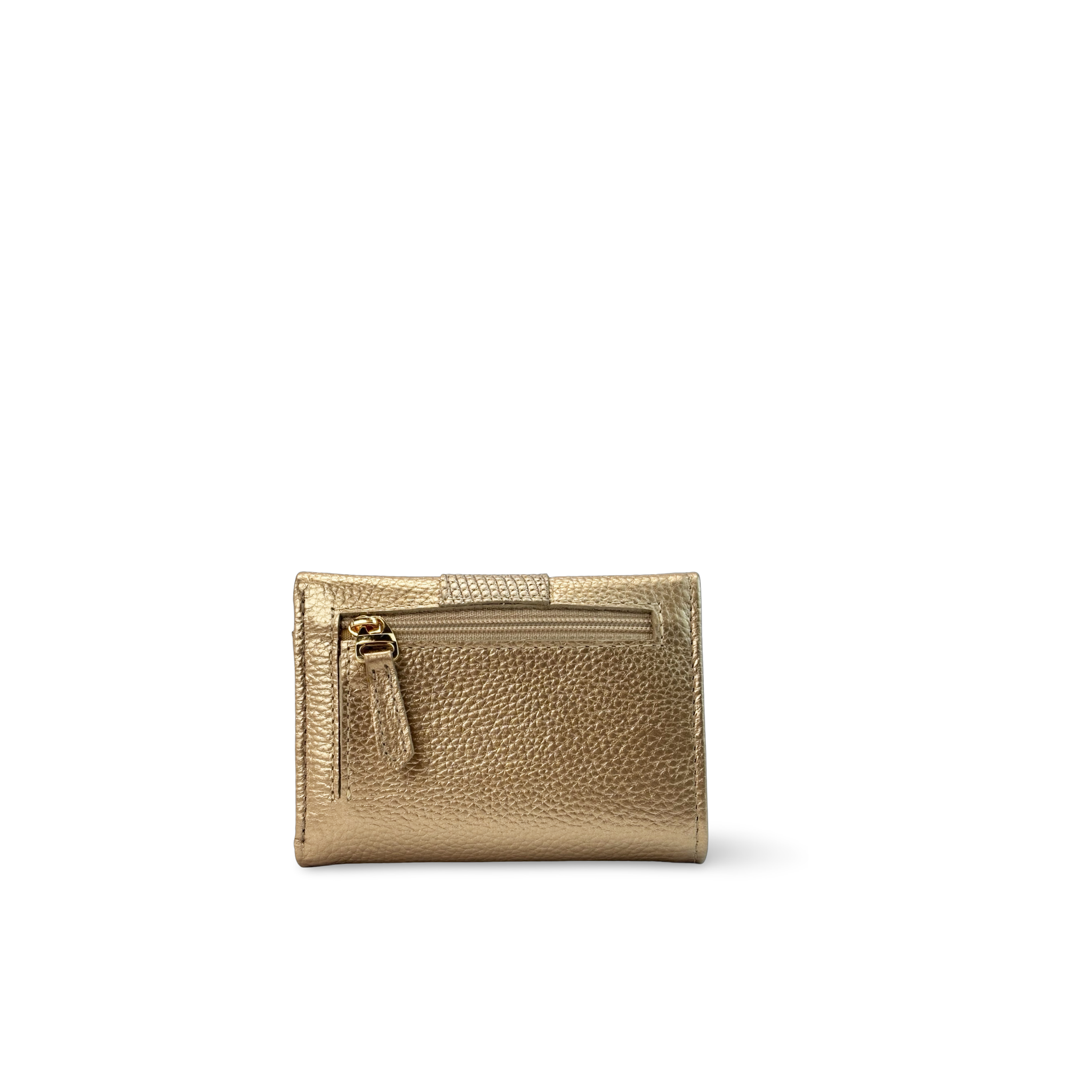 Billetera para mujer elaborada en cuero vacuno grabado y liso, con aplique metálico del logo MAROC en la parte frontal que resalta su estilo elegante y moderno.