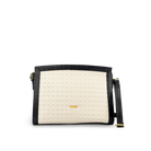 Bolso manos libres para mujer en diseño bicolor (negro-perlato) elaborado en 100% cuero vacuno grabado y liso, con aplique metálico del logo Maroc en la parte frontal. Cuenta con un compartimento principal, un bolsillo interno y un compartimento externo con cremallera. Incluye correa ajustable para cruzar, combinando estilo y funcionalidad.