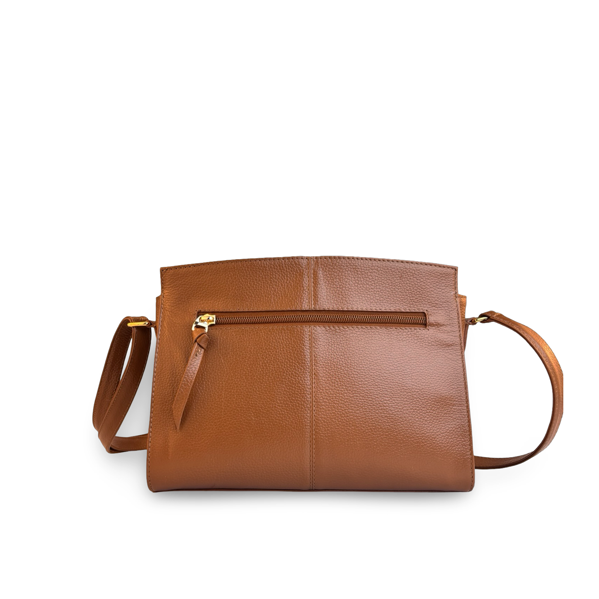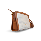 Bolso manos libres para mujer en diseño bicolor (coñac y arena) elaborado en 100% cuero vacuno grabado y liso, con aplique metálico del logo Maroc en la parte frontal. Cuenta con un compartimento principal, un bolsillo interno y un compartimento externo con cremallera. Incluye correa ajustable para cruzar, combinando estilo y funcionalidad.