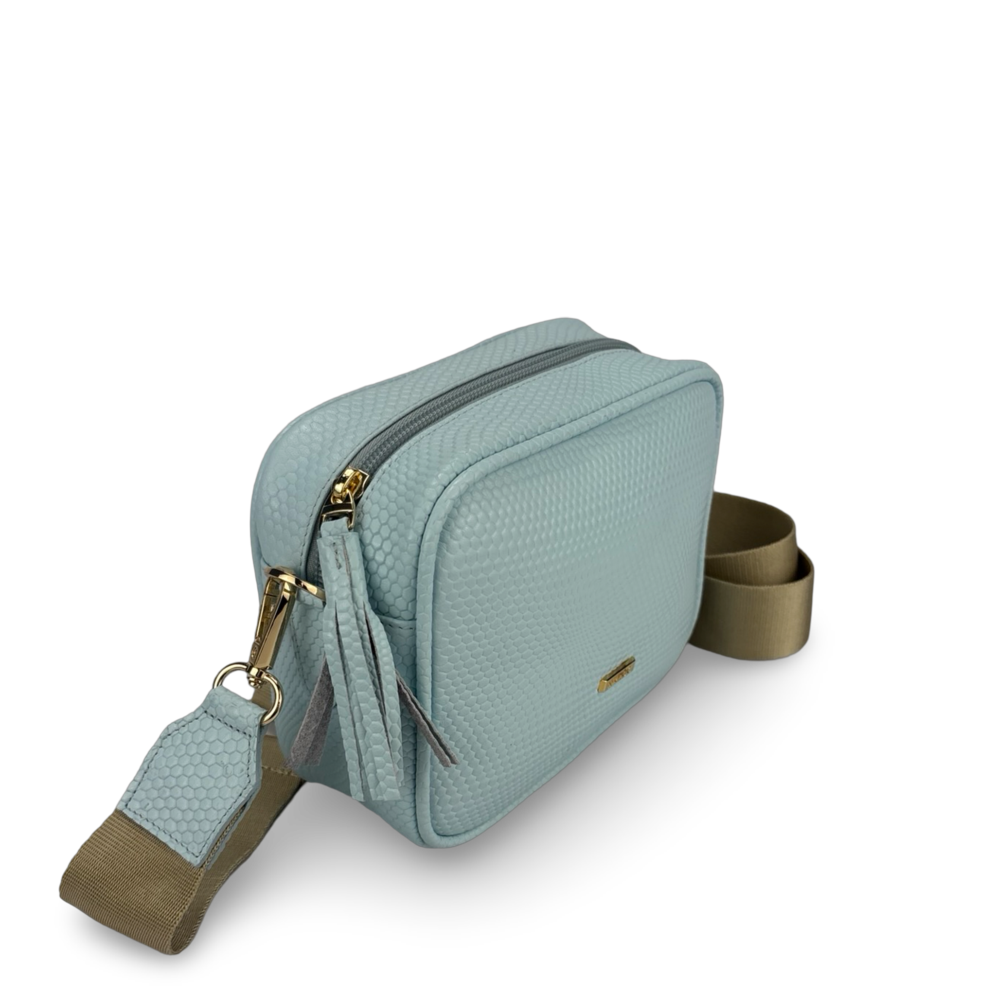 Este bolso manos libres de mujer en cuero vacuno es la mezcla perfecta de diseño elegante y funcionalidad práctica. Con un cuero combinado, que incluye un frontal grabado con textura y un toque de combinación de colores, este bolso destaca por su originalidad y estilo.
