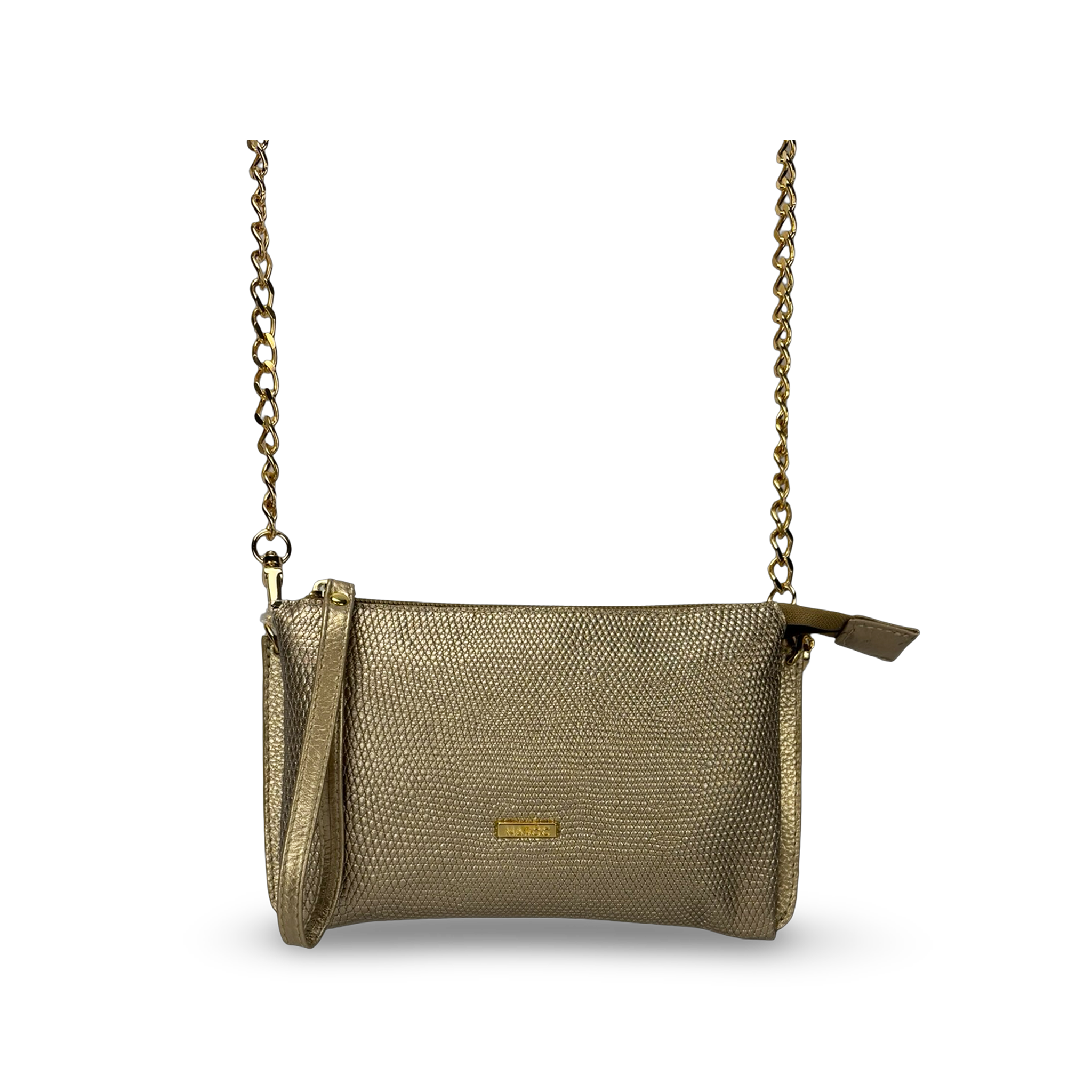 • Bandolera de cadena dorada combinada con cuero – Estética y funcionalidad.