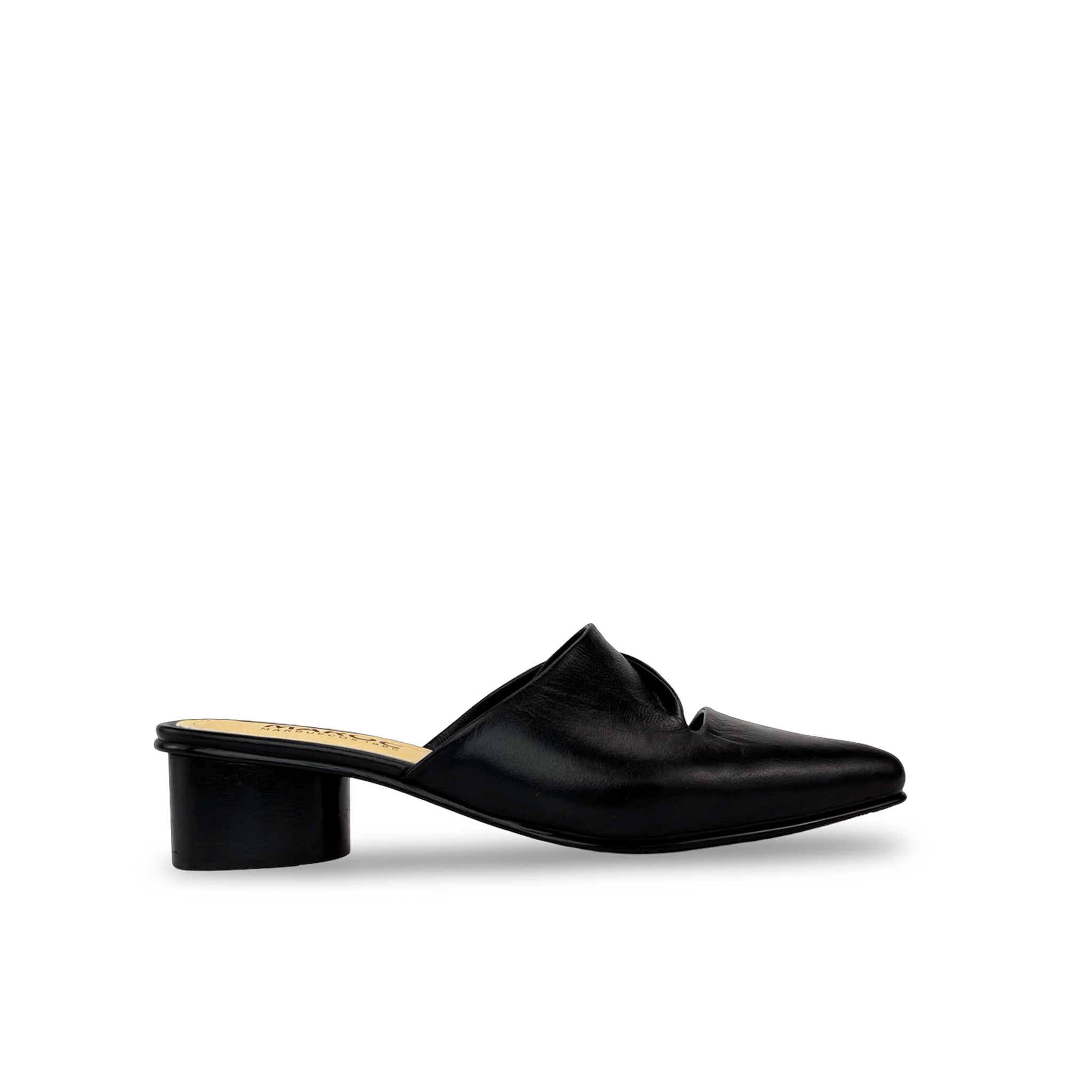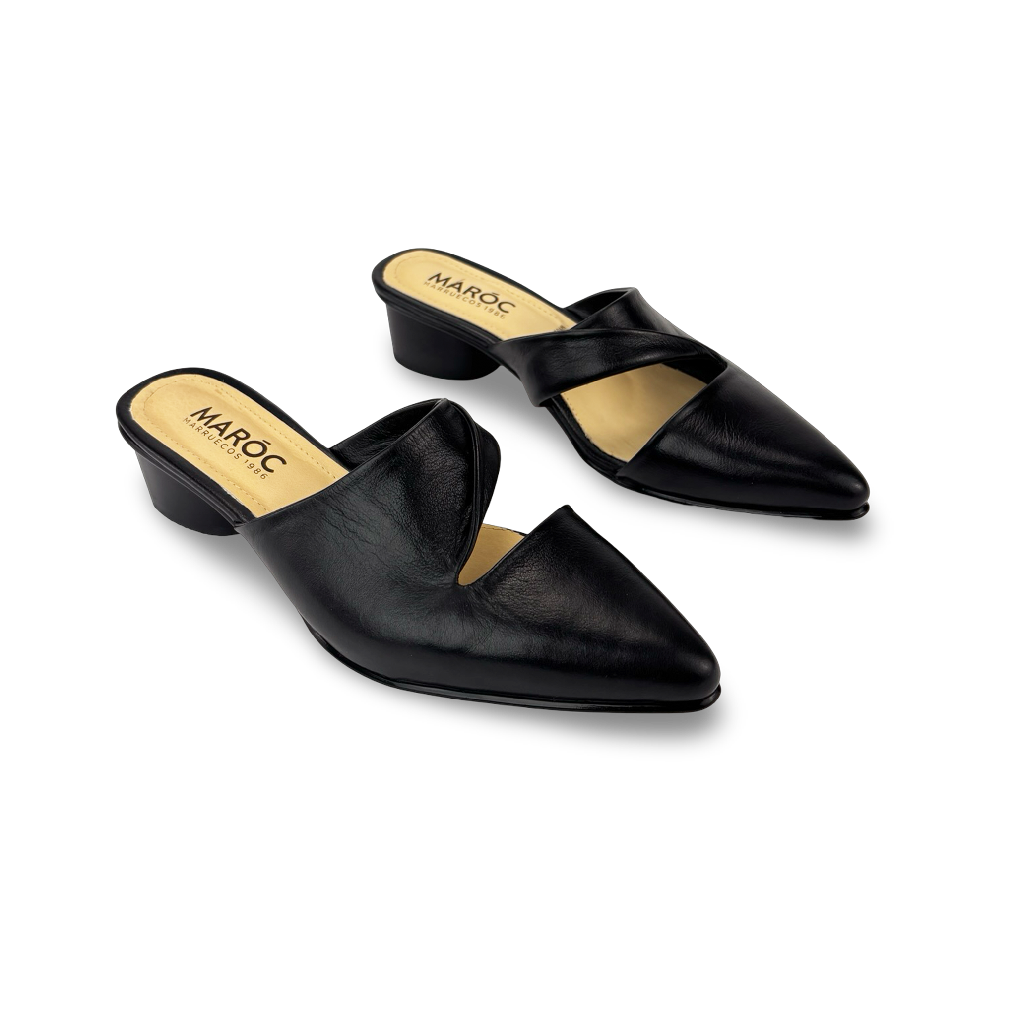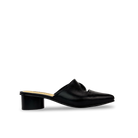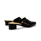 Zuecos con tacón para mujer en 100% cuero vacuno liso, con escote en V en la capellada y tacón de 3.5 cm forrado en cuero con textura amaderada. Diseño elegante de punta fina, fácil de calzar, ideal para combinar comodidad elegancia y estilo en cualquier ocasión.