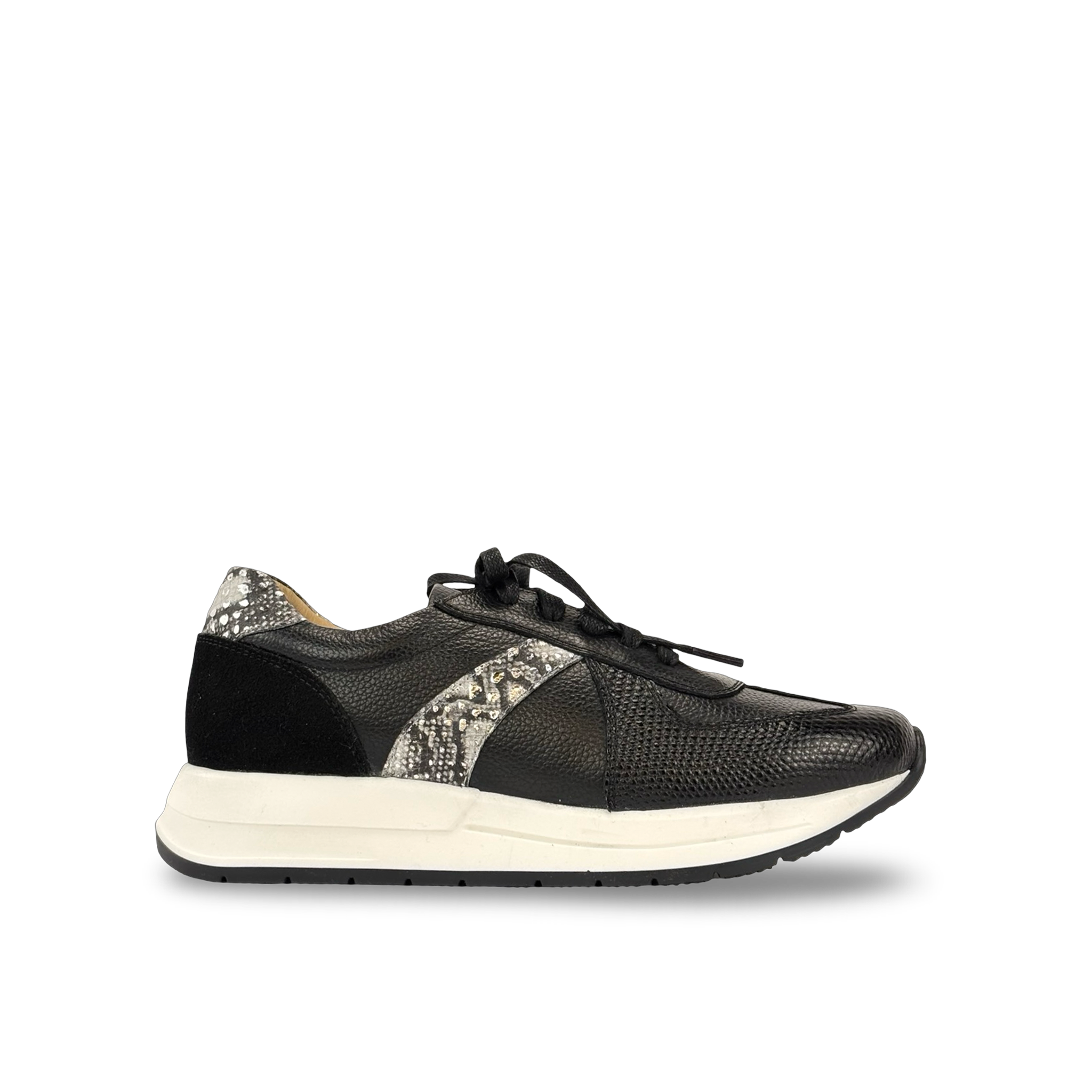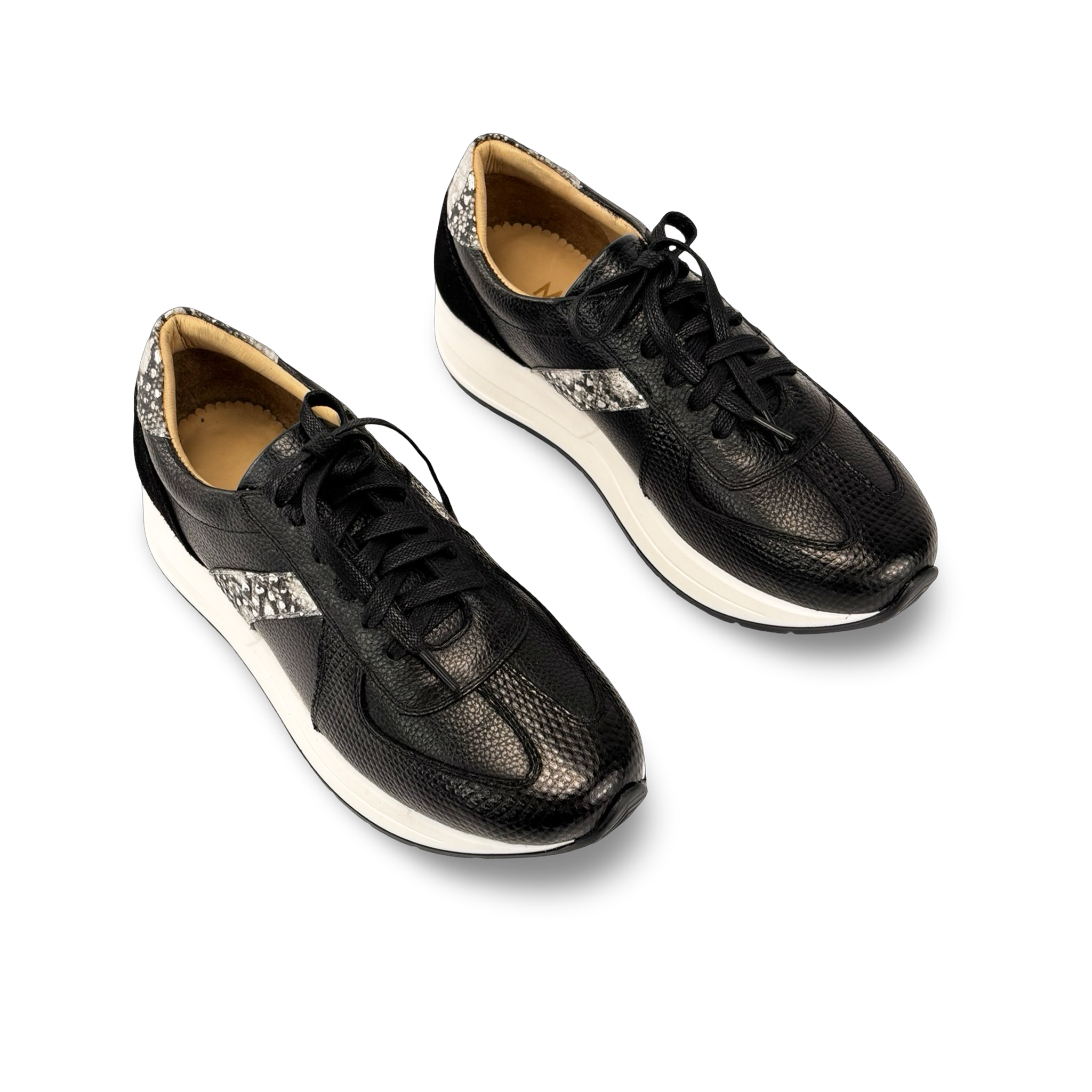 Tenis para mujer de estilo moderno y versátil, perfectos para un look casual con un toque semiformal. Elaborados en 100% cuero vacuno liso, grabado y metalizado, destacan por su mezcla de texturas y acabado brillante que eleva cualquier outfit. Su suela de caucho antideslizante de 3 cm brinda comodidad y estabilidad durante todo el día, mientras que el cordón encerado añade un detalle sofisticado. Dimensiones: Suela 3 cm de alto aproximadamente
