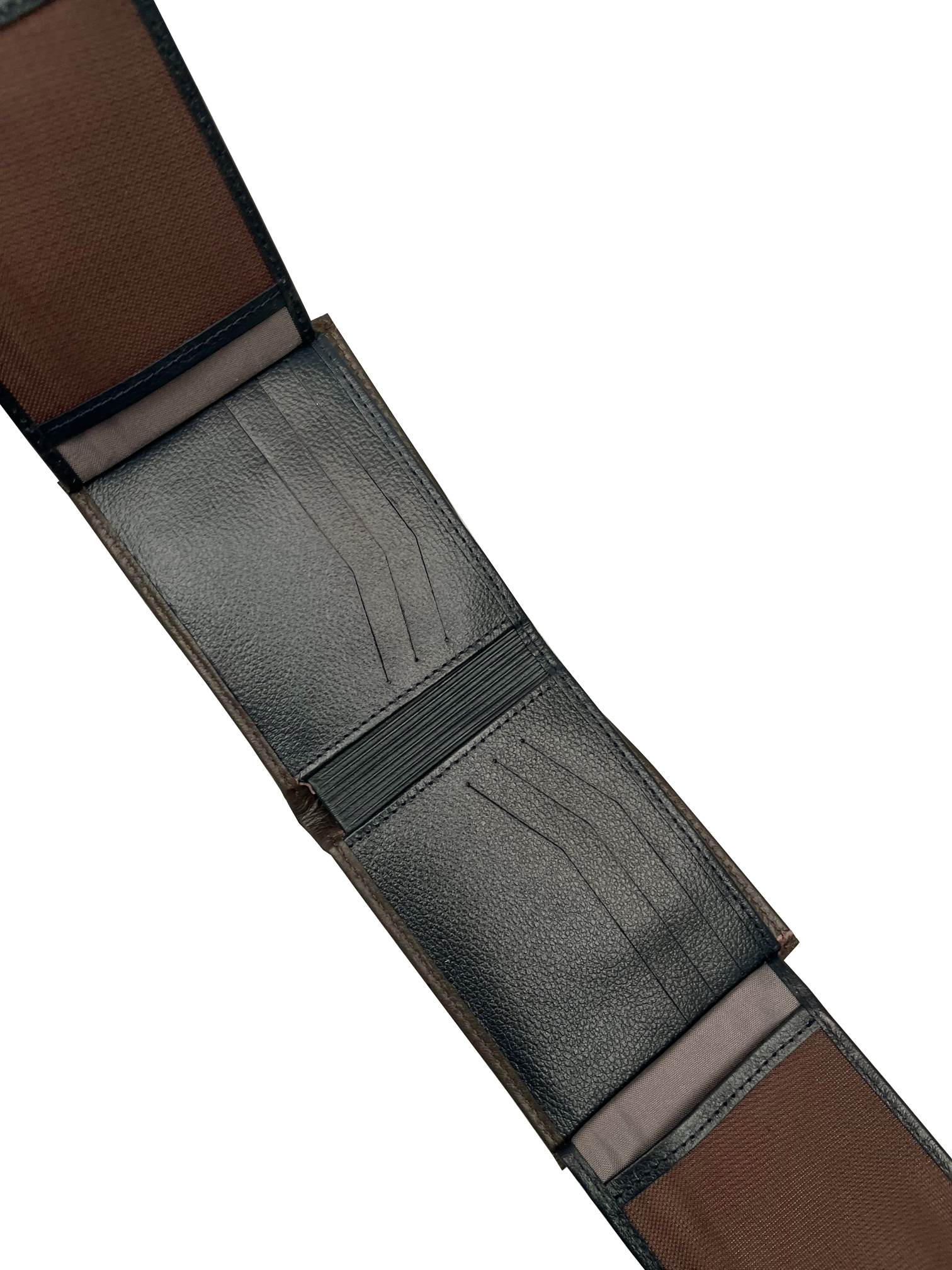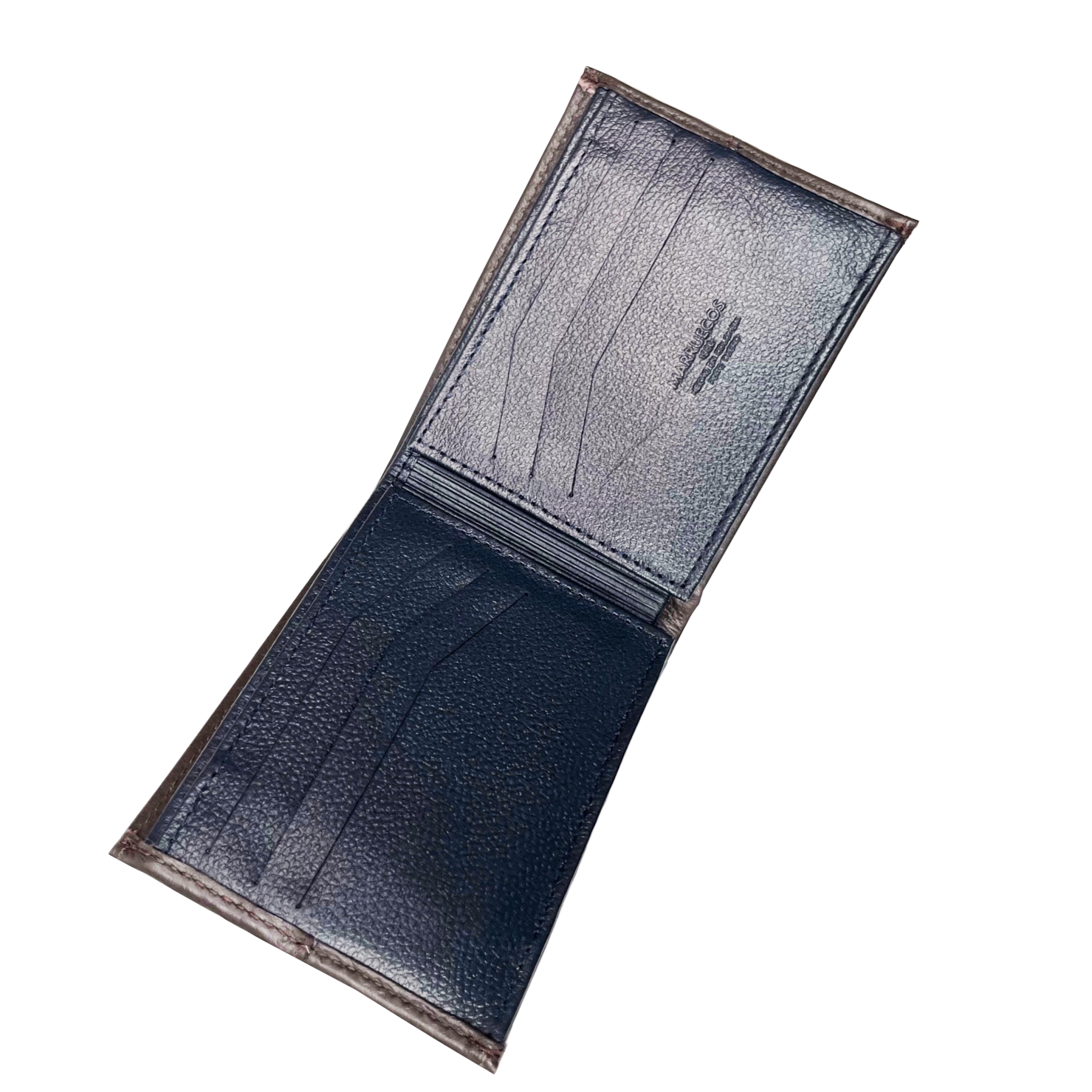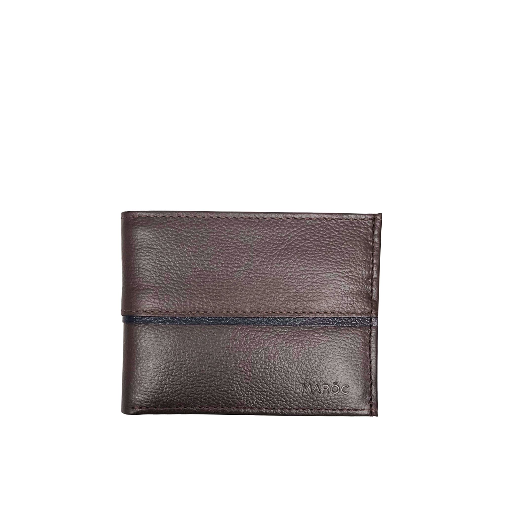 Men's wallet in cowhide leather; 4 bodies; bicolor; 12 card pockets; 2 compartments for document with photo or photo; double compartment for bills and two pockets in the double compartment; 2 multifunction internal compartments; contrasting leather color appliqué detail horizontally on the outside; Maroc Brand