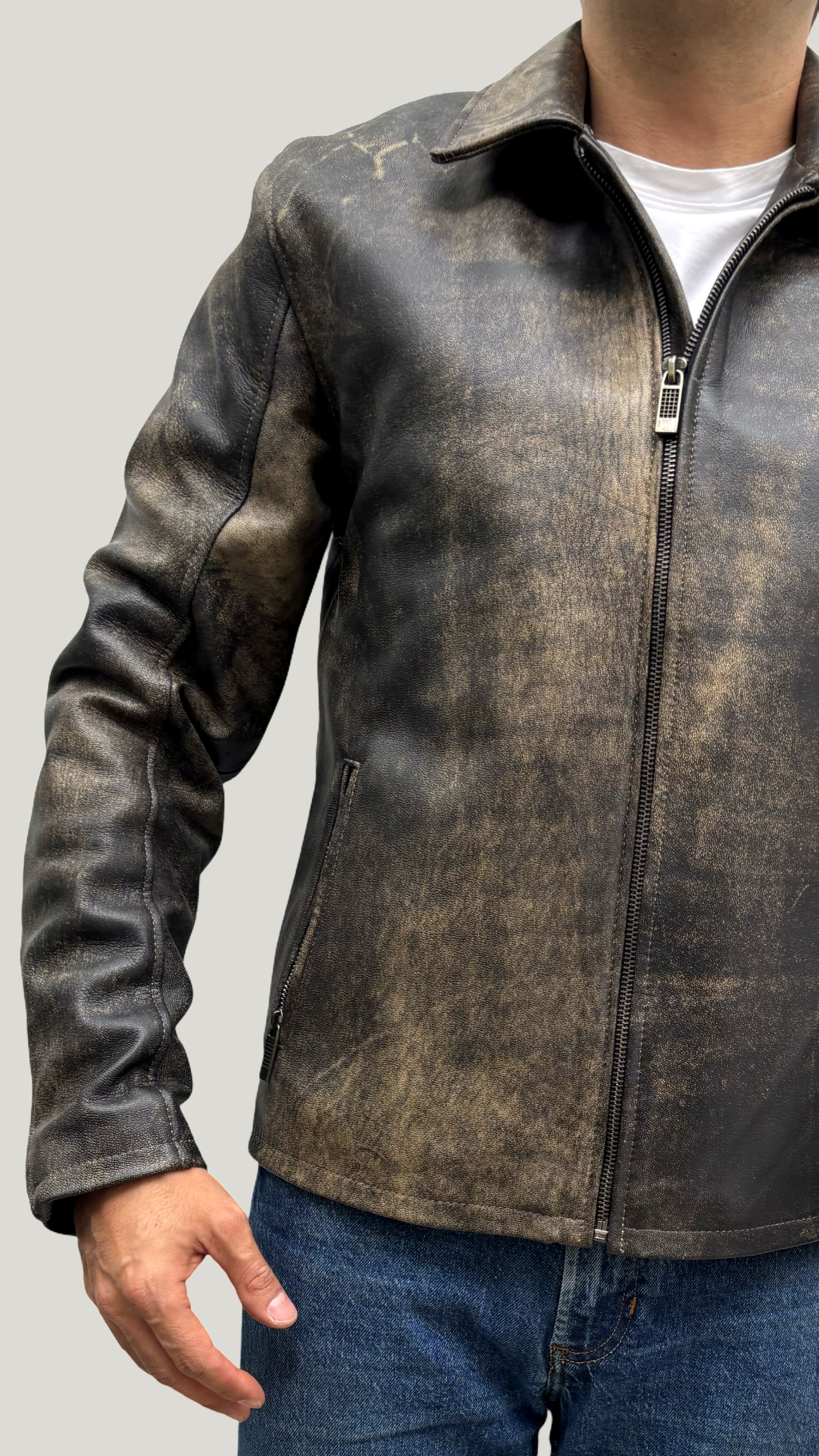 Confeccionada cuidadosamente en cuero vacuno de alta calidad, su apariencia desgastada aporta carácter y distinción. Cuenta con cierre frontal de cremallera metálica, bolsillos laterales funcionales con cierre, y un ajuste estructurado que resalta la silueta masculina sin sacrificar comodidad.