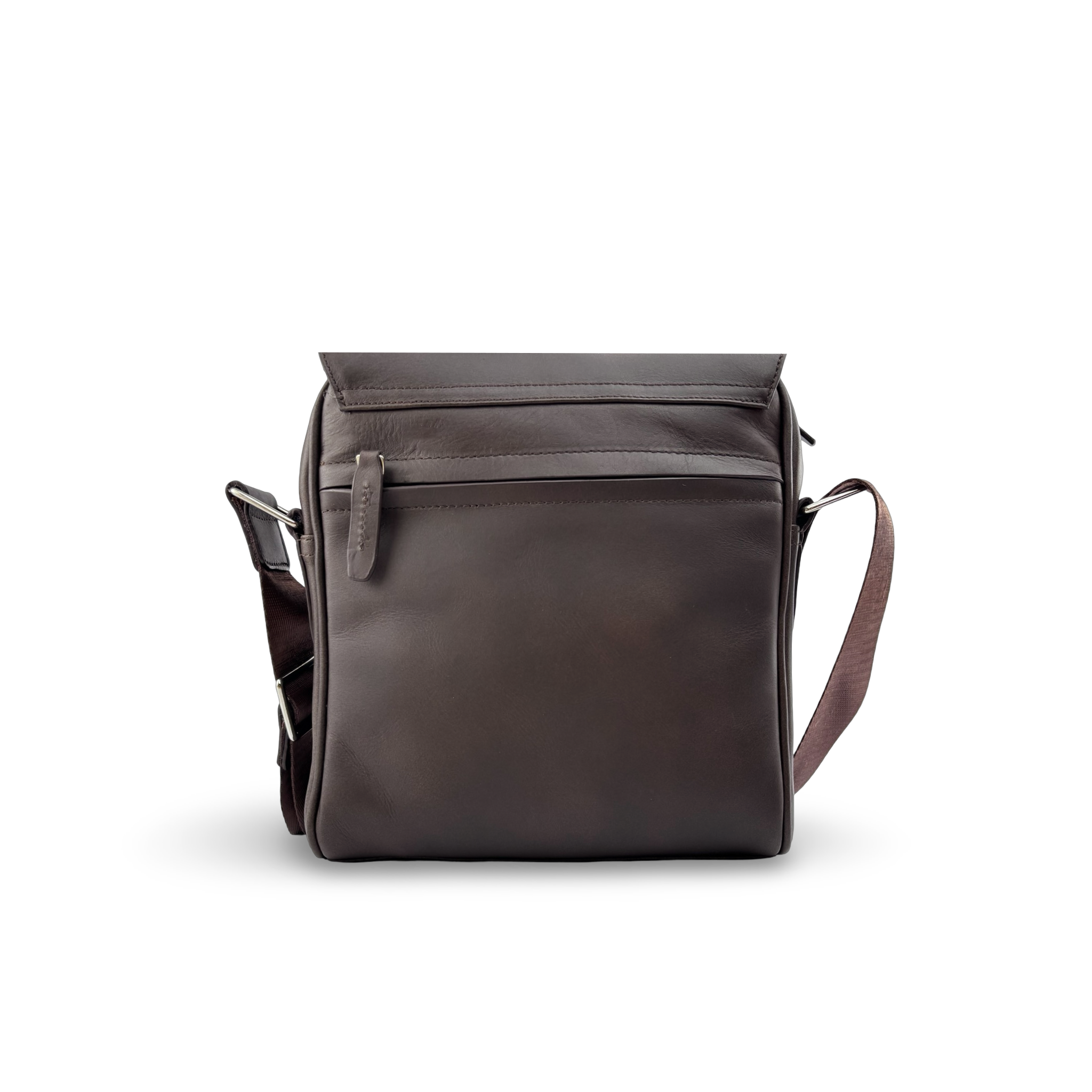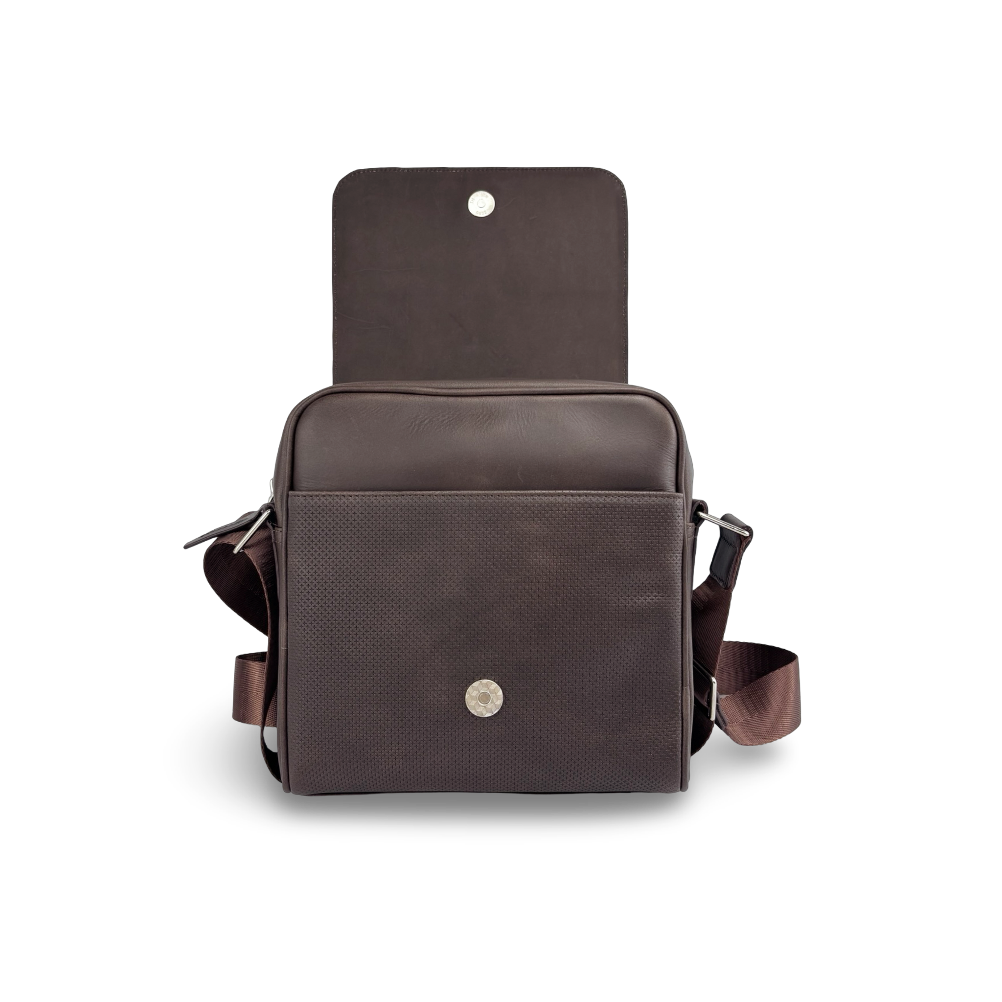 Un accesorio práctico y moderno, ideal para reemplazar los bolsos de pecho y llevar tus esenciales con más estilo. Cuenta con un compartimento principal amplio con tapa tipo solapa, bolsillo externo abierto, bolsillo interno con cierre, dos bolsillos internos adicionales y un espacio abierto ideal para el celular, además de porta esferos para mayor organización. Incluye bandolera ajustable para un uso cómodo. Fabricado en Colombia en cuero vacuno liso, con forro en poliéster y herrajes resistentes. Dimensiones aproximadas: Alto 20 cm x Ancho 20 cm x Fondo 4 cm.