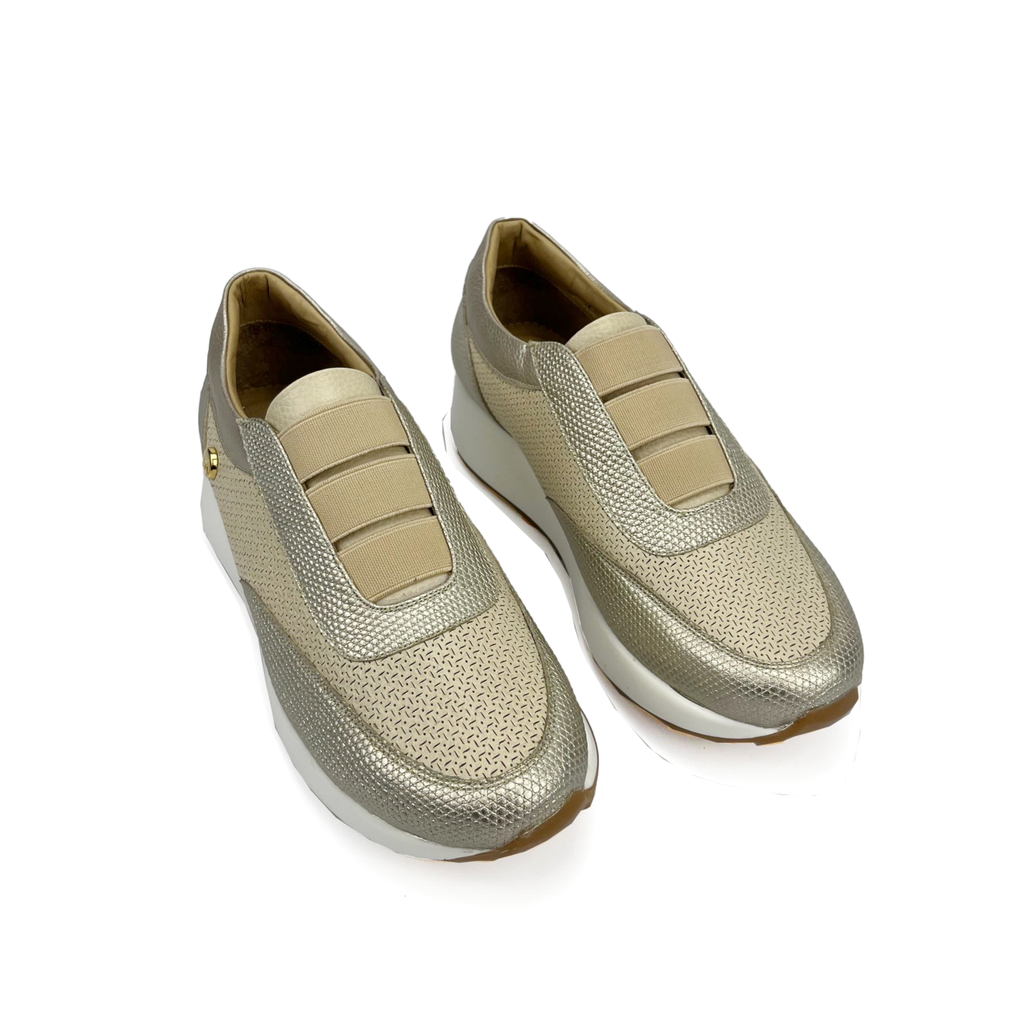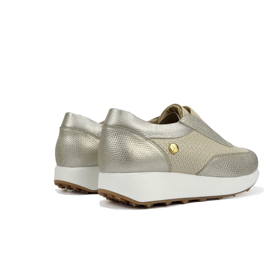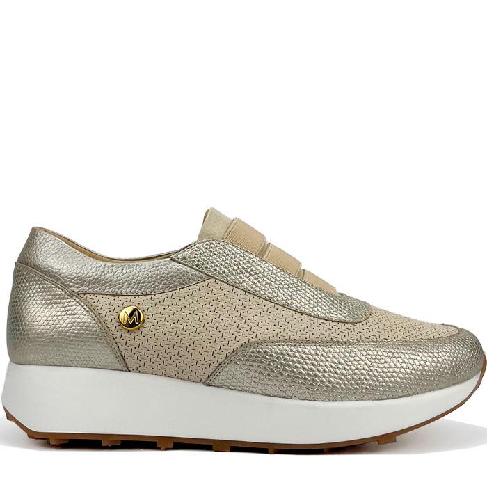 Women's tennis shoe without lace; made of leather; combination of textures; Finish: (metallic matte leather and die-cut with designs, engraved leather and metallic engraved leather); elastic instep for a better fit and easy placement; semi-sports sole with low platform and contrast color; metallic appliqué on the external side; Maróc brand