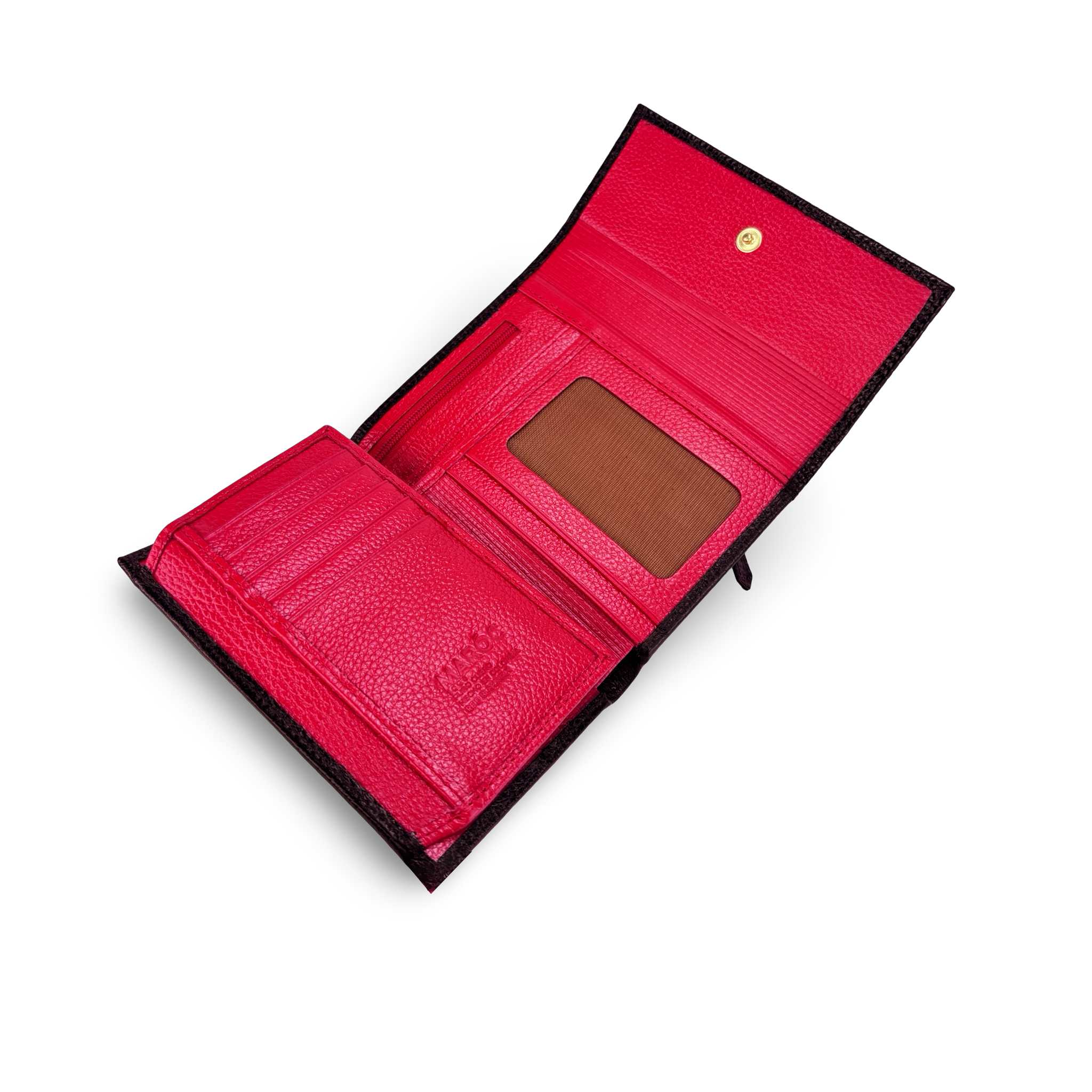 Billetera para mujer elaborada en 100% cuero vacuno liso y grabado, diseñada para ofrecer organización, seguridad y estilo. Cuenta con 16 compartimentos para tarjetas, doble fuelle para billetes, monedero interno y externo con cremallera, además de ventanas transparentes para fotos o documentos. Su cierre con botón a presión y el sistema RFID Blocker garantizan protección y practicidad en todo momento.