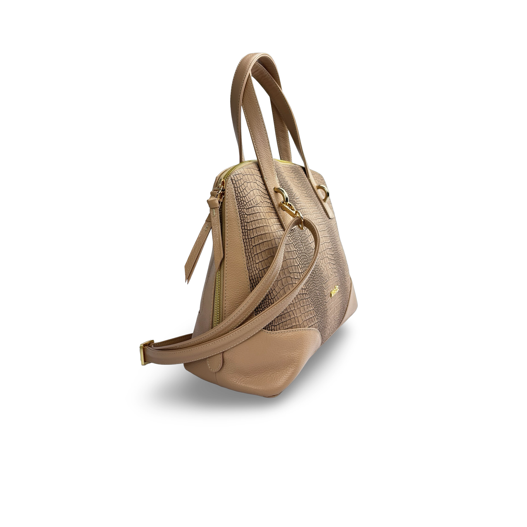 Bolso para mujer de estilo elegante, con aplique metálico del logo Maróc en la parte frontal. Su diseño práctico incluye un compartimento principal, bolsillo interno con cierre y bolsillo interno abierto para organizar tus esenciales. Cuenta con cierre de cremallera, portallaves con mosquetón y bandolera removible para mayor funcionalidad. Fabricado en Colombia en cuero vacuno grabado y liso, con forro en poliéster y herrajes resistentes.