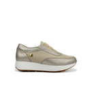 Women's tennis shoe without lace; made of leather; combination of textures; Finish: (metallic matte leather and die-cut with designs, engraved leather and metallic engraved leather); elastic instep for a better fit and easy placement; semi-sports sole with low platform and contrast color; metallic appliqué on the external side; Maróc brand