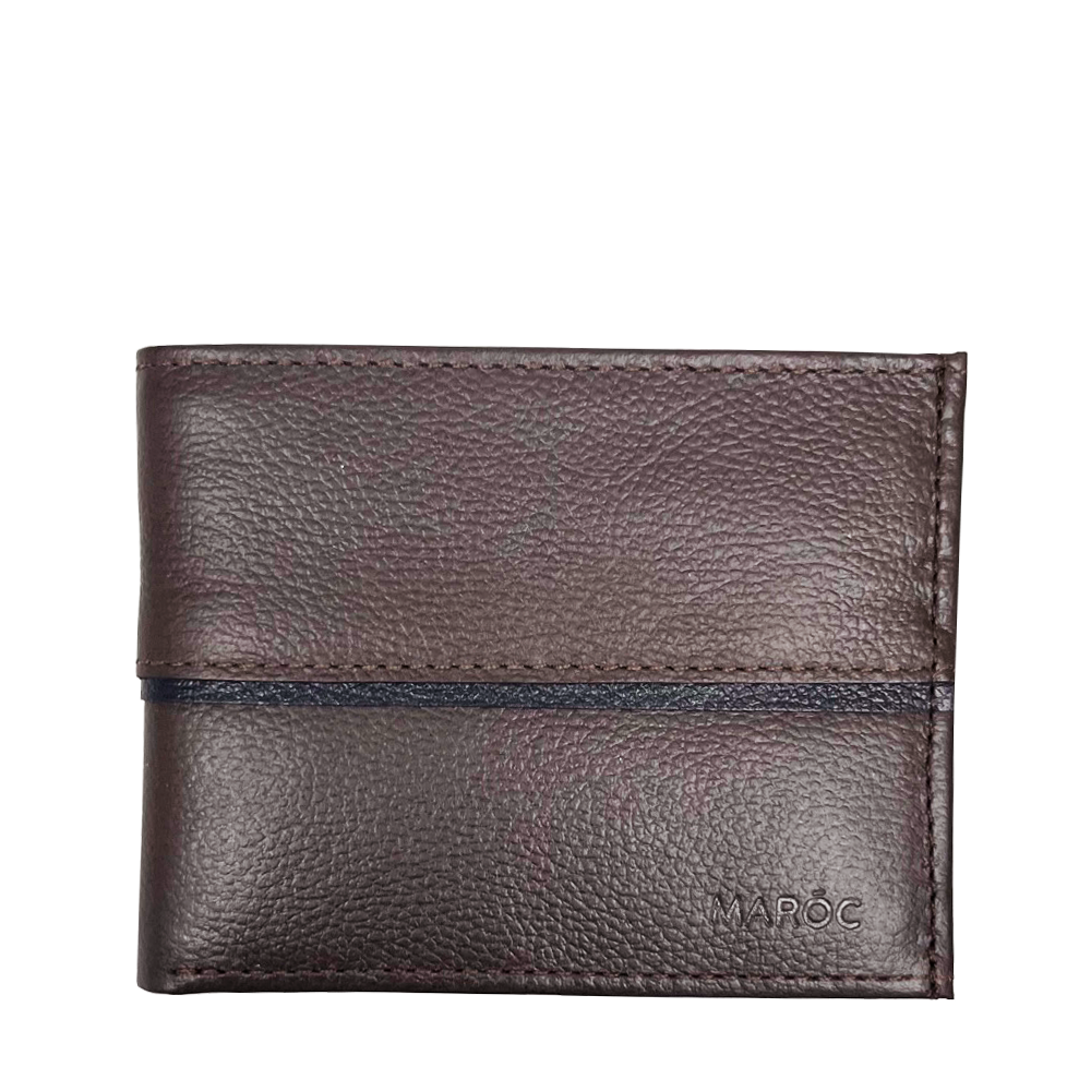 Men's wallet in cowhide leather; 4 bodies; bicolor; 12 card pockets; 2 compartments for document with photo or photo; double compartment for bills and two pockets in the double compartment; 2 multifunction internal compartments; contrasting leather color appliqué detail horizontally on the outside; Maroc Brand