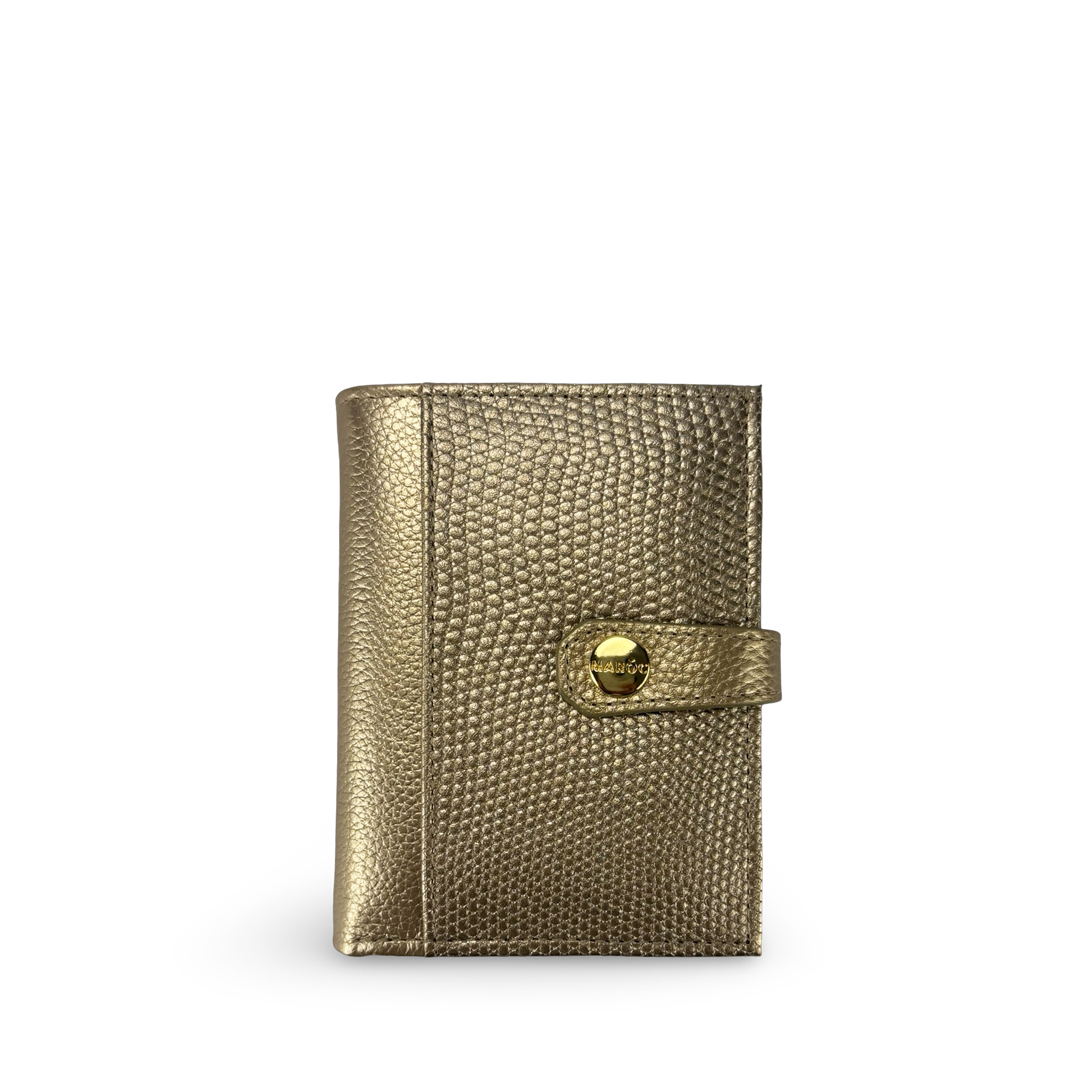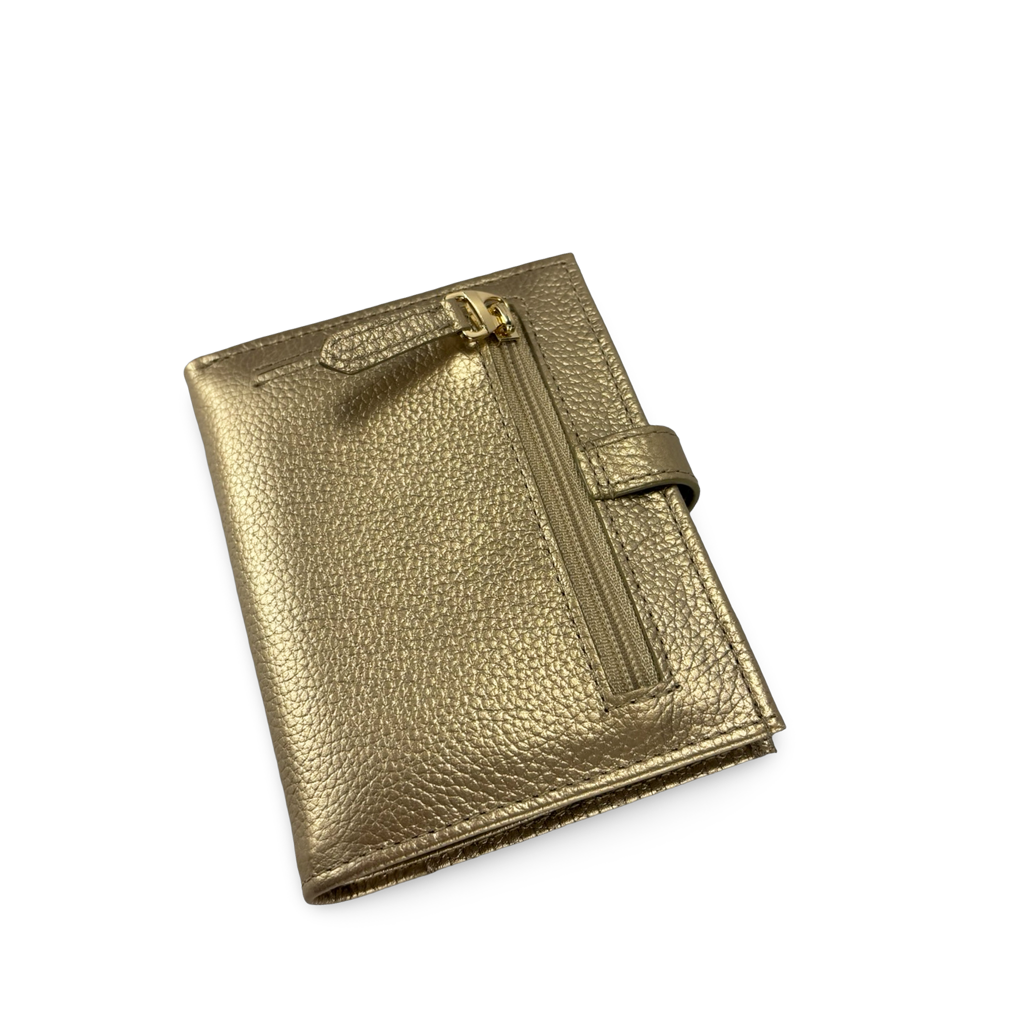La parte externa presenta un acabado uniforme con broche de presión metálico dorado grabado con el logotipo de la marca, y en la parte trasera incluye un bolsillo con cremallera ideal para guardar monedas u objetos pequeños de manera segura.
