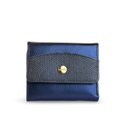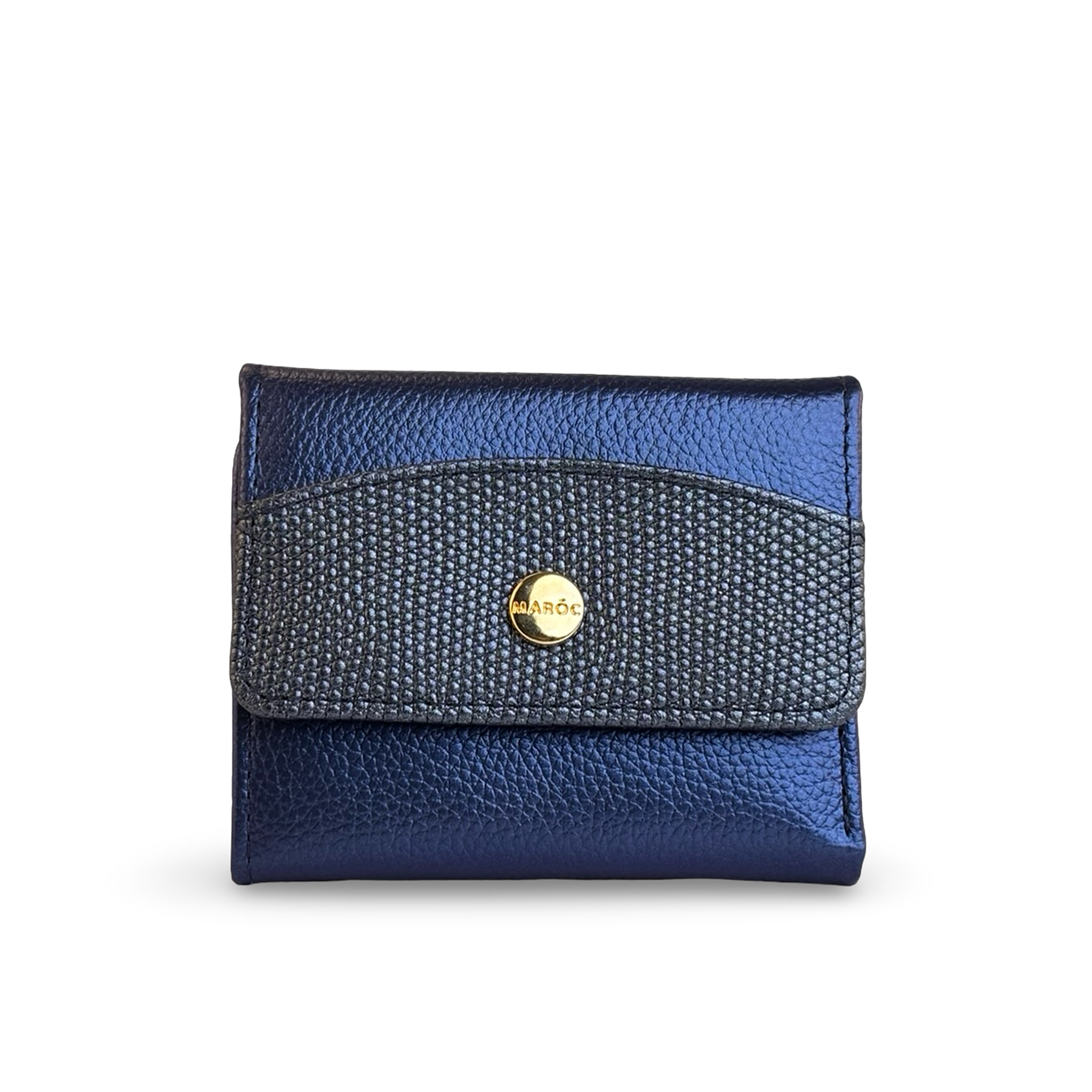 - Tipo: Billetera para mujer Bicolor azul y oro con Broche en aplique dorado metálico en la parte frontal logo marca Maroc