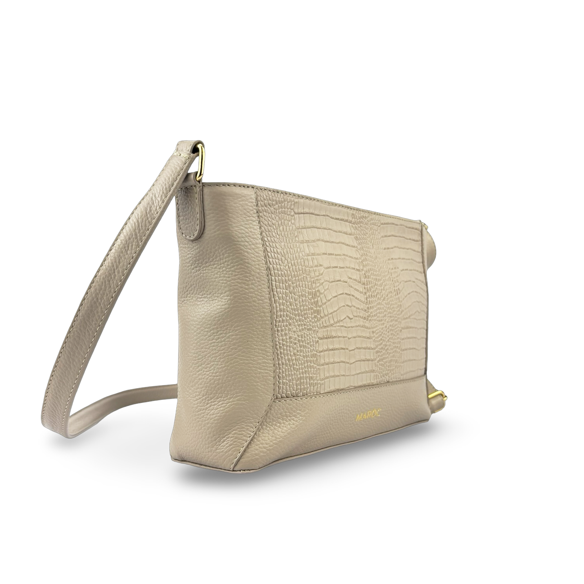 El bolso manos libres para mujer Maroc combina elegancia, practicidad y diseño artesanal colombiano. Confeccionado en 100% cuero vacuno grabado, destaca por su textura sofisticada y su aplique dorado con el logo de la marca en la parte frontal. Su diseño compacto ofrece un amplio compartimento principal, bolsillos internos funcionales para organizar tus esenciales y un bolsillo posterior con cremallera para mayor seguridad. Incluye correa graduable para llevarlo cruzado o al hombro, brindando comodidad y estilo en cualquier ocasión. Perfecto para quienes buscan un accesorio versátil, moderno y duradero.