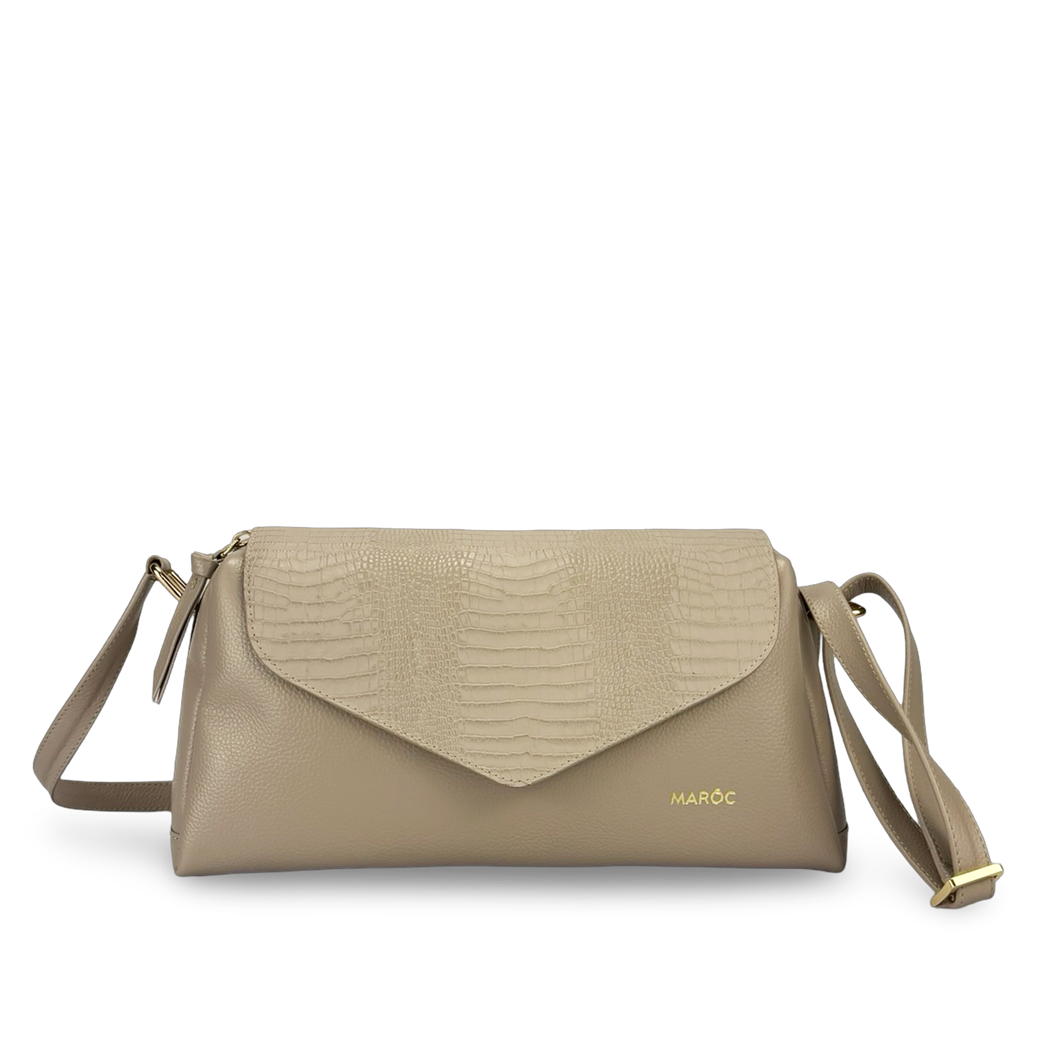 - Tipo: Bolso manos libres con solapa estructurada y logo dorado marca Maroc en la parte frontal del bolso