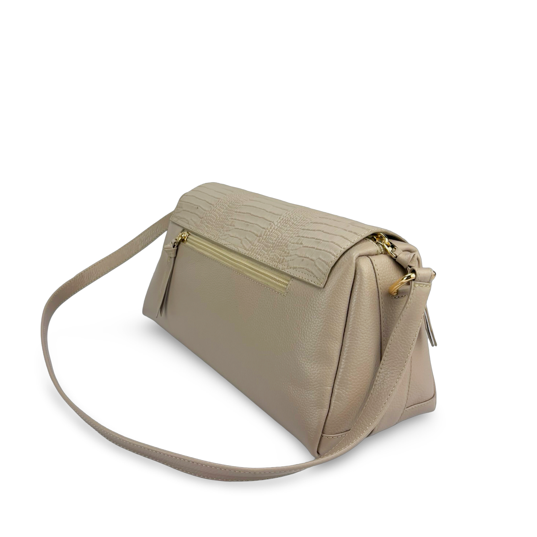 Bolso manos libres para mujer con diseño estructurado y solapa de facíl acceso, ideal para acompañar tus looks del día a la noche. Elaborado en cuero vacuno grabado y liso, combina textura y sofisticación con un aplique metálico dorado del logo Maroc en la parte frontal. Su diseño funcional incluye compartimento principal amplio, bolsillo interno con cremallera, bolsillo abierto y un bolsillo externo posterior para mantener todo en orden. Dimensiones Aproximadas: Alto 23.5 cm x Ancho 30 cm x Fondo 12 cm