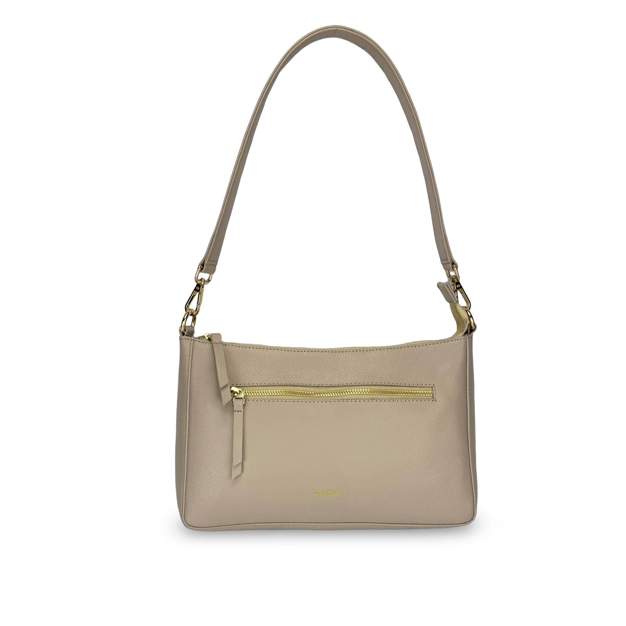 Bolso para mujer tipo cartera convertible en manos libres, confeccionado en cuero vacuno liso natural. Diseño minimalista y funcional, ideal para el día a día.
