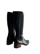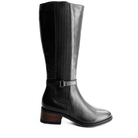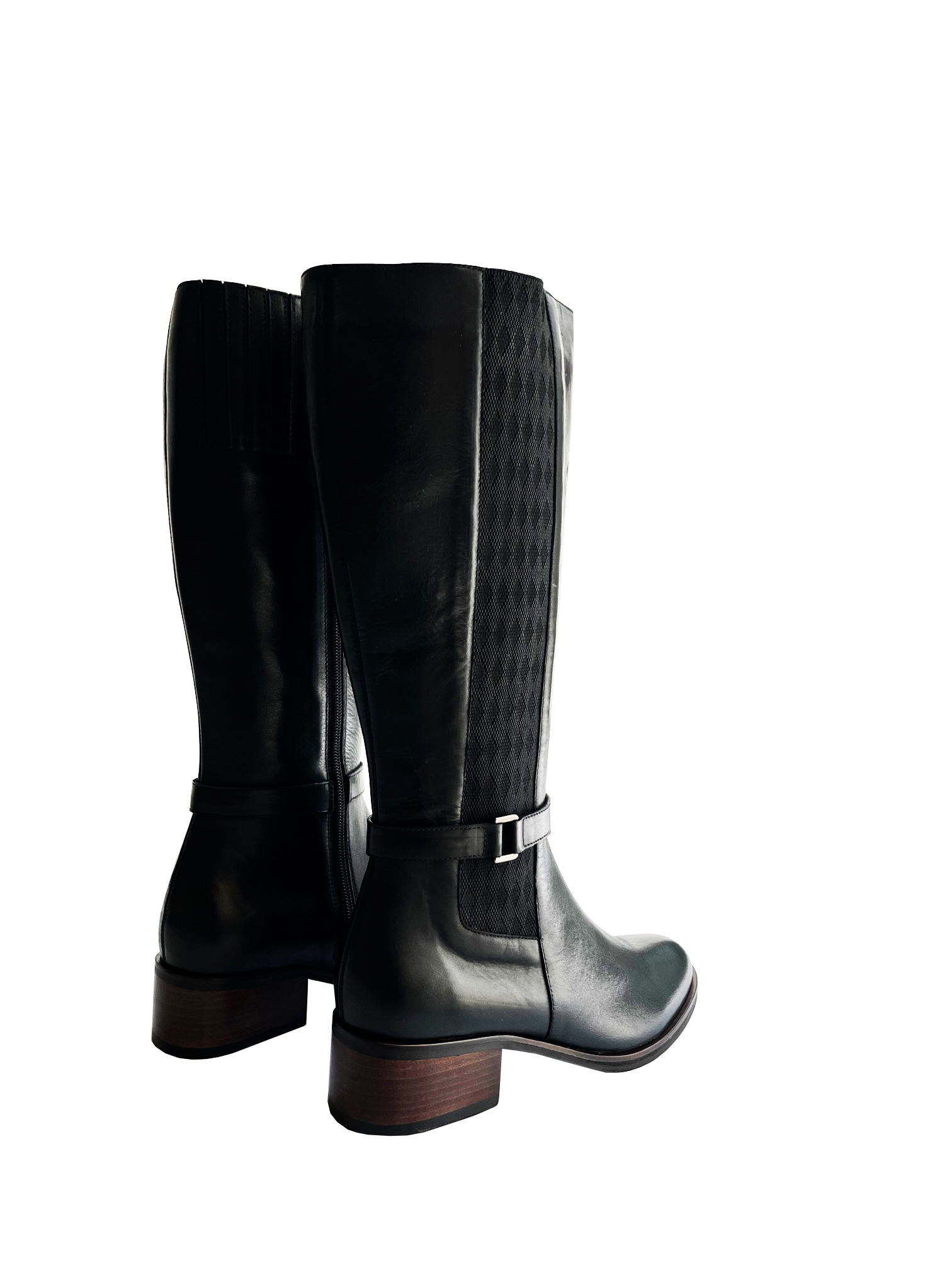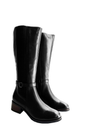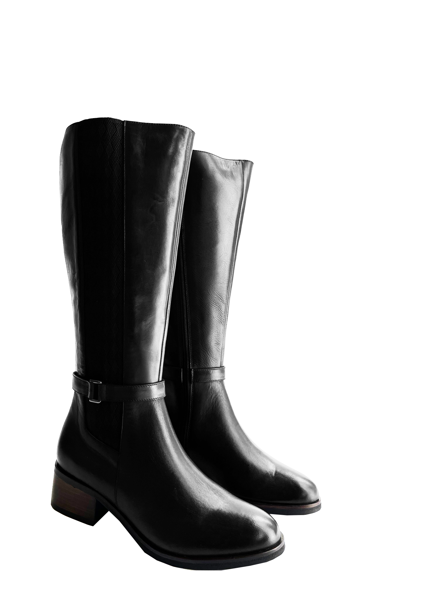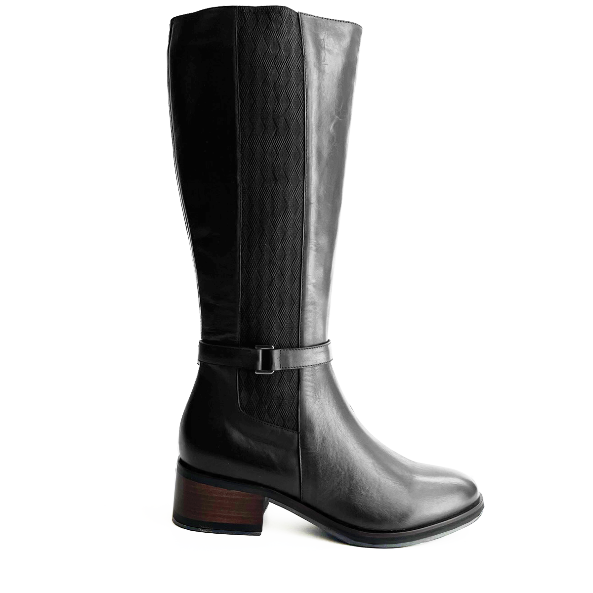 Natura Women's Long Boot; made of cowhide leather; with medium heel, semi-pointed; smooth leather finish; details (subtle strap with hardware on the lower part of the shaft and elastic with texture and design on the external side); zipper closure on the inside