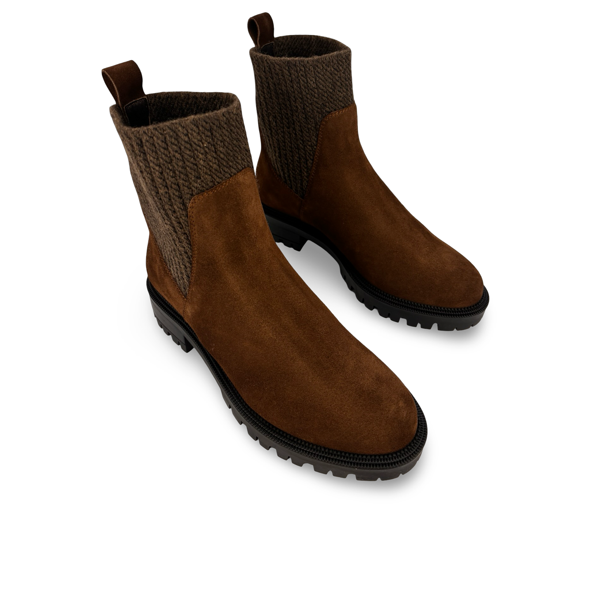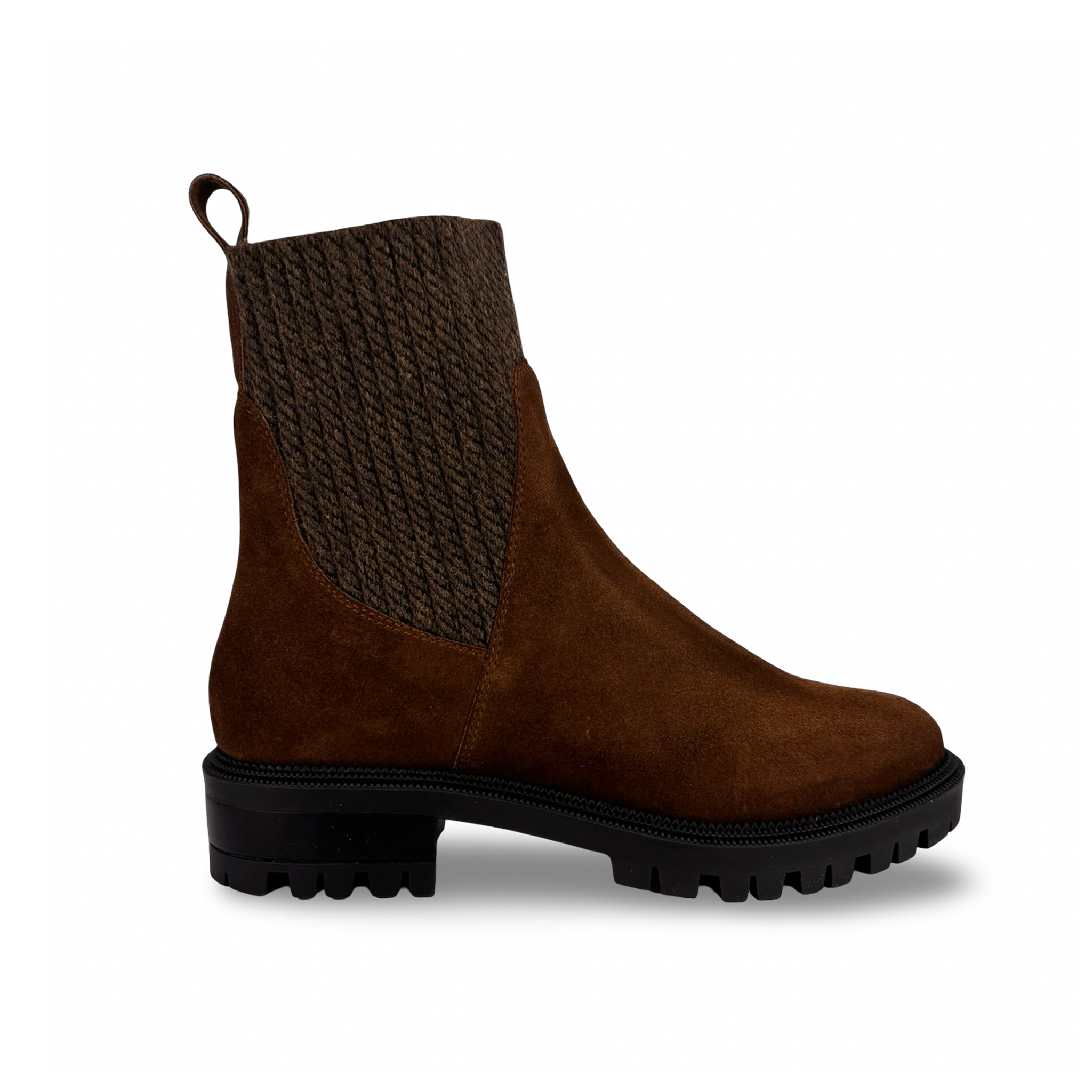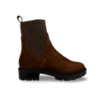 Botín para mujer tipo tobillo elaborado en 100% cuero vacuno gamuza, con diseño slip-on y paneles elásticos laterales que brindan un ajuste cómodo y práctico.