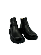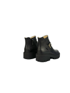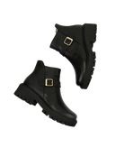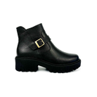 Women's ankle boot with heel, made of cowhide leather; natural smooth finish; square toe; with buckle on the external side; internal zipper; high square heel