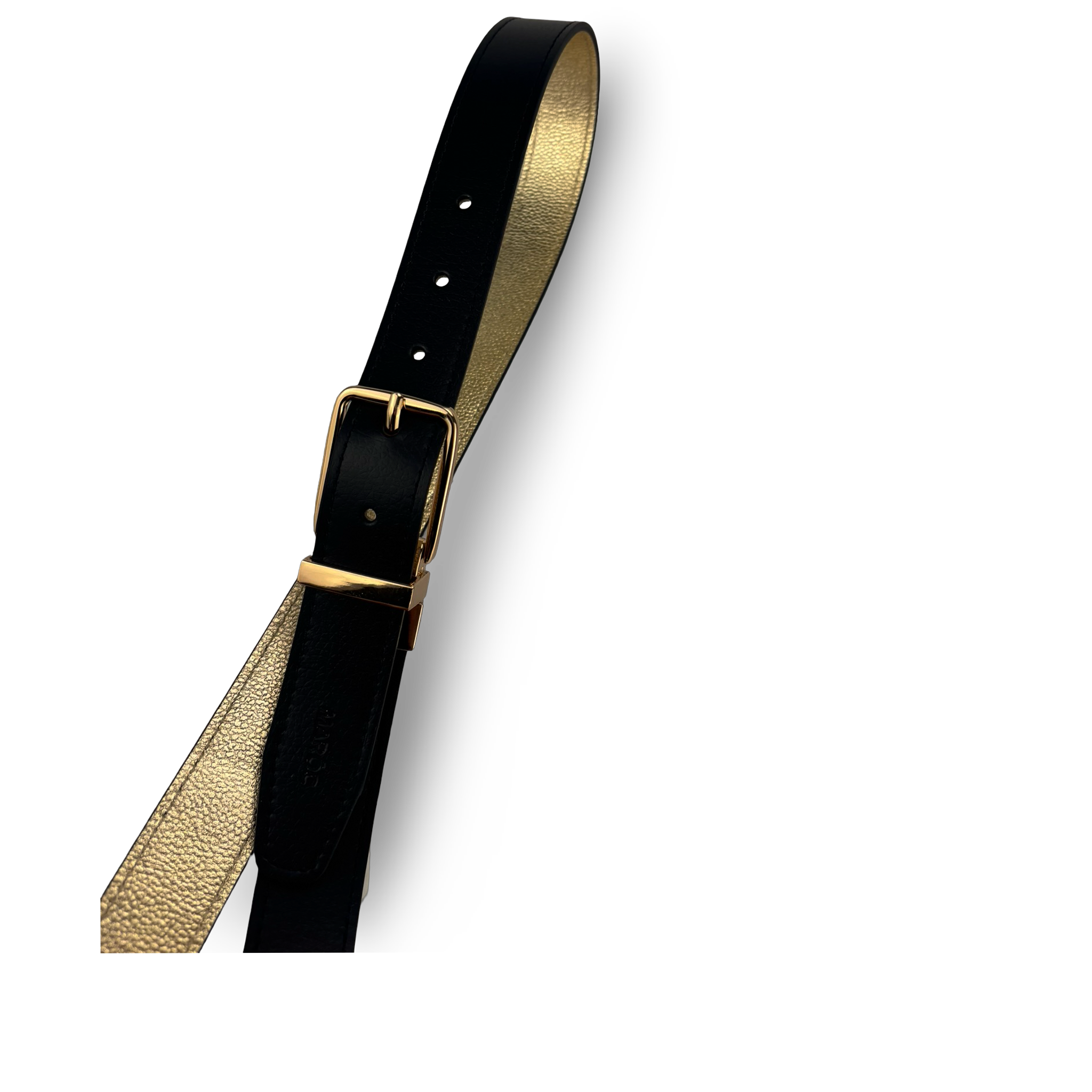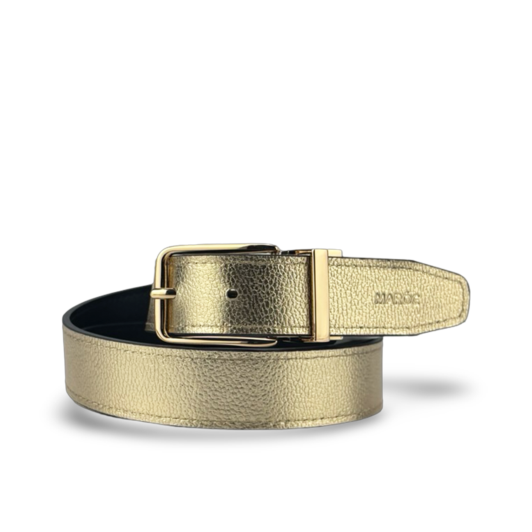 Dos estilos en una sola pieza. Este cinturón de mujer doble faz en 100% cuero vacuno liso es la elección perfecta para quienes buscan versatilidad y sofisticación en su día a día. Diseñado por Maroc 1986, marca colombiana reconocida por su calidad y elegancia, este accesorio cuenta con una hebilla metálica dorada reversible que permite usarlo por ambos lados, adaptándose fácilmente a distintos looks.