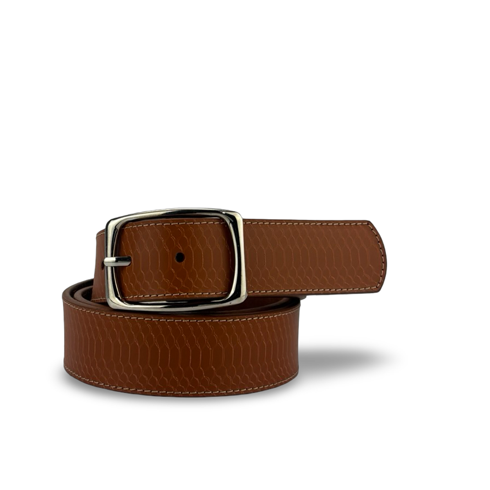 Cinturón para mujer de estilo elegante, confeccionado en 100% cuero vacuno grabado, que combina sofisticación y versatilidad. Su diseño incluye una hebilla metálica con perforaciones para un ajuste personalizado y cómodo. Perfecto para complementar cualquier look con un toque refinado. Dimensiones aproximadas: Ancho 2.5 cm.