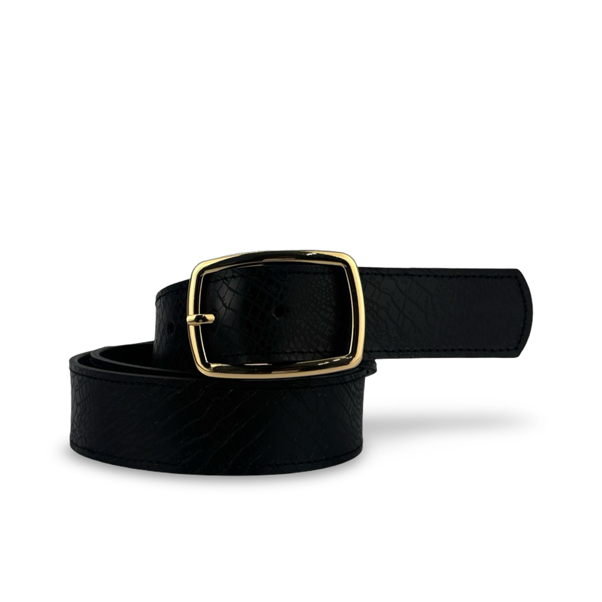 Cinturón para mujer de estilo elegante, confeccionado en 100% cuero vacuno grabado, que combina sofisticación y versatilidad. Su diseño incluye una hebilla metálica con perforaciones para un ajuste personalizado y cómodo. Perfecto para complementar cualquier look con un toque refinado. Dimensiones aproximadas: Ancho 2.5 cm.