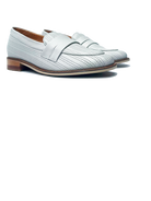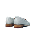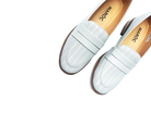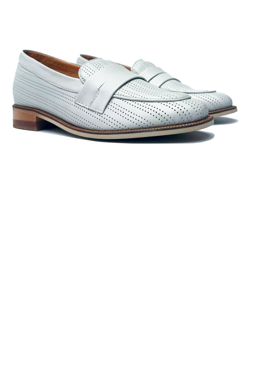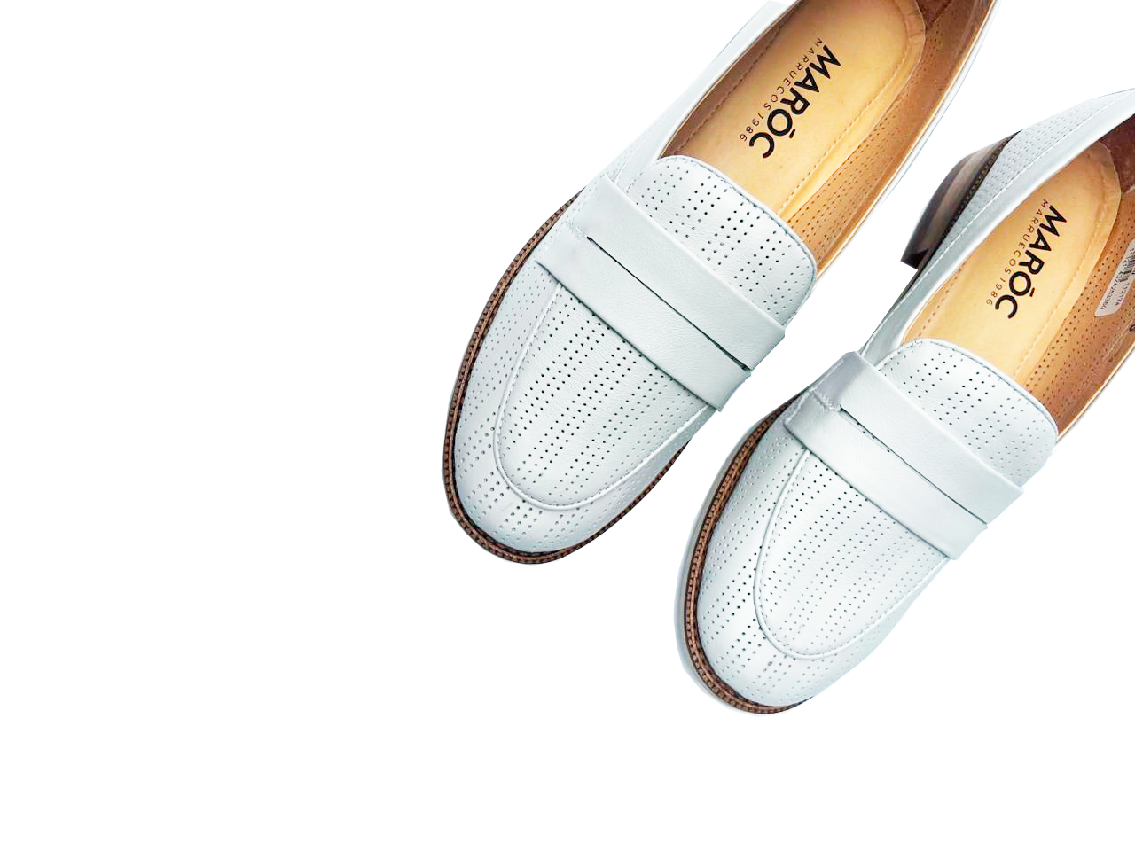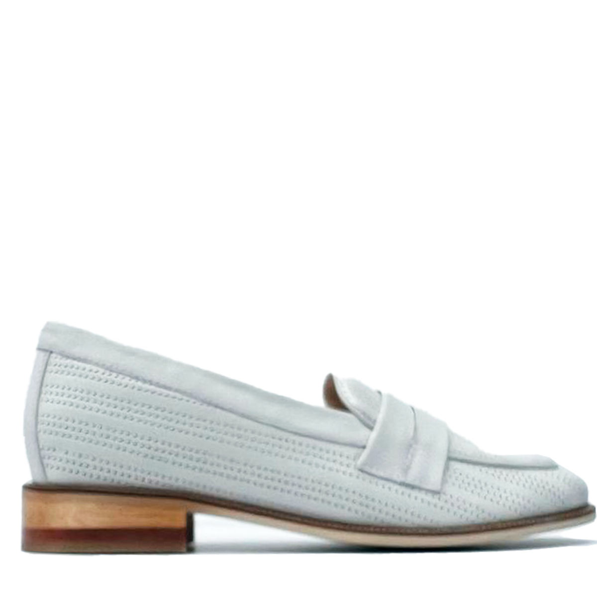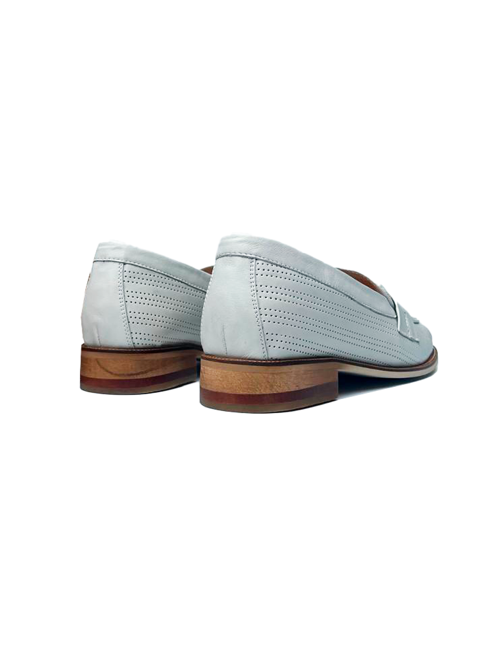 Casual/informal Women's Shoe; moccasin type; made of cowhide leather; combination of textures (die-cut smooth leather finish and natural smooth leather); closed; with low heel; double smooth leather loop on the instep; Maróc brand