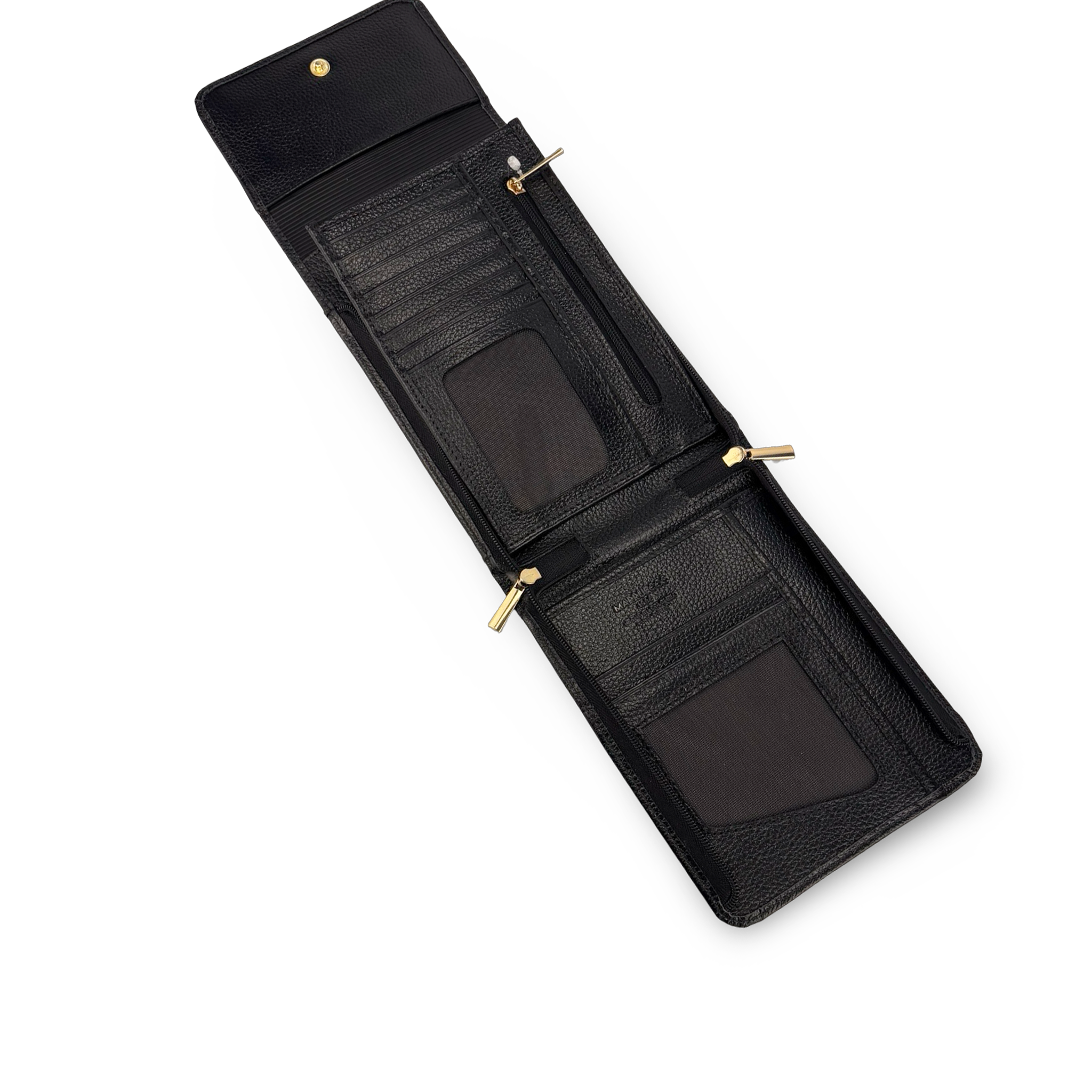 • Compartimentos: Un compartimento principal, doce compartimentos para guardar tarjetas y documentos, un bolsillo con cierre de cremallera para guardar billetes
