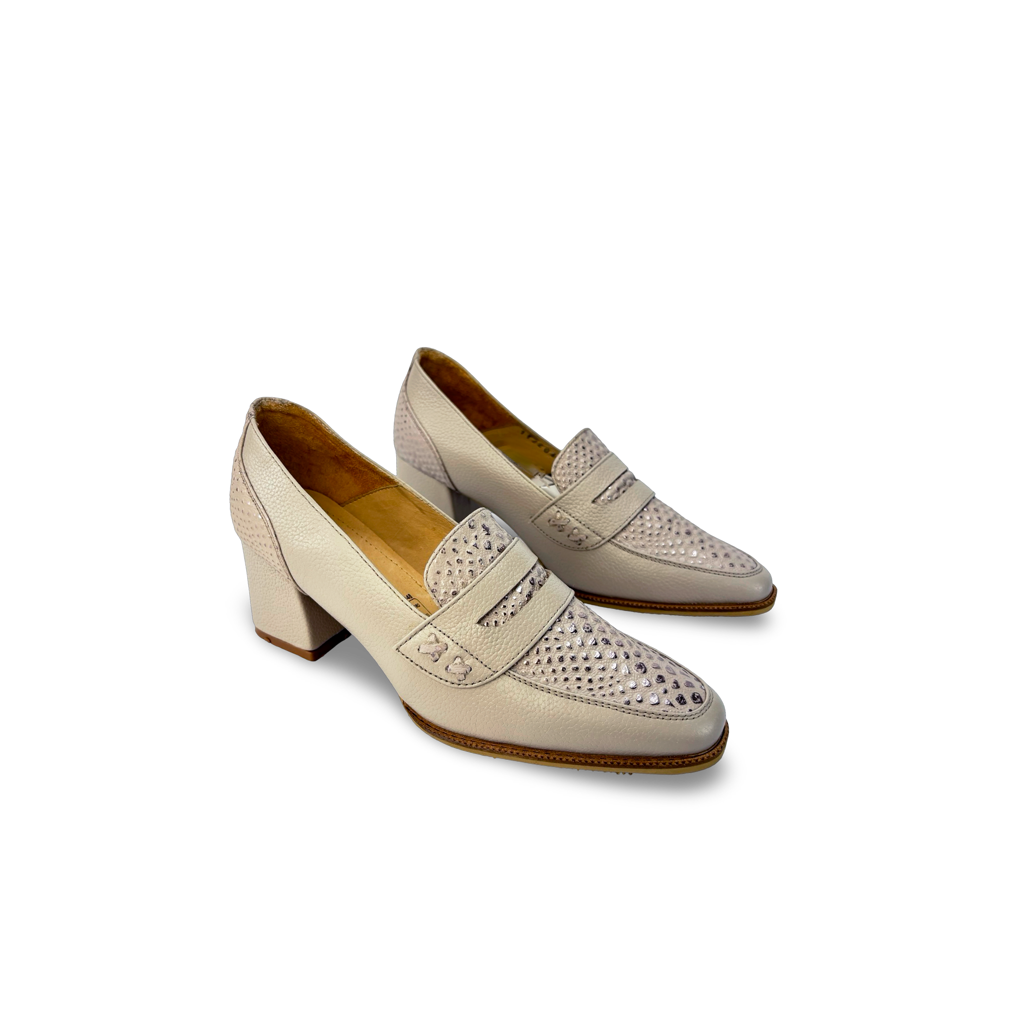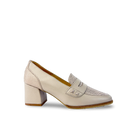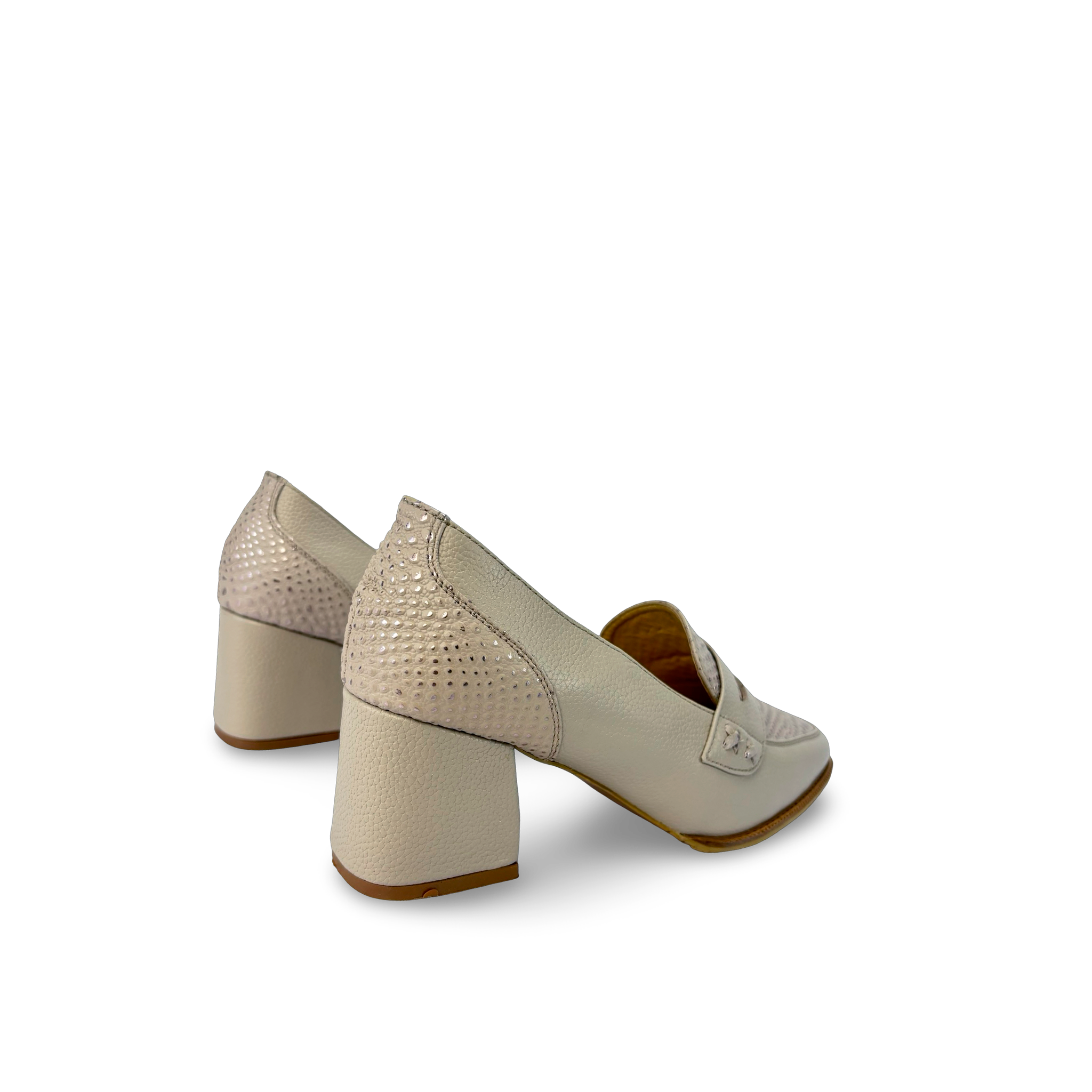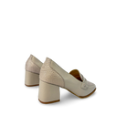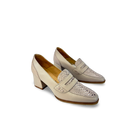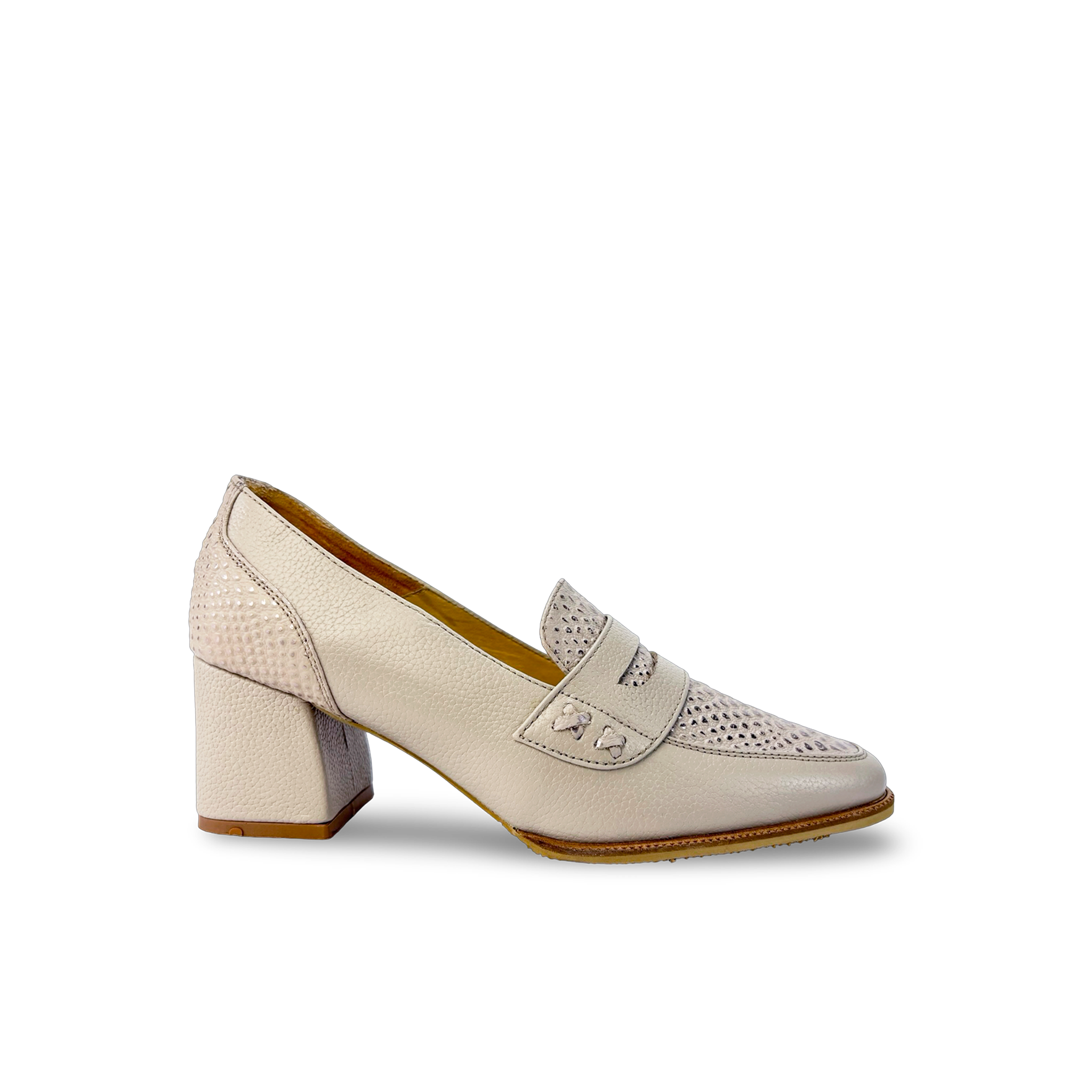 Tacón estilo mocasín para mujer elaborado en cuero vacuno liso y grabado, con antifaz decorativo en el empeine que realza su diseño clásico y sofisticado.